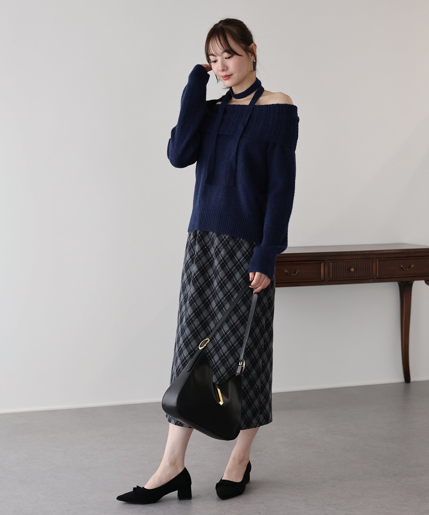セットのタイでトレンド感を演出し、オフショルデザインで女性らしさをプラス。