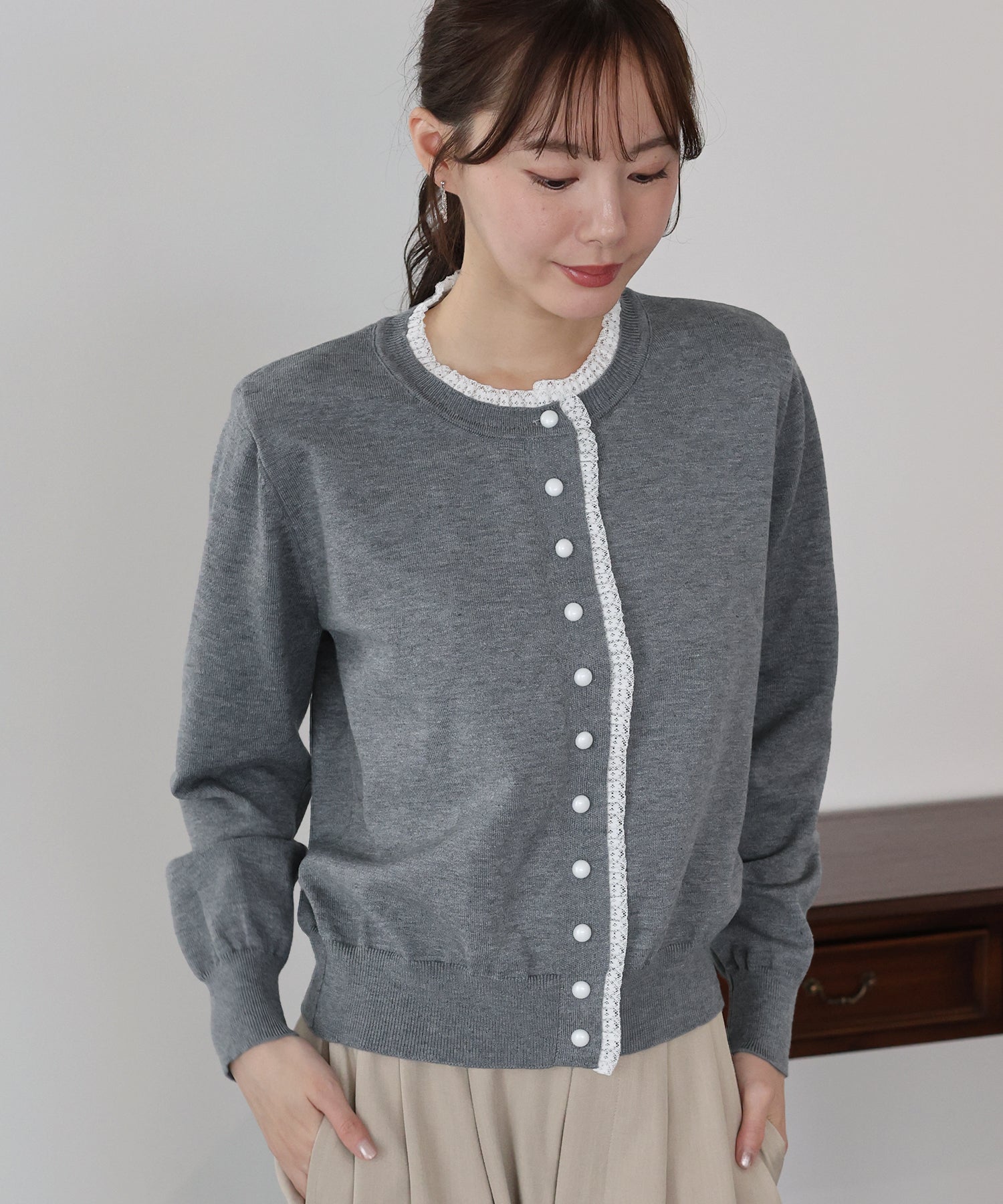 ネックと前立てにあしらったレースが大人かわいい魅力のニットカーディガン。