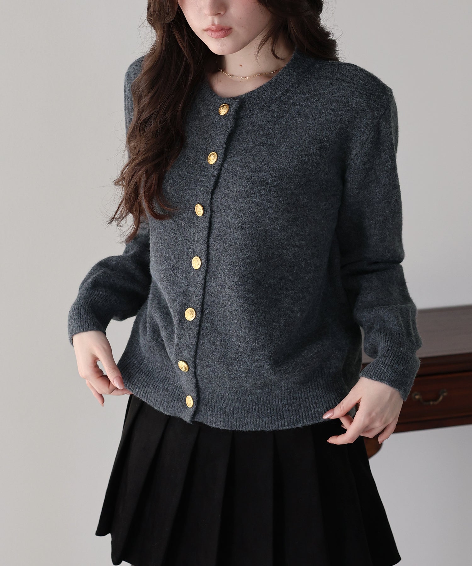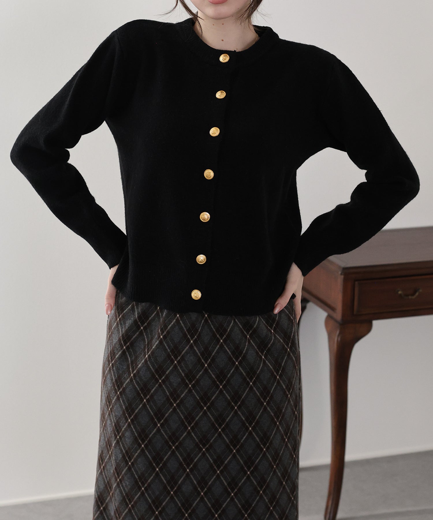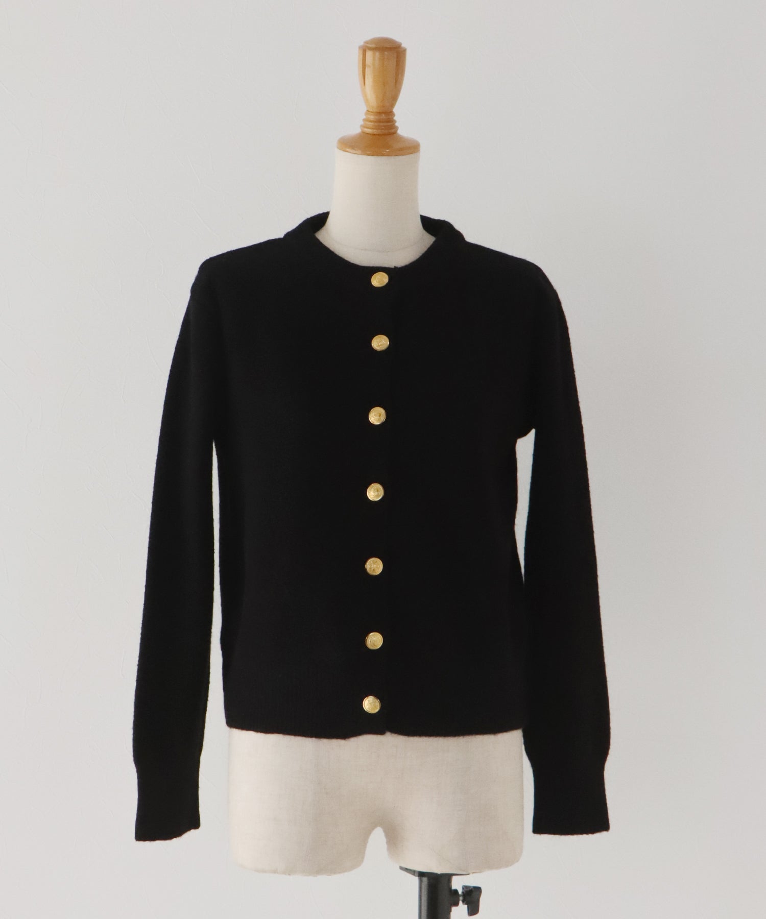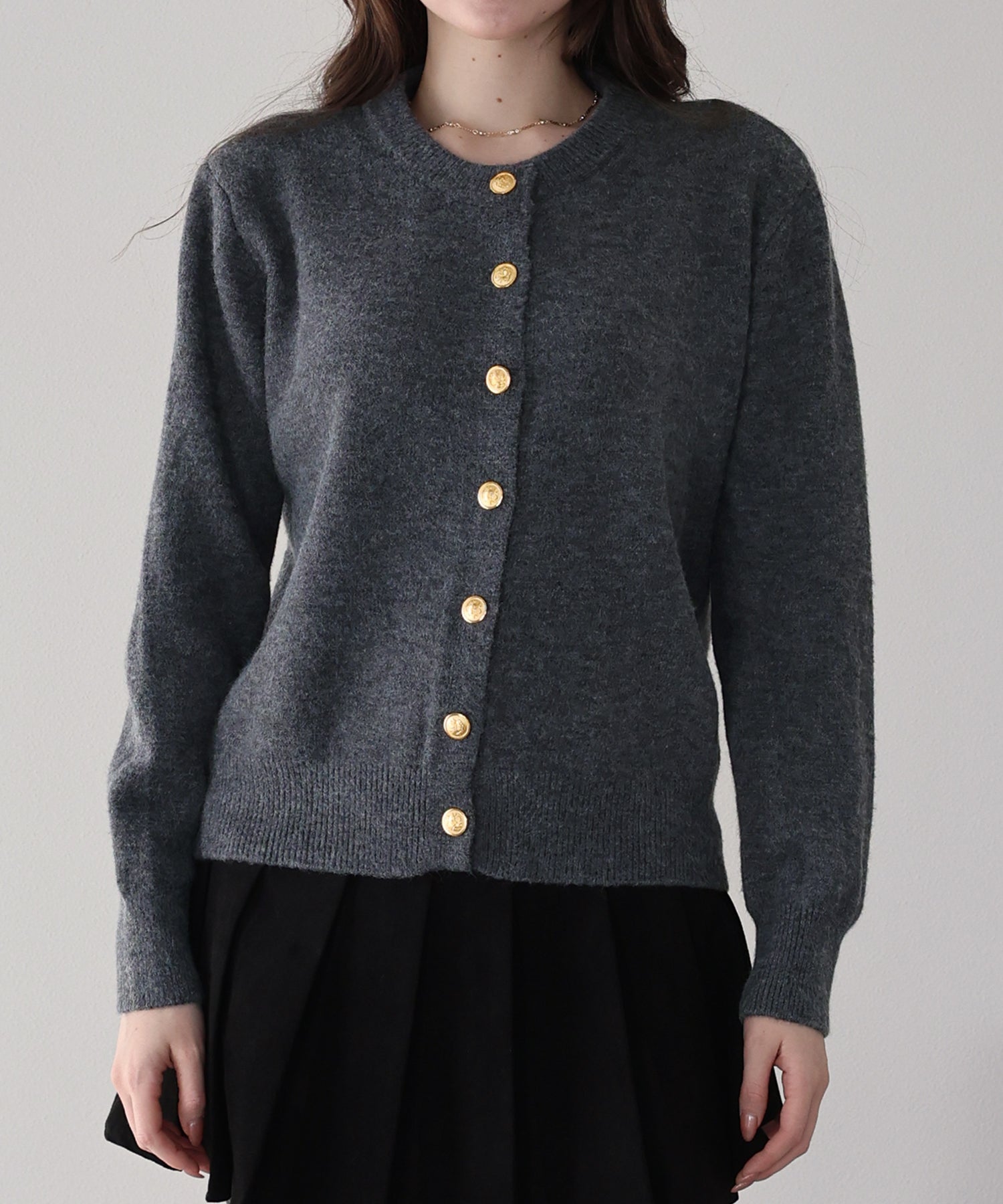 上品な金釦がアクセントになったクルーネックニットカーディガン。