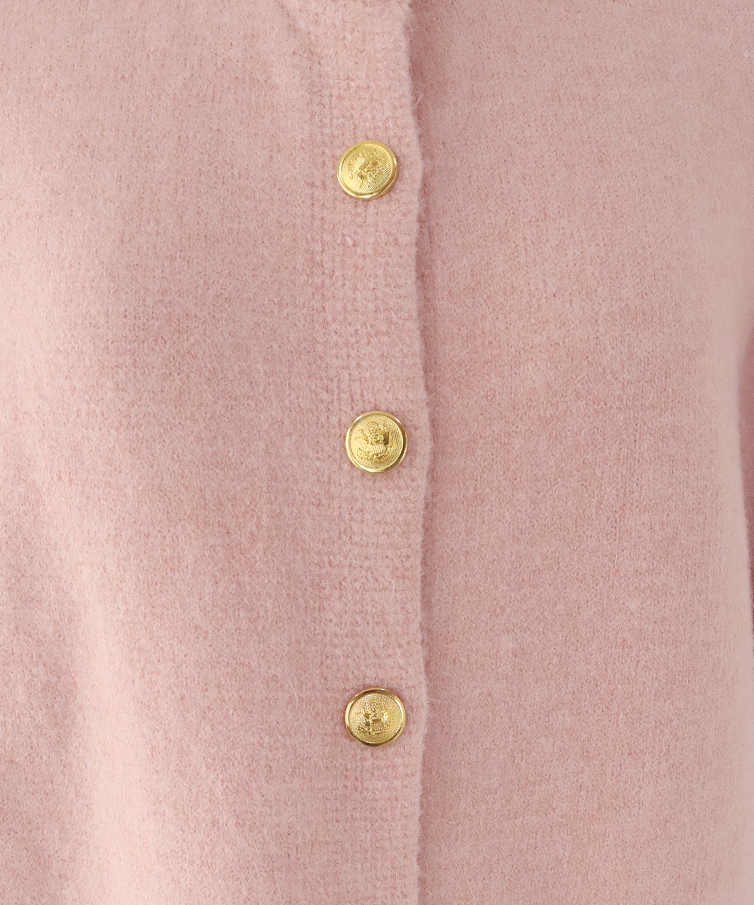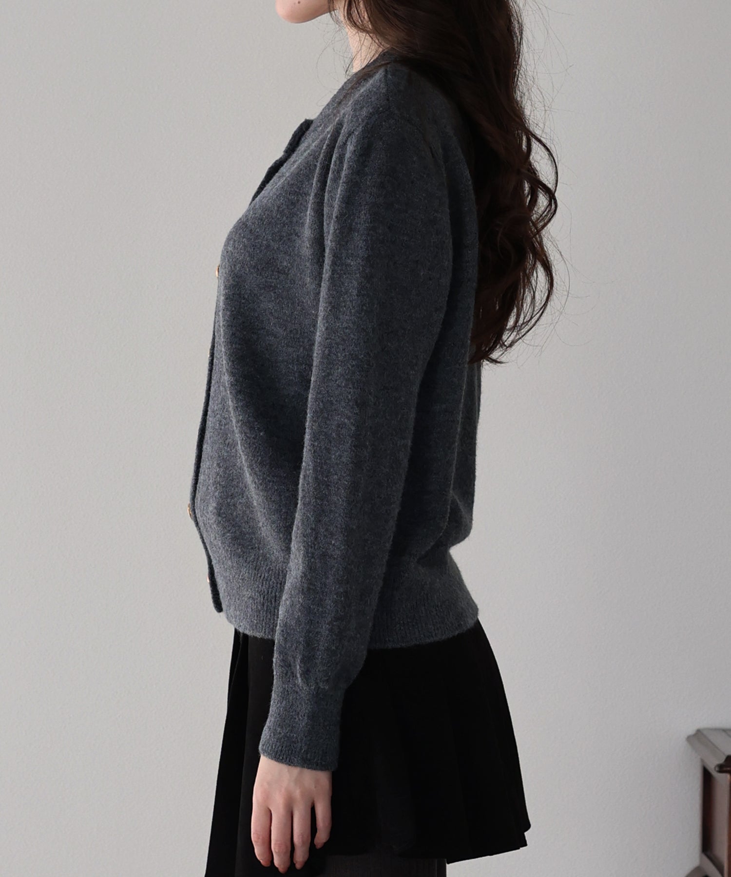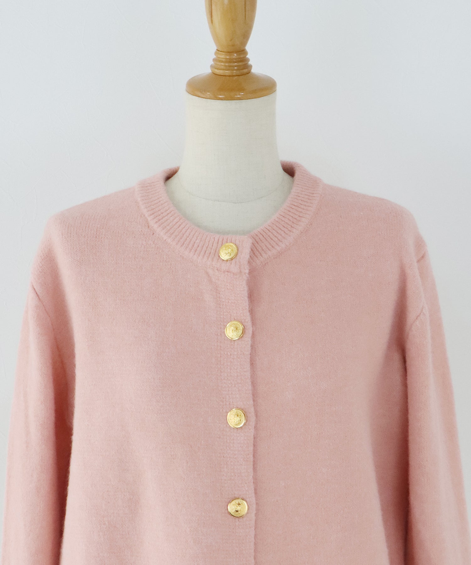 上品な金釦がアクセントになったクルーネックニットカーディガン。