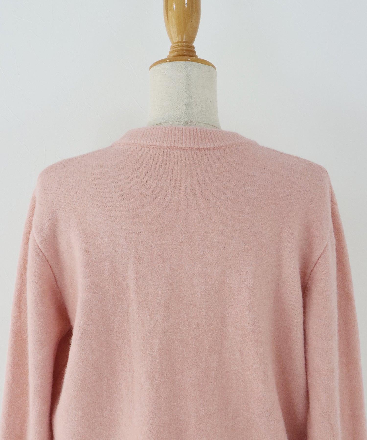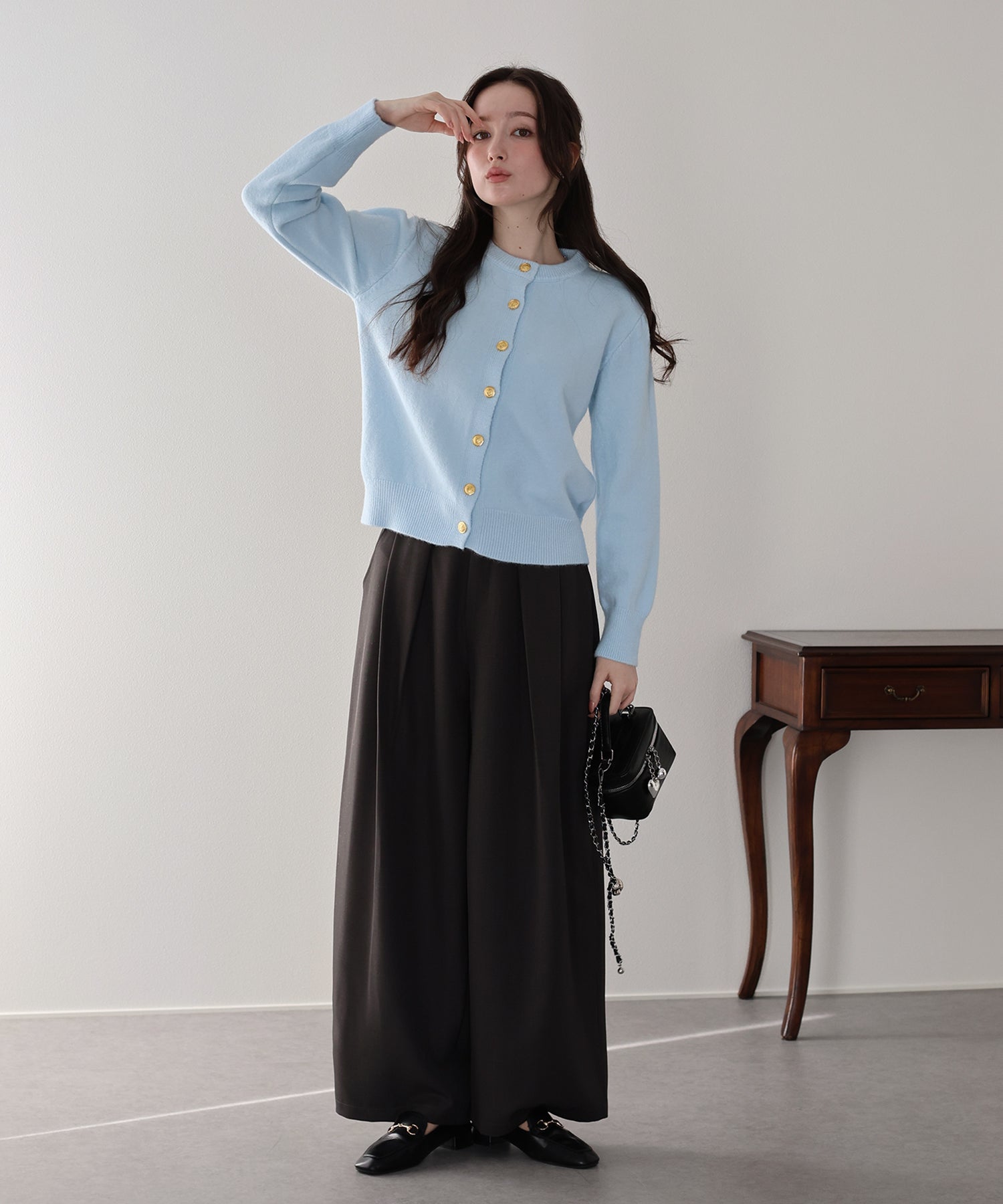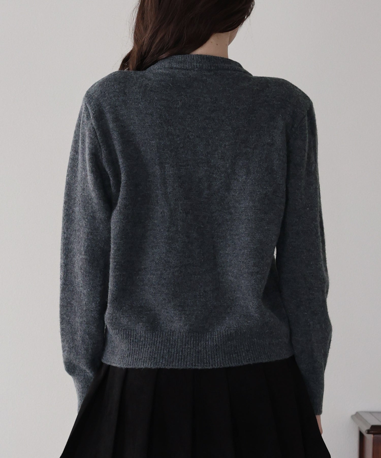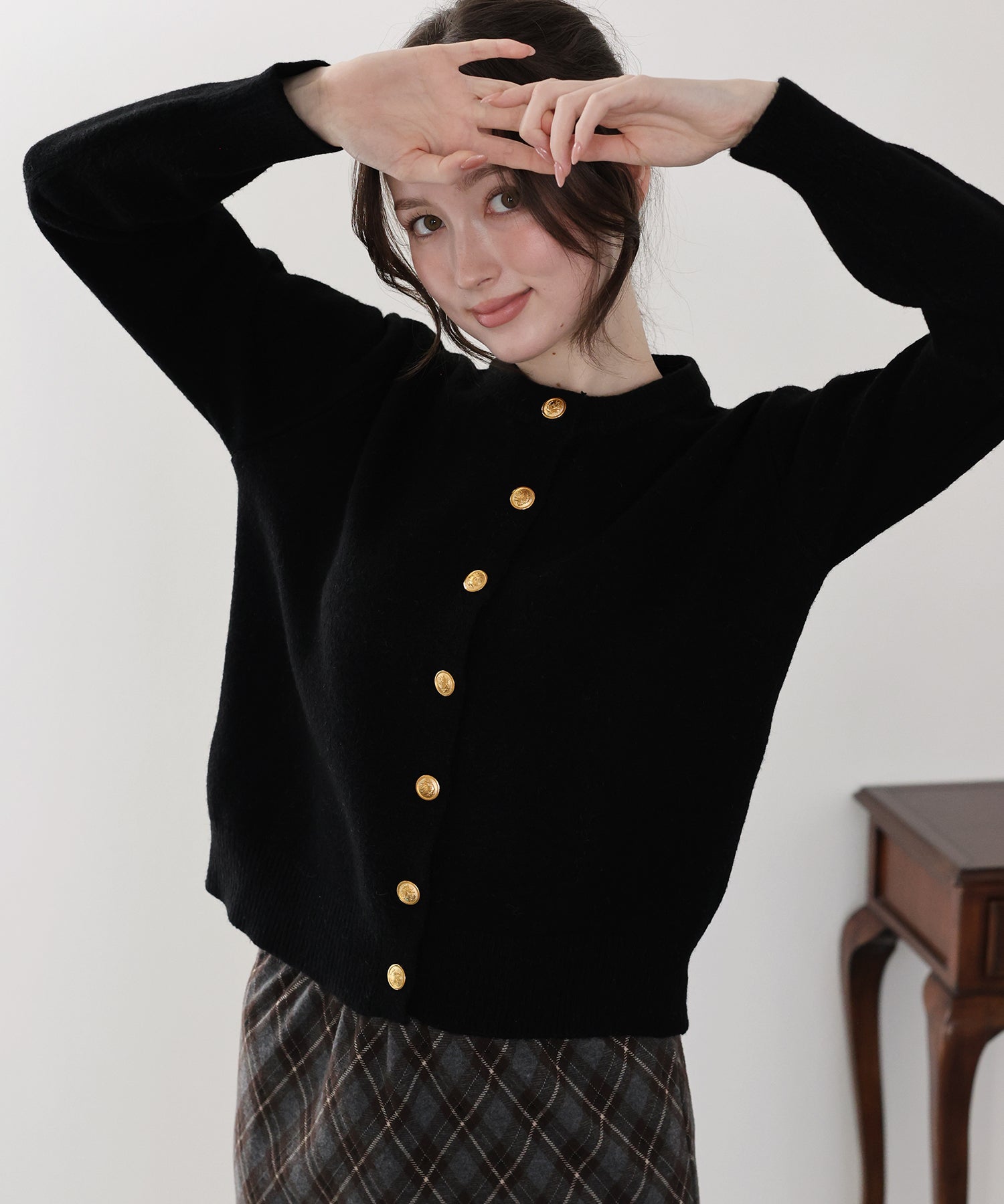 上品な金釦がアクセントになったクルーネックニットカーディガン。
