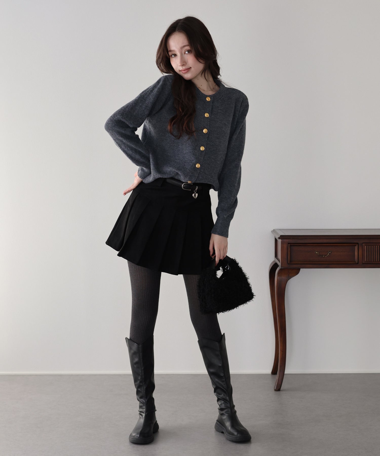 袖ファーケーブルカーディガン