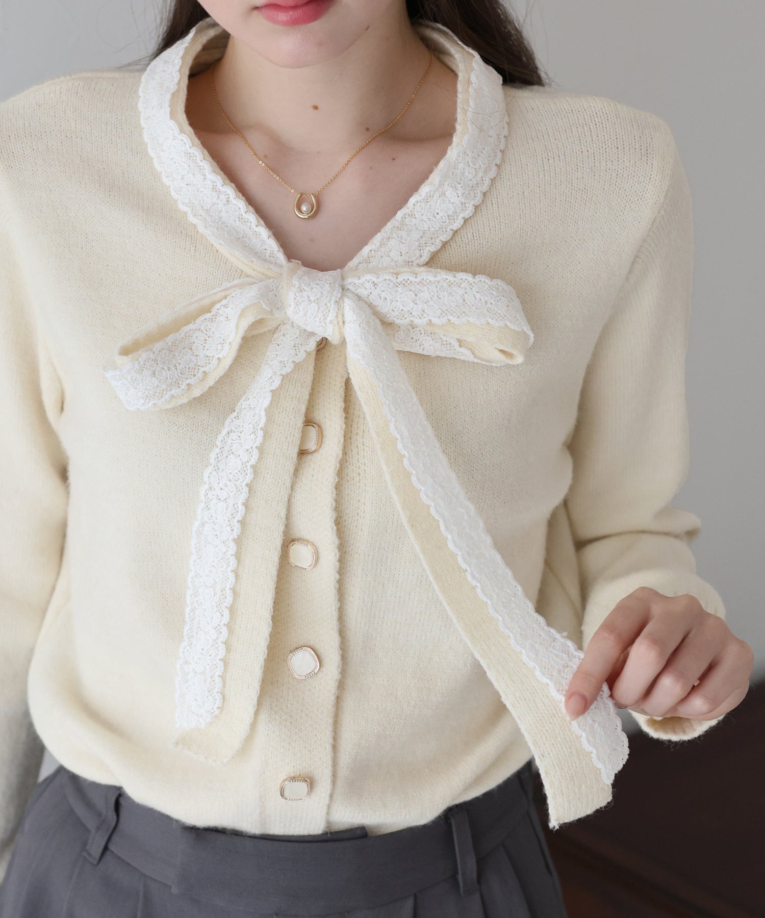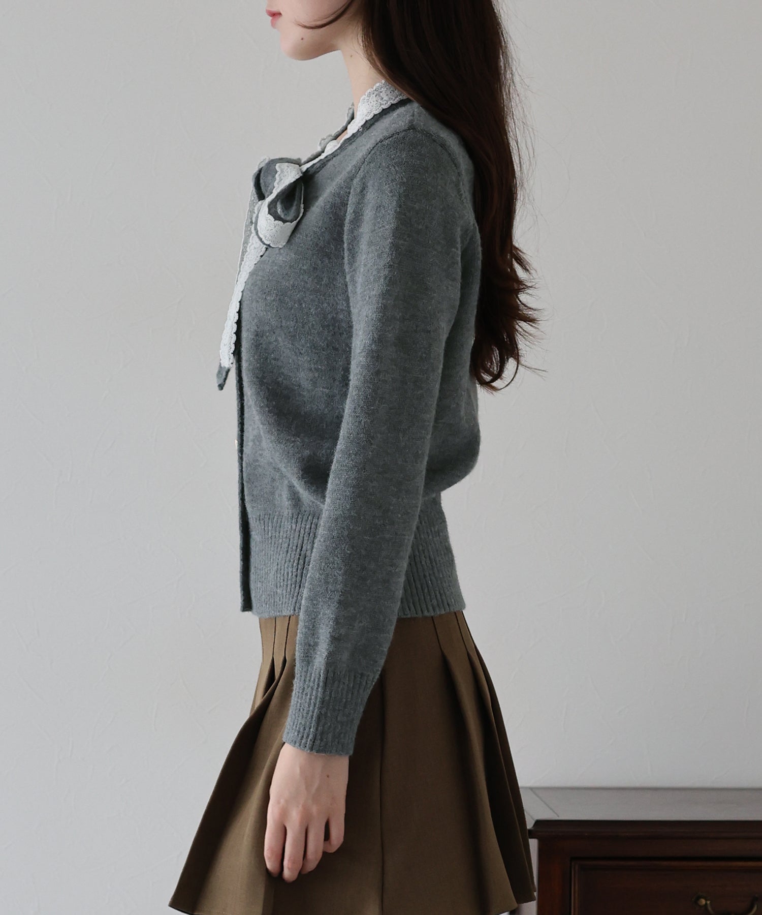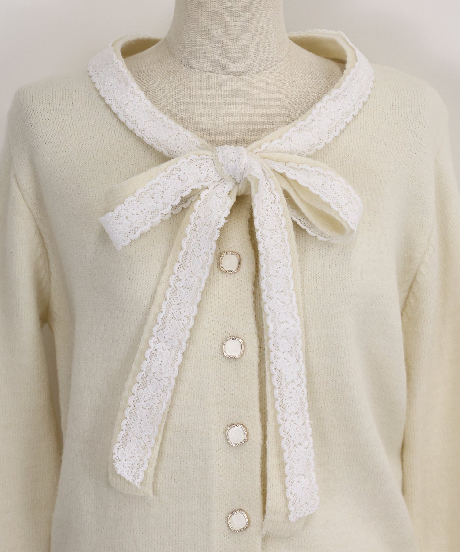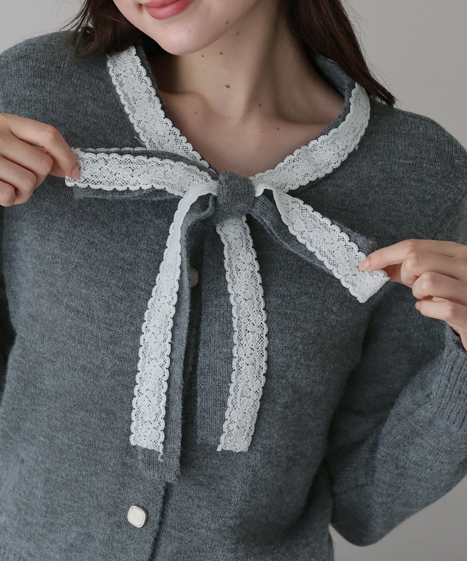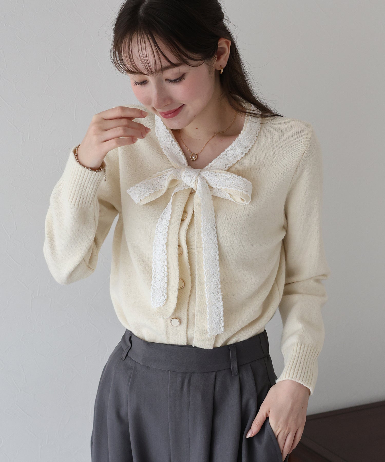 ネックラインのレースとリボンがポイントのニットカーディガン。