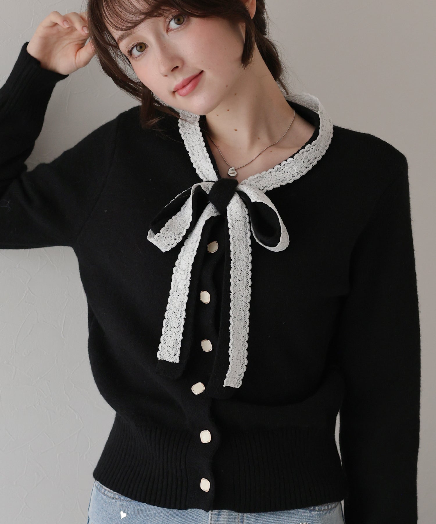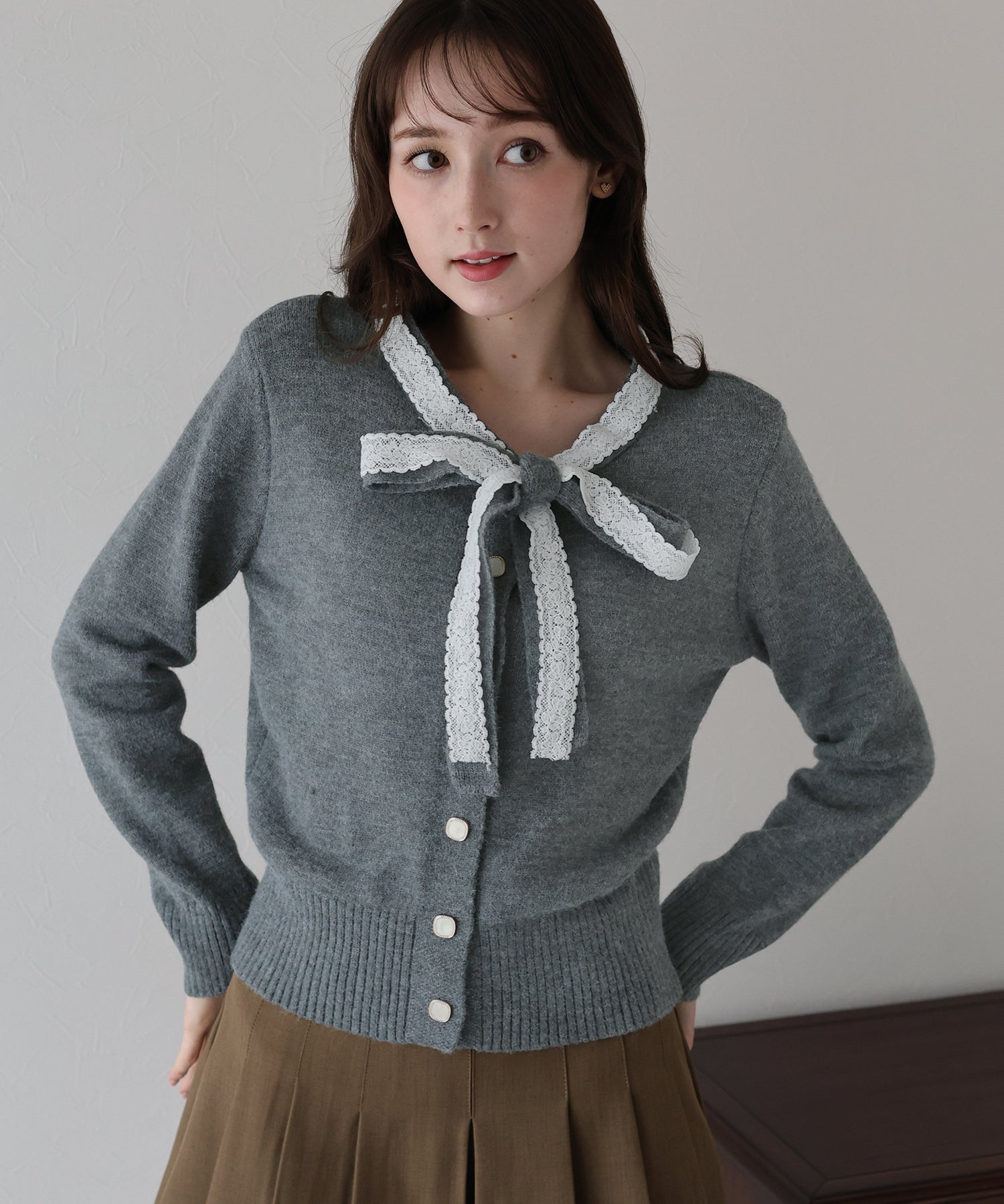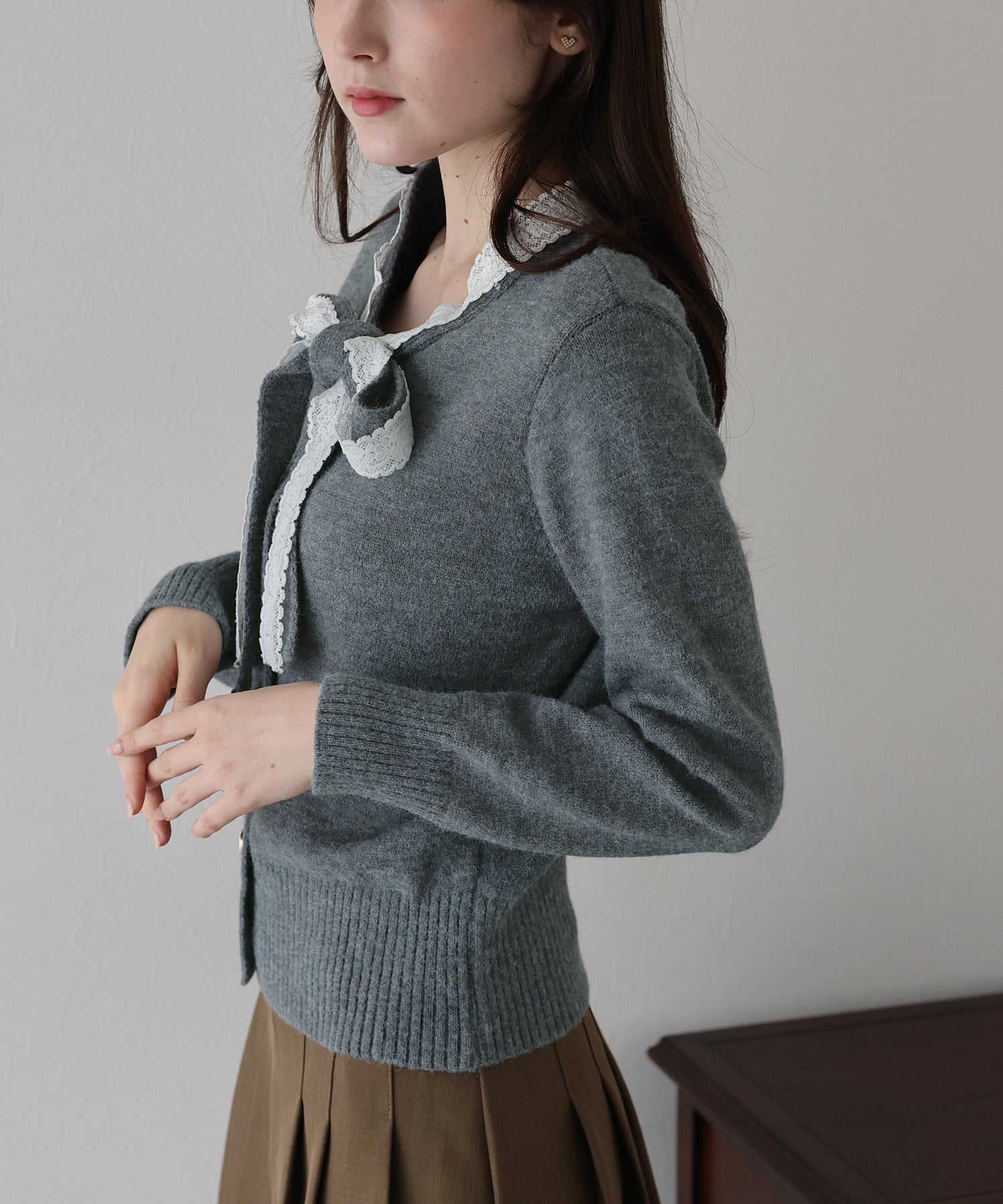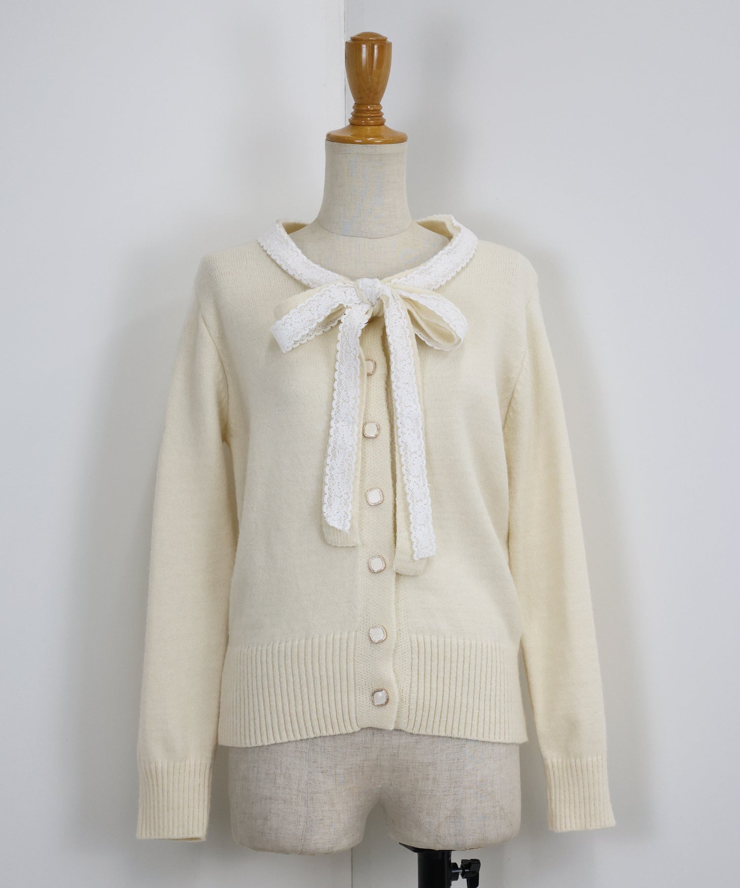 ネックラインのレースとリボンがポイントのニットカーディガン。