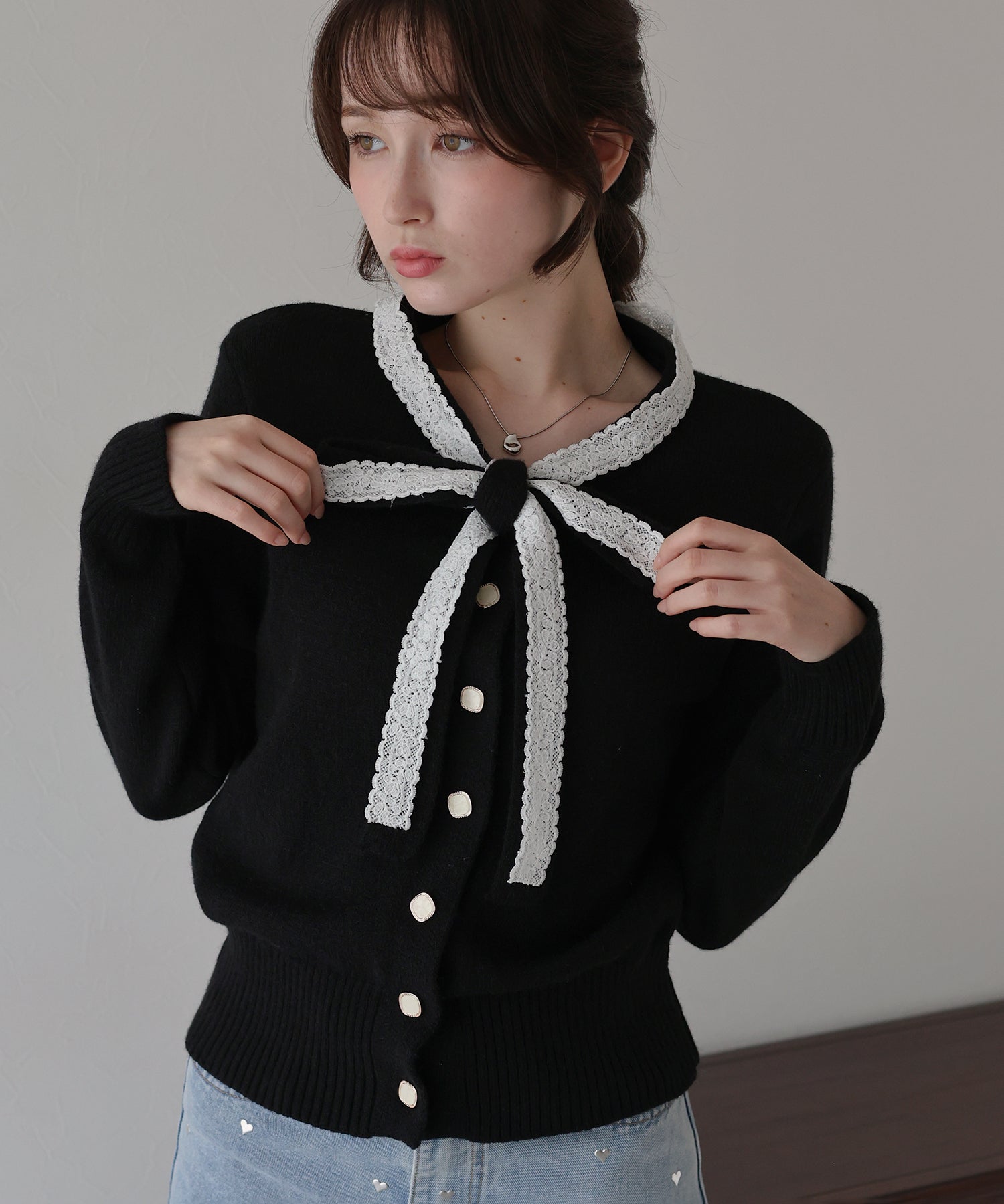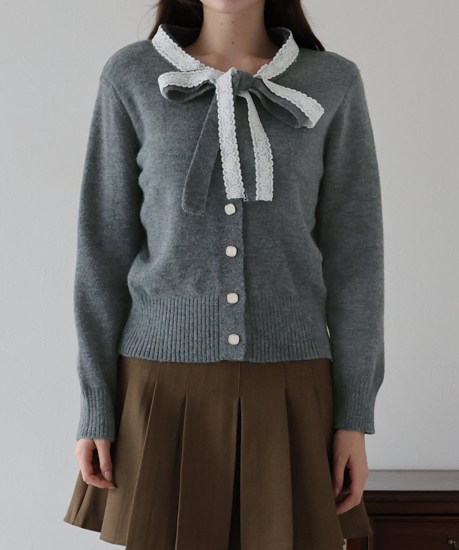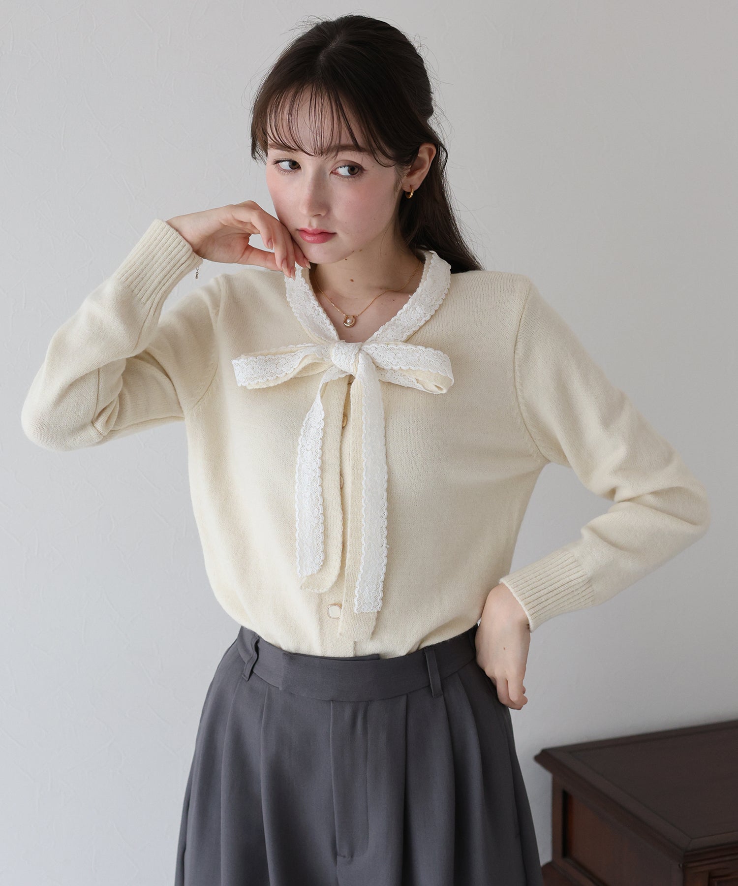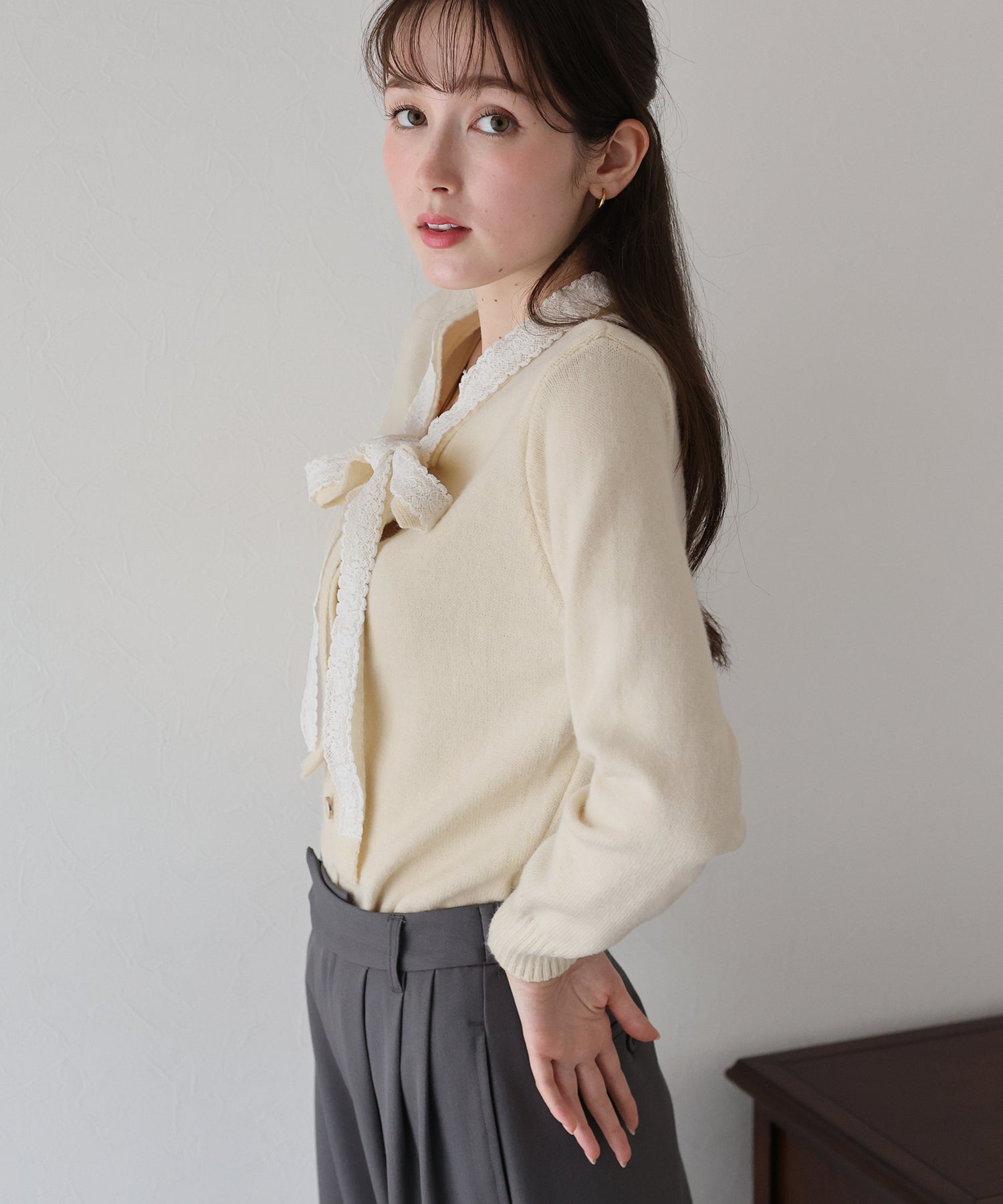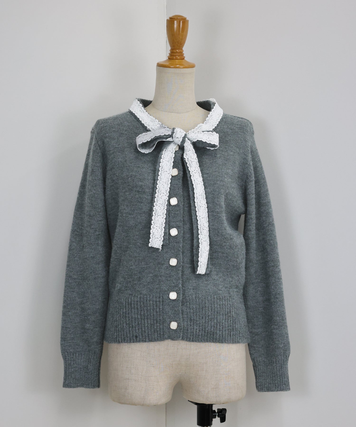 ネックラインのレースとリボンがポイントのニットカーディガン。