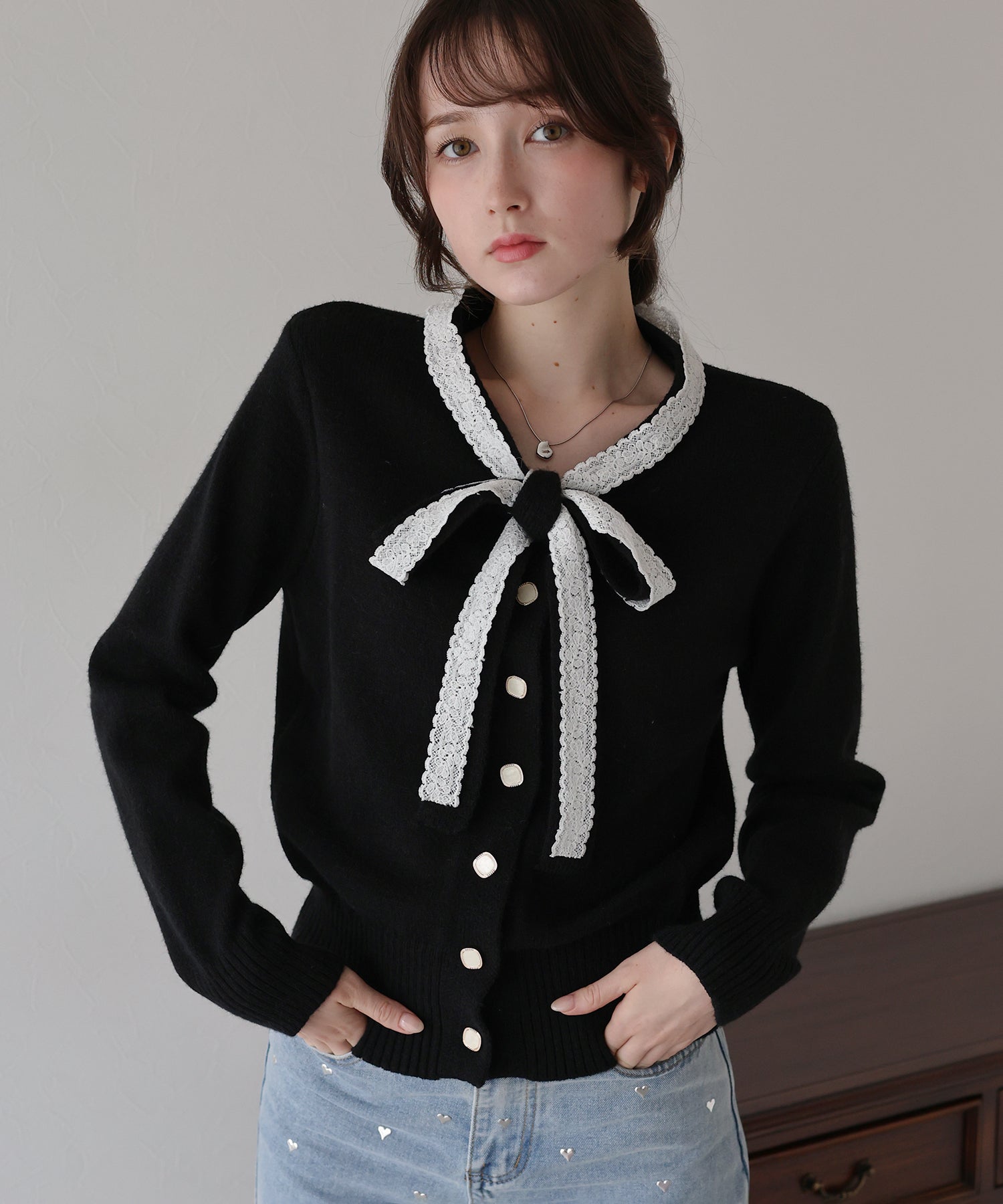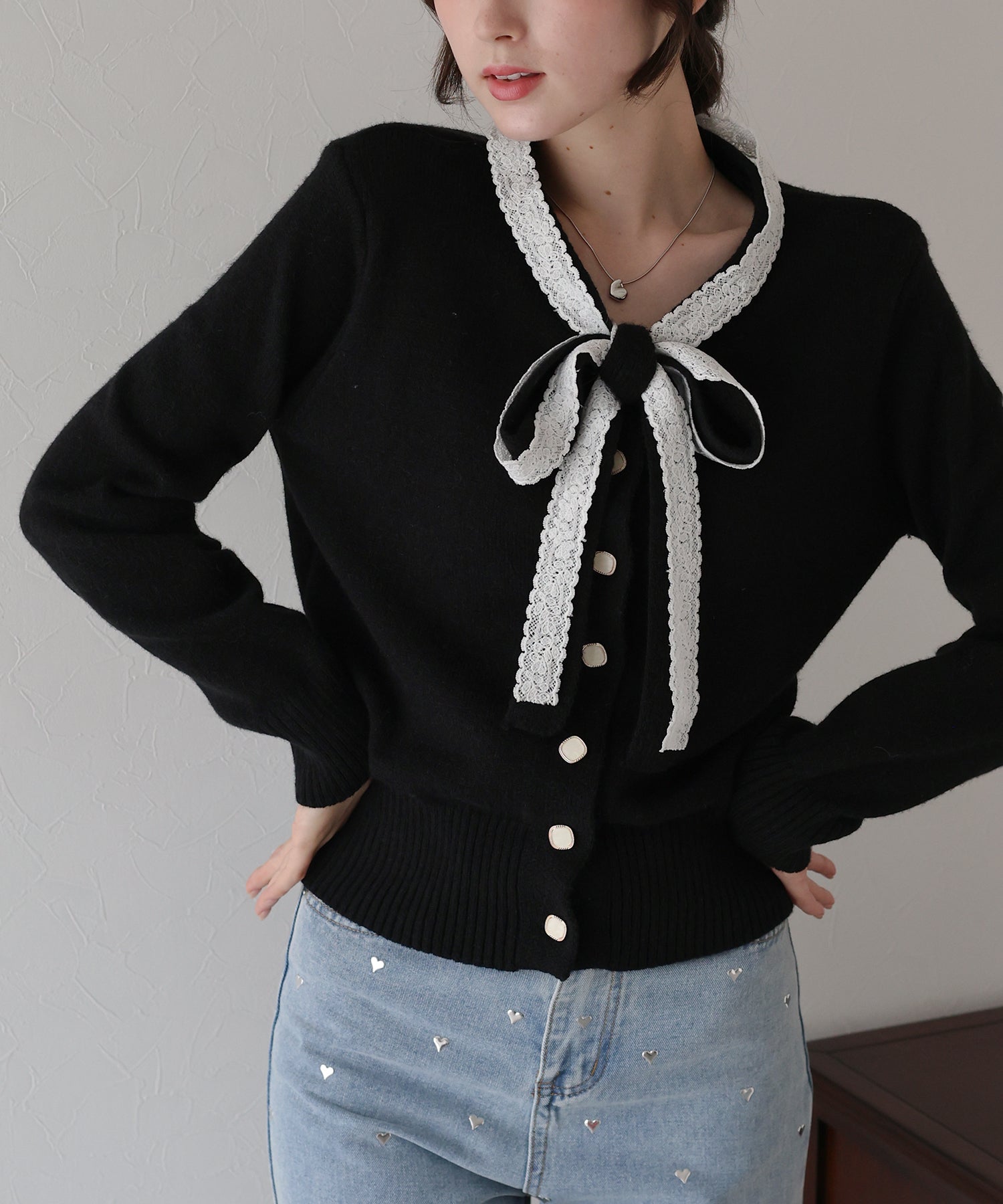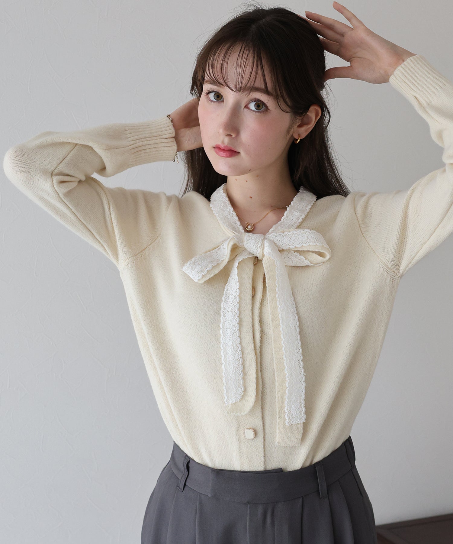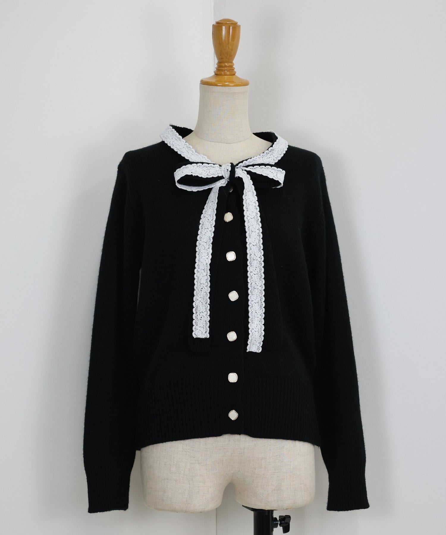 ネックラインのレースとリボンがポイントのニットカーディガン。