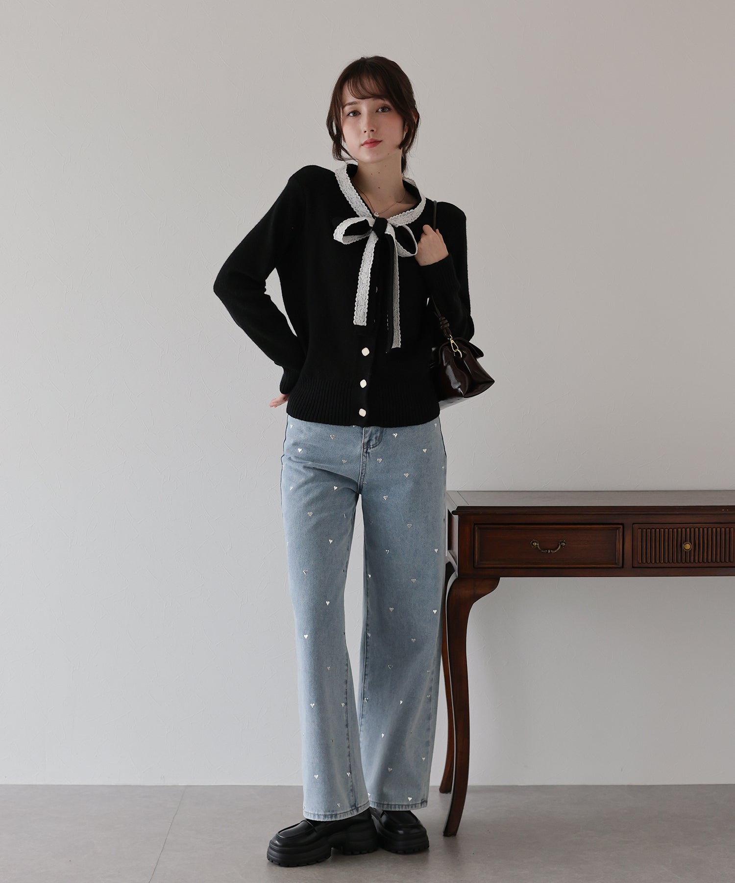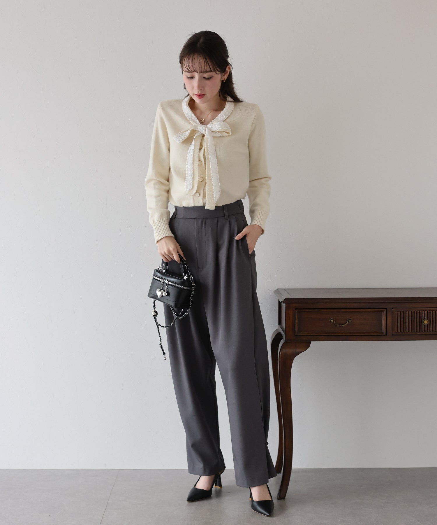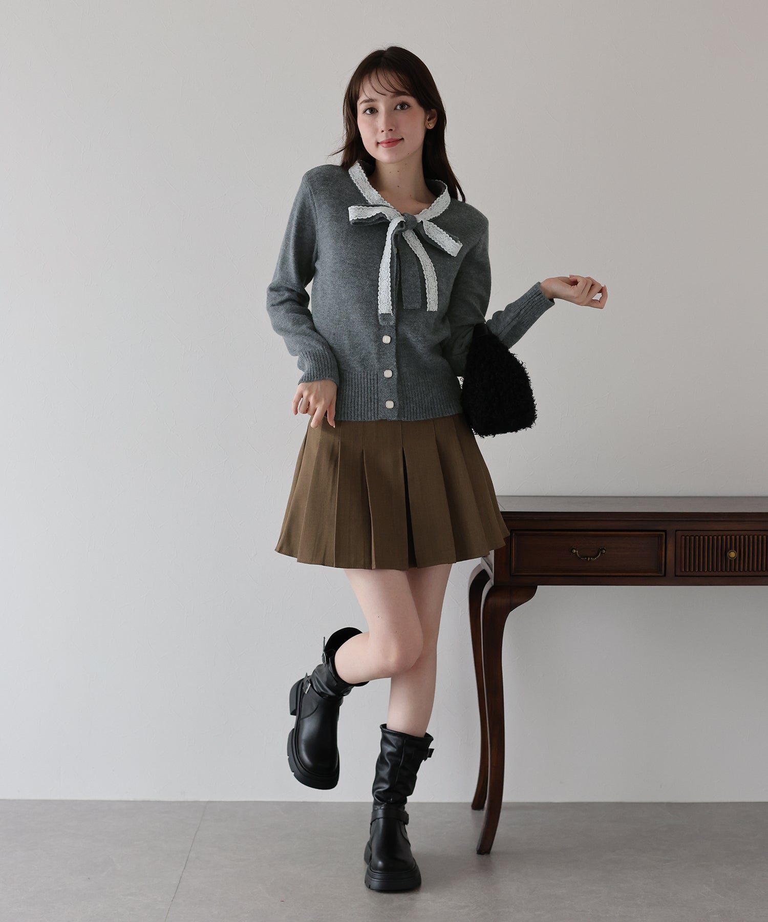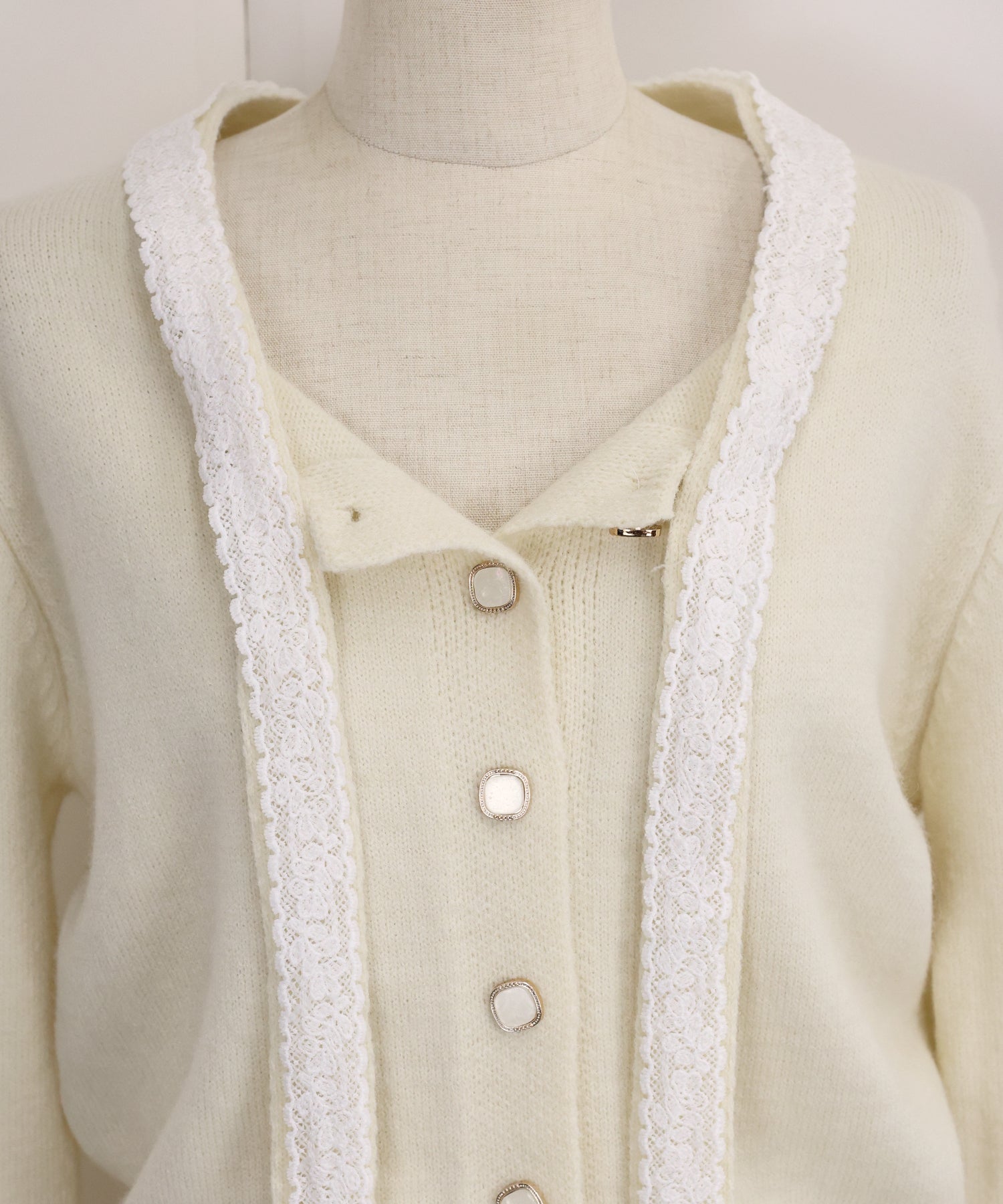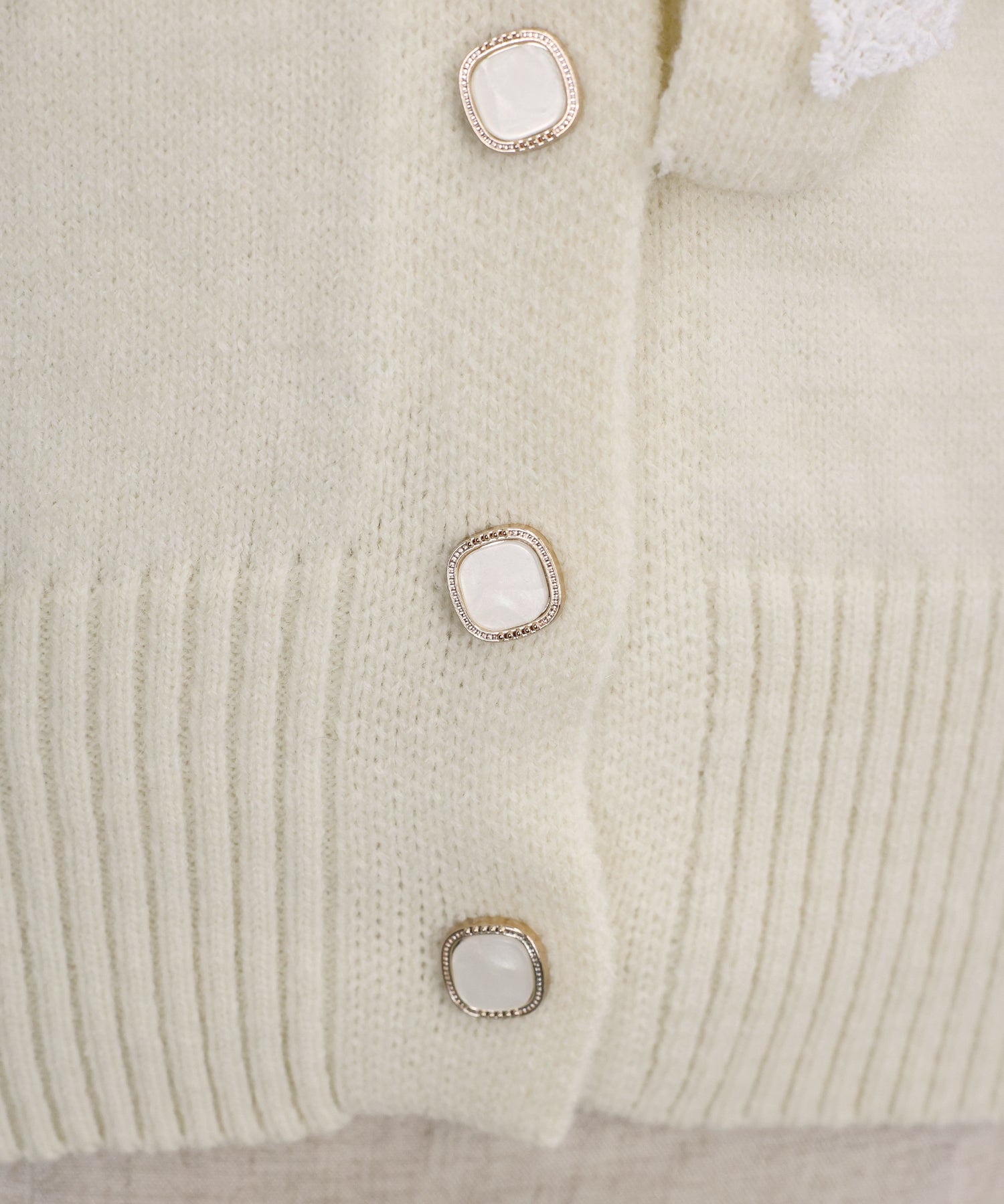 ネックラインのレースとリボンがポイントのニットカーディガン。