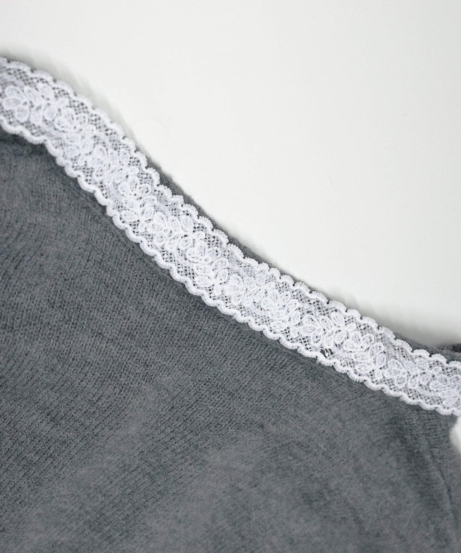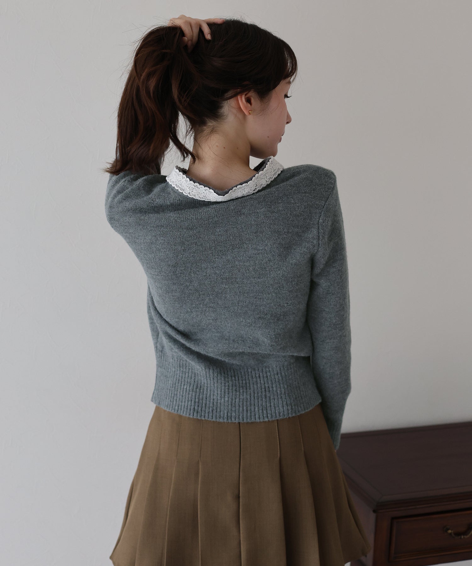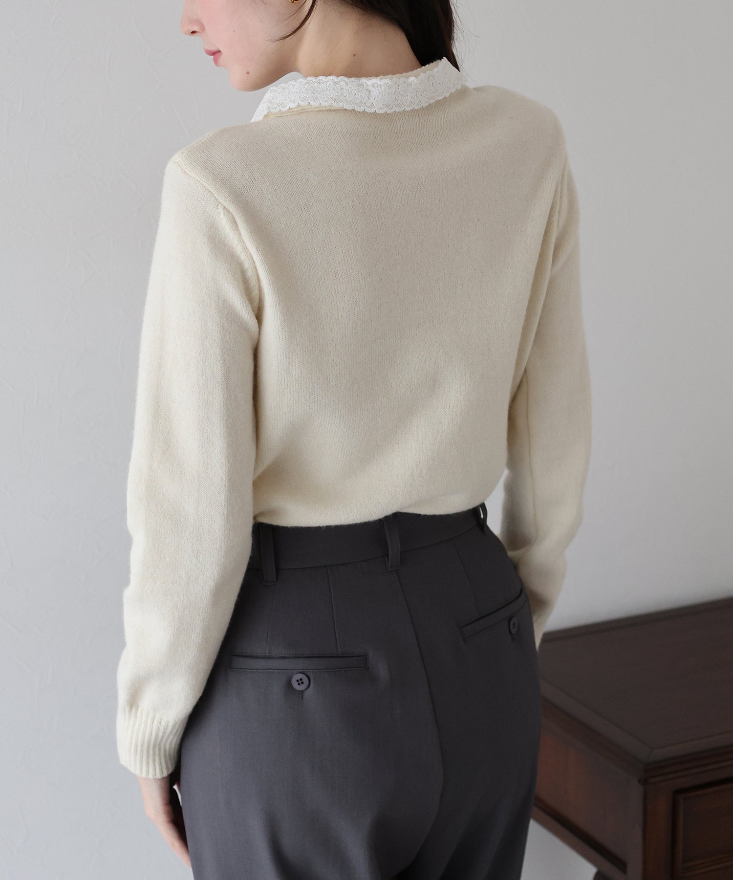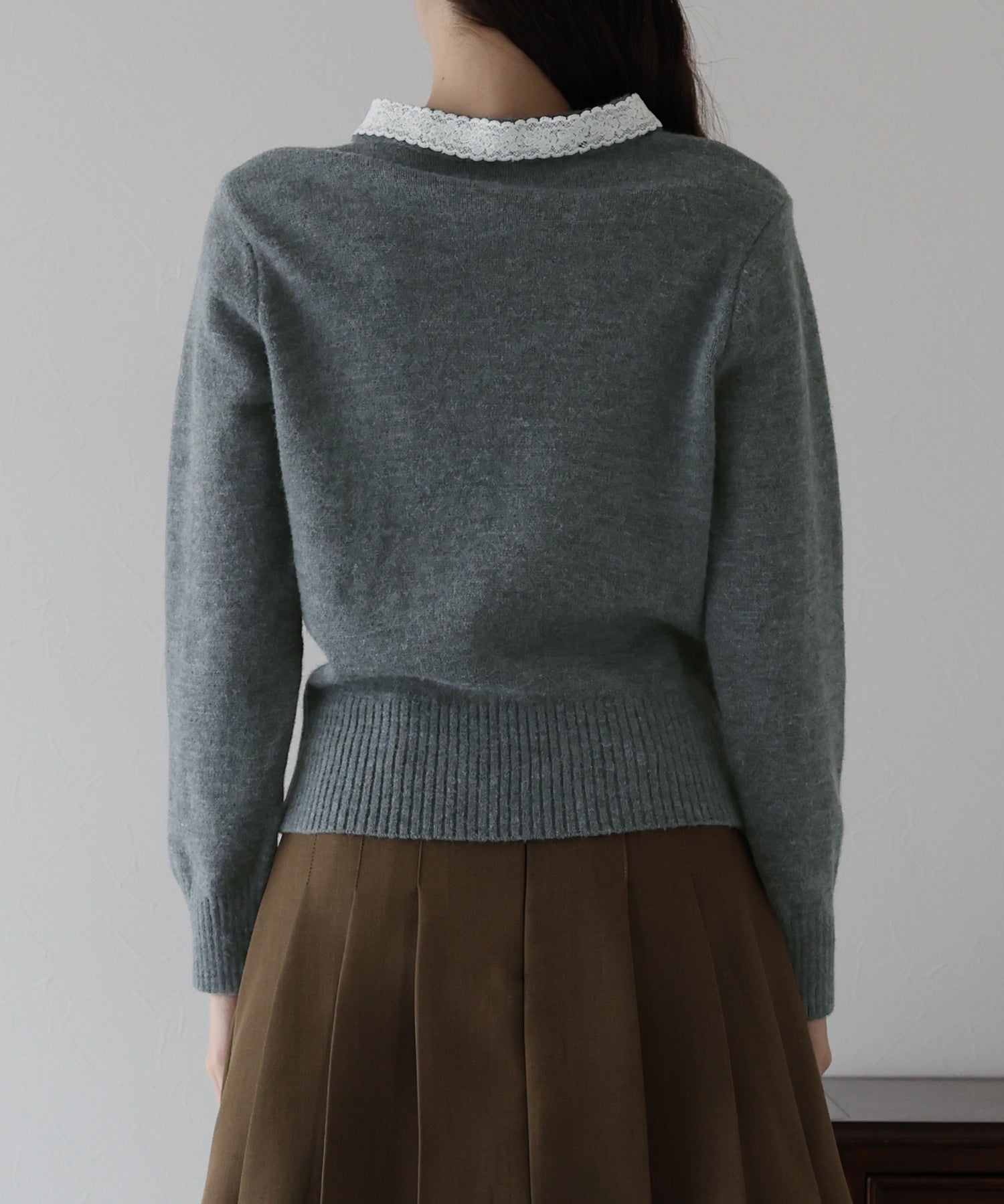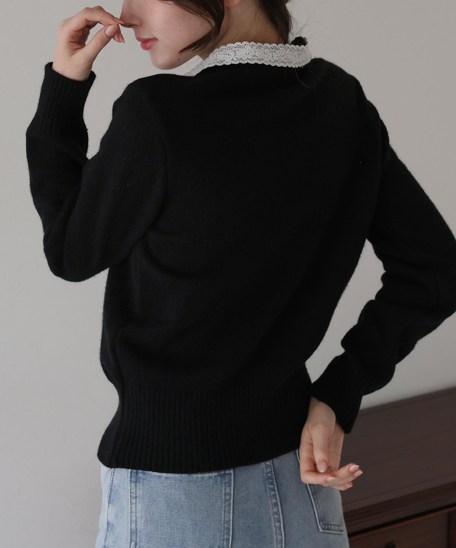 シンプルなデザインのニットカーディガンにレースをあしらいガーリーさをプラスしました。
