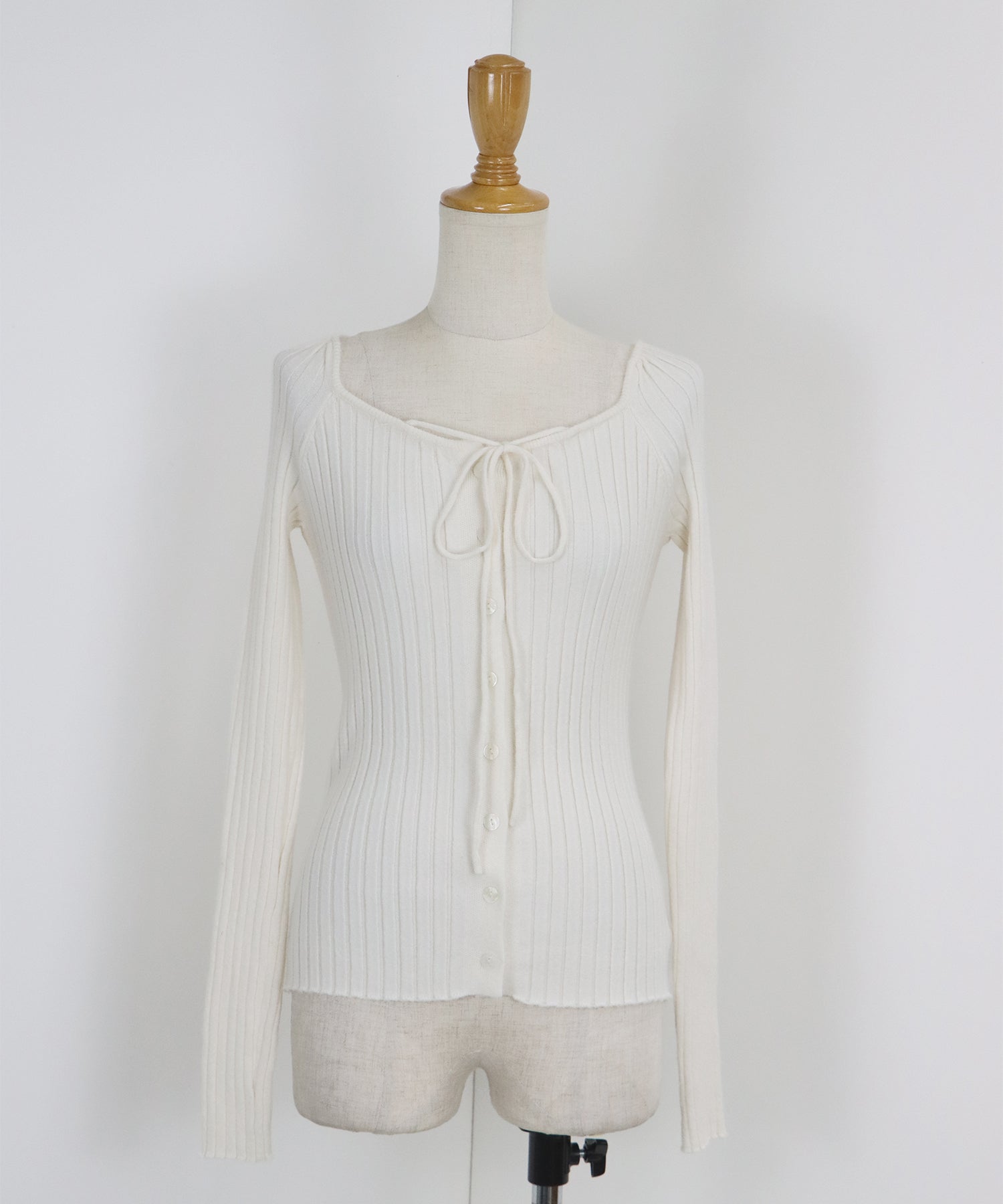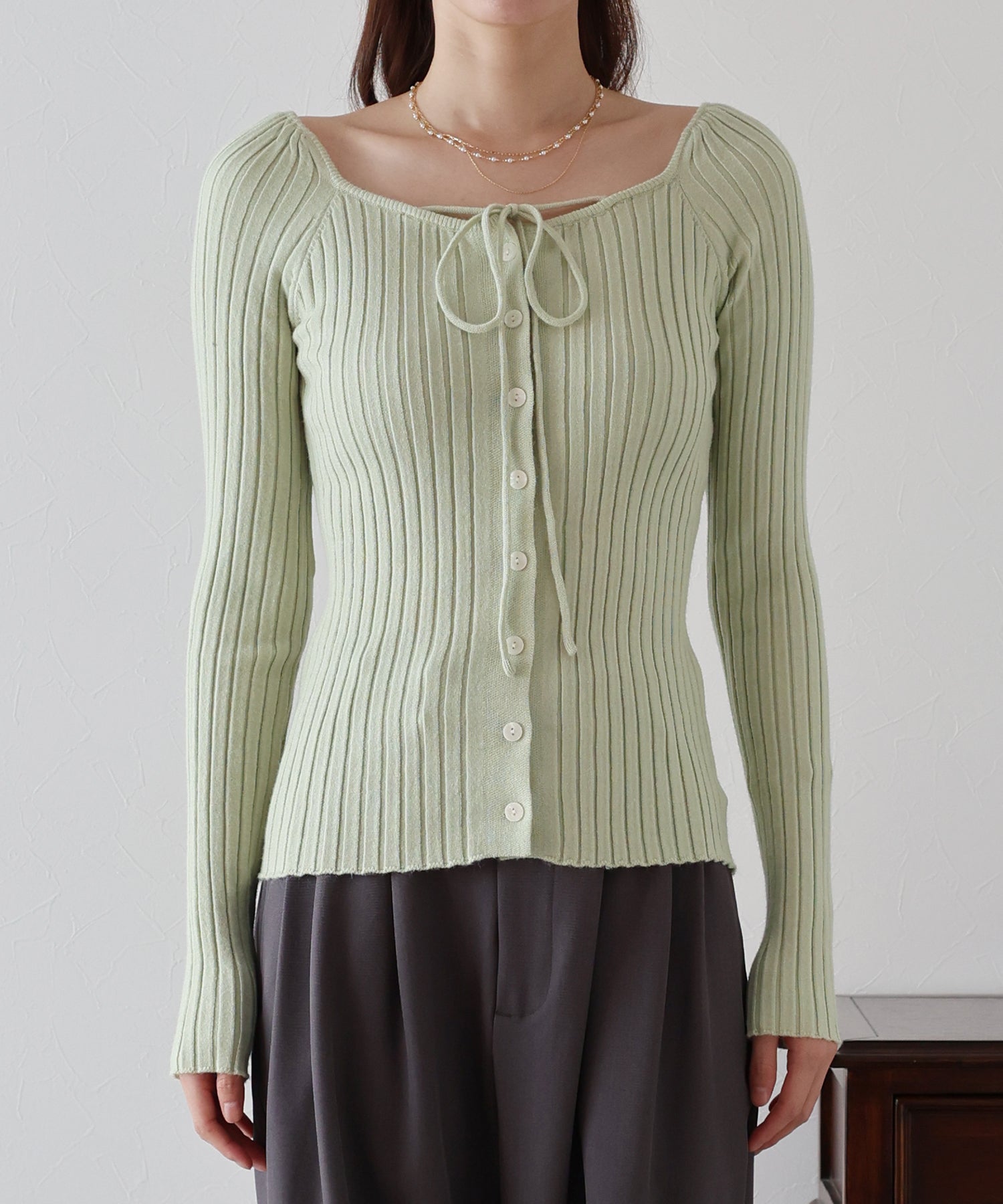 デコルテを美しく引き立てるスクエアネック&リボンが目を惹くニットトップス。