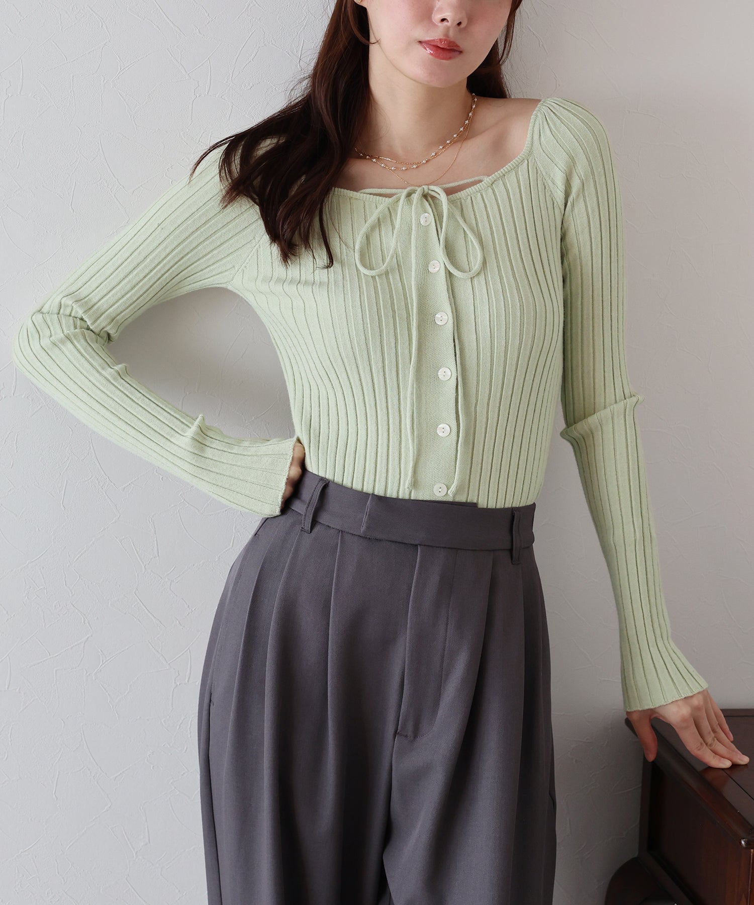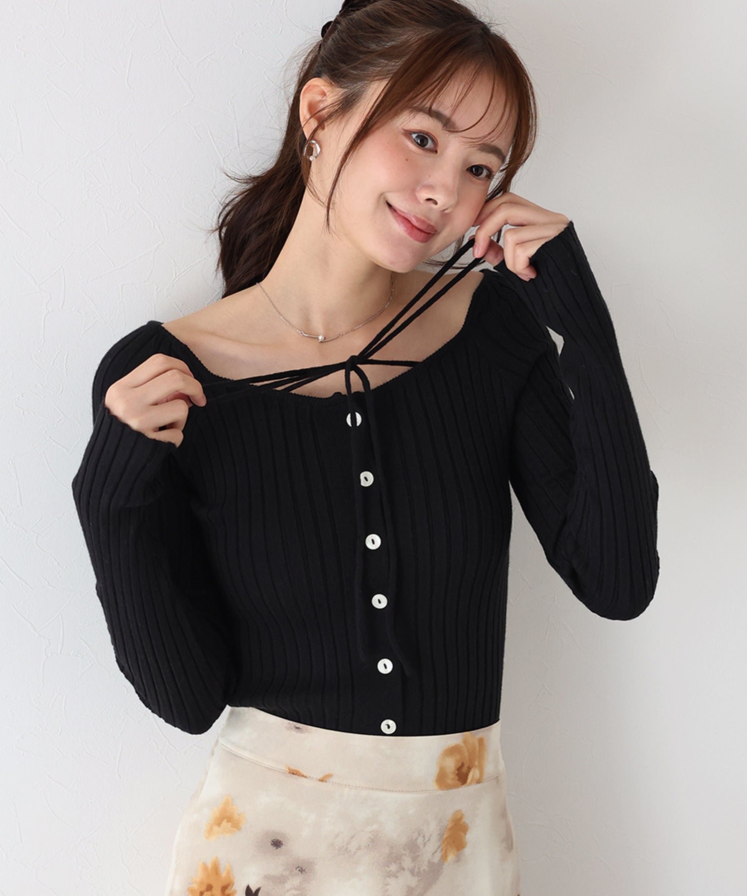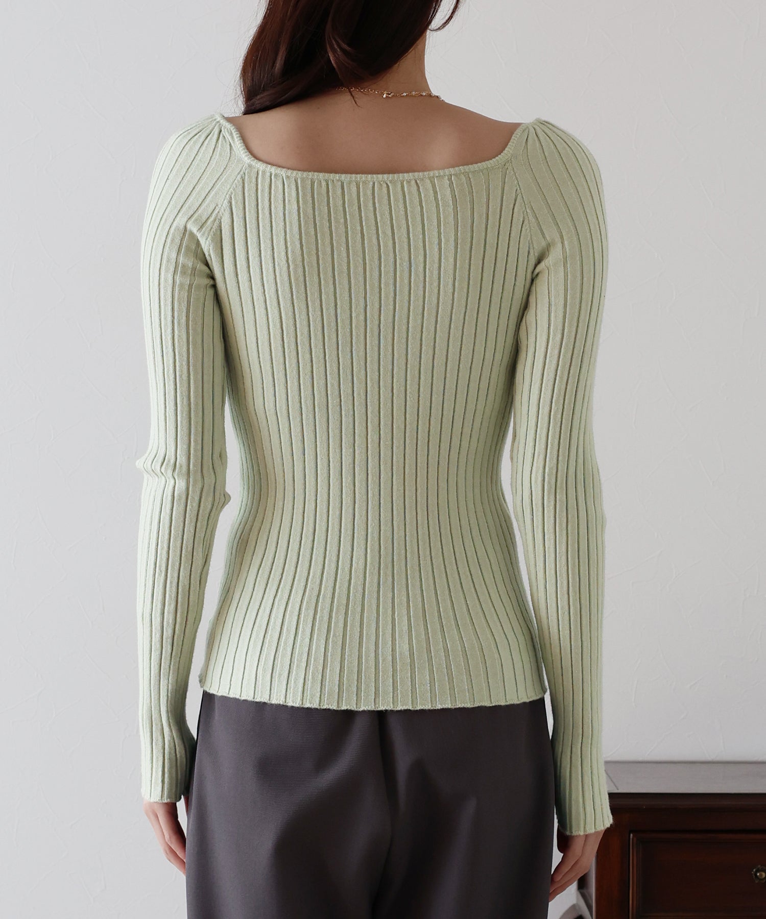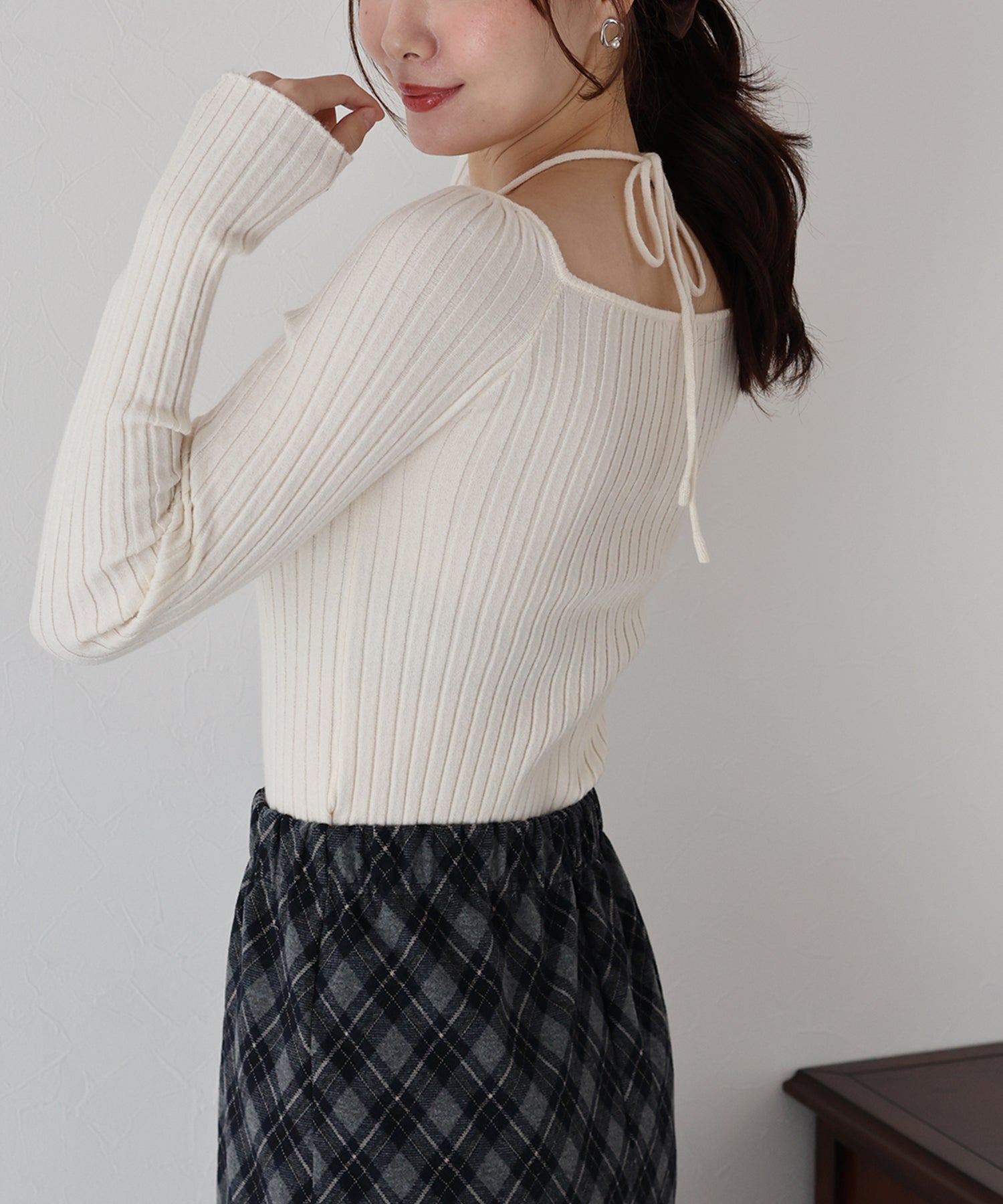 スクエアネックとリボンチョーカーがフェミニンなリブニットトップス