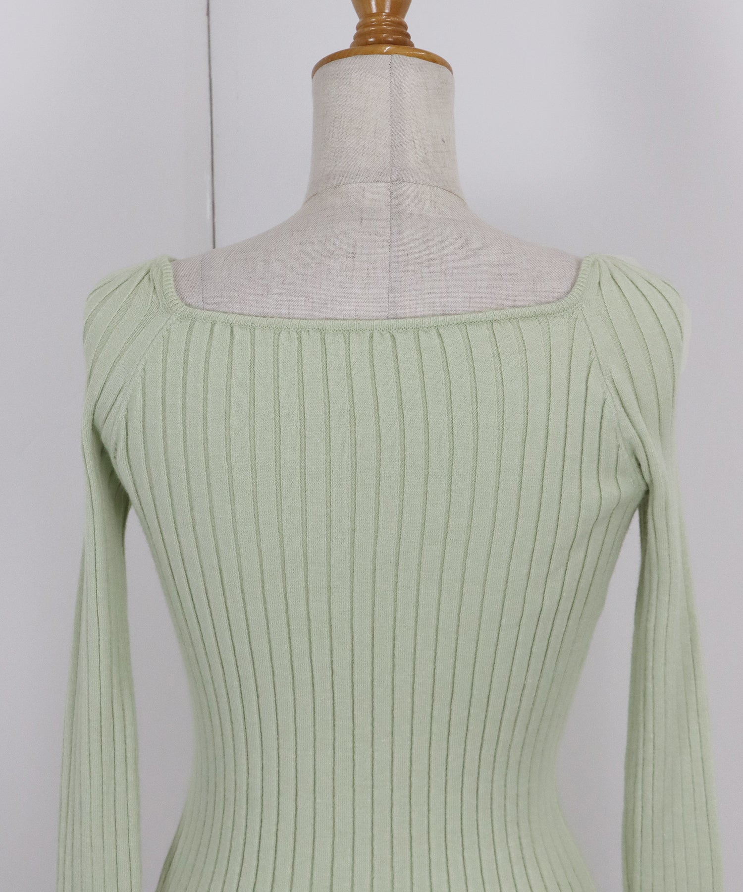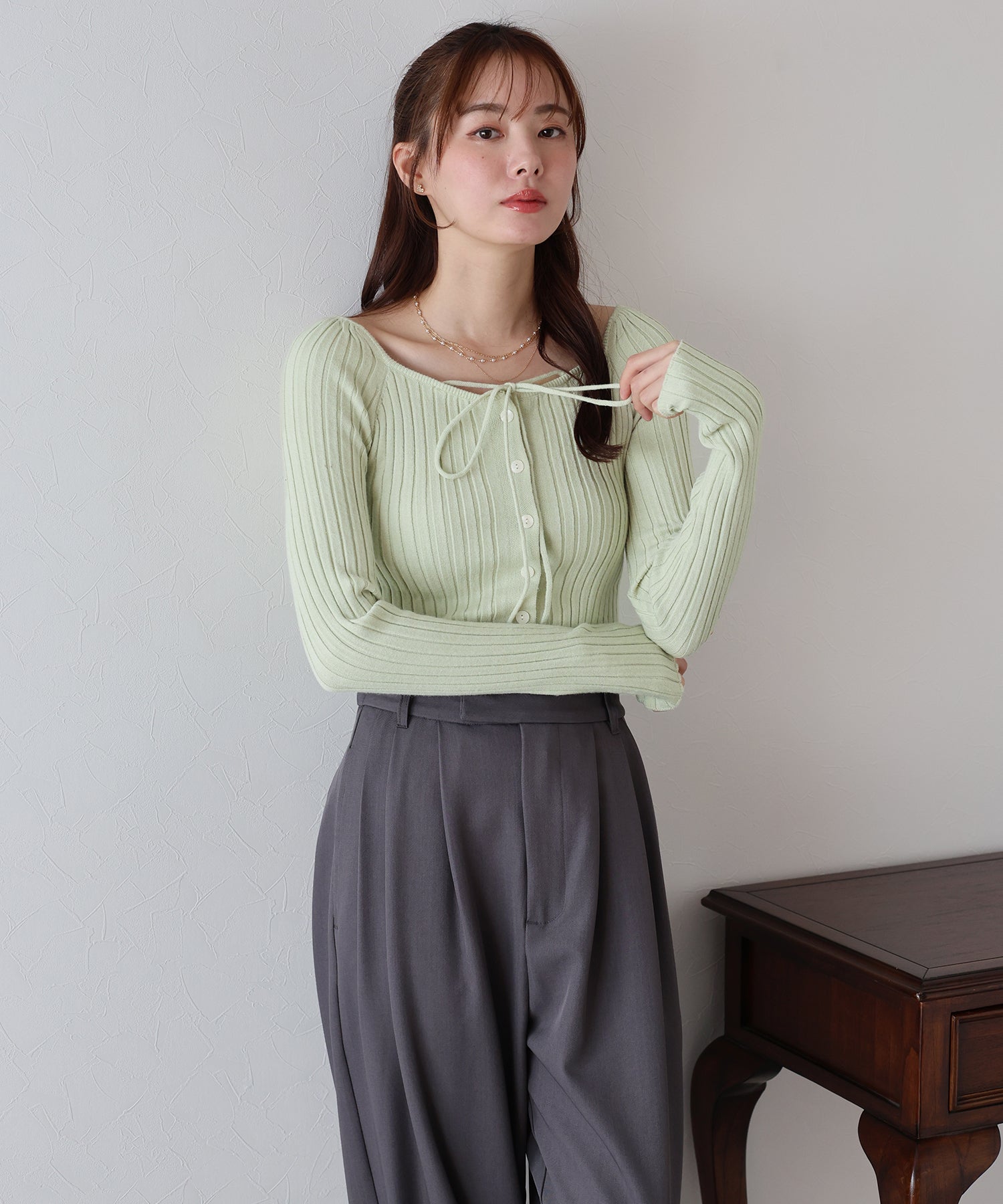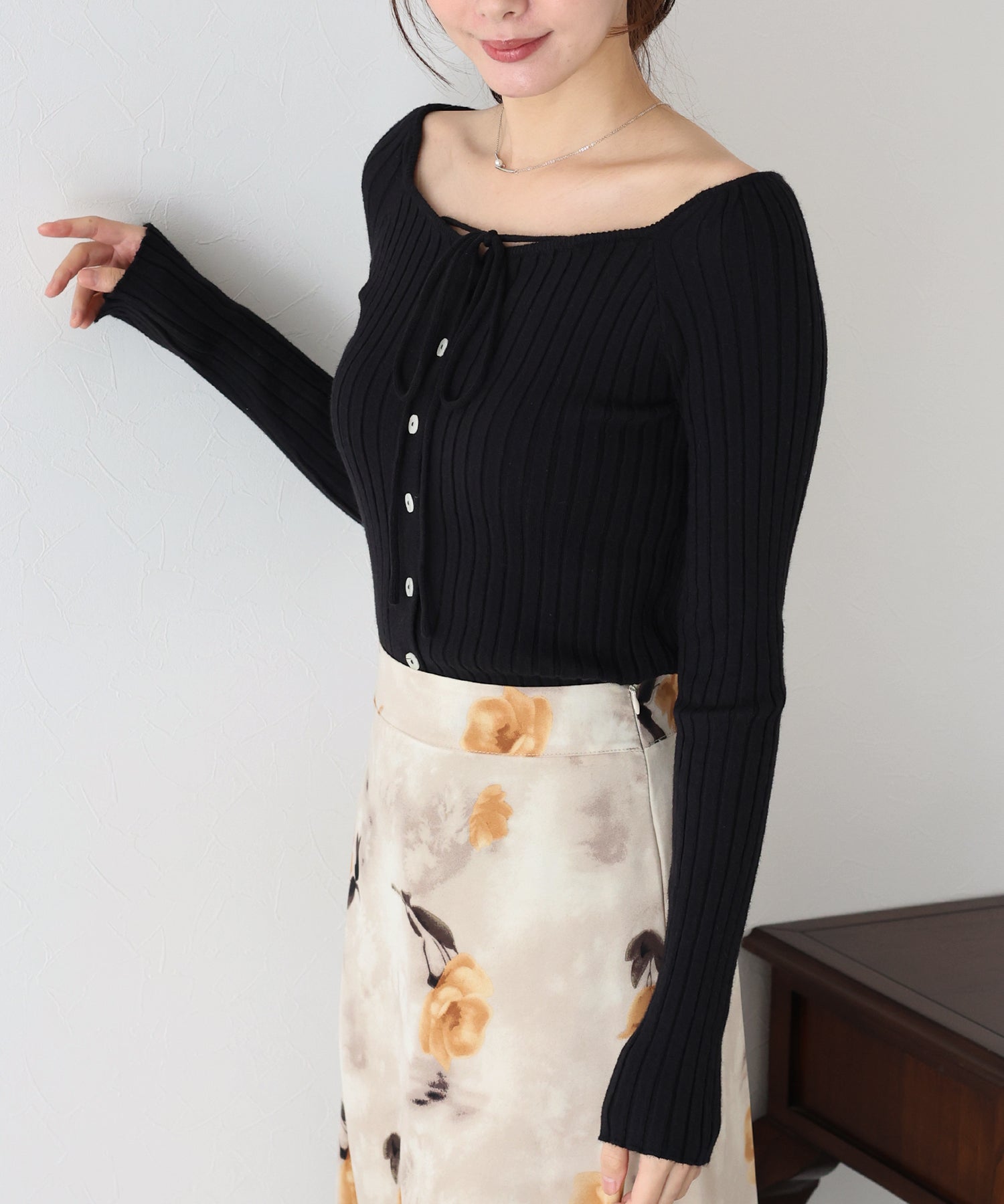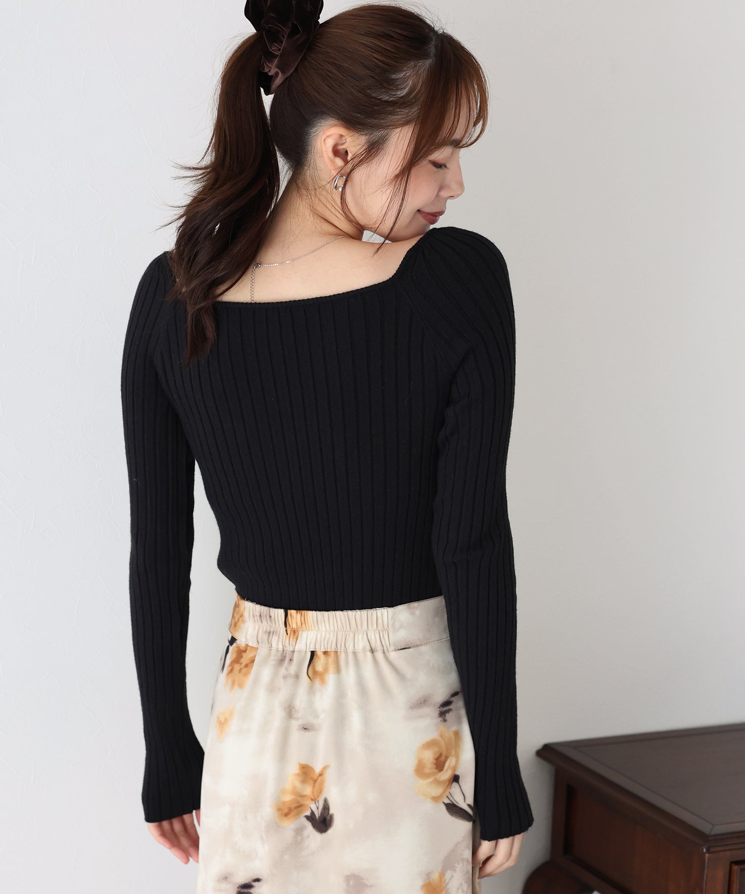 スクエアネックとリボンチョーカーがフェミニンなリブニットトップス
