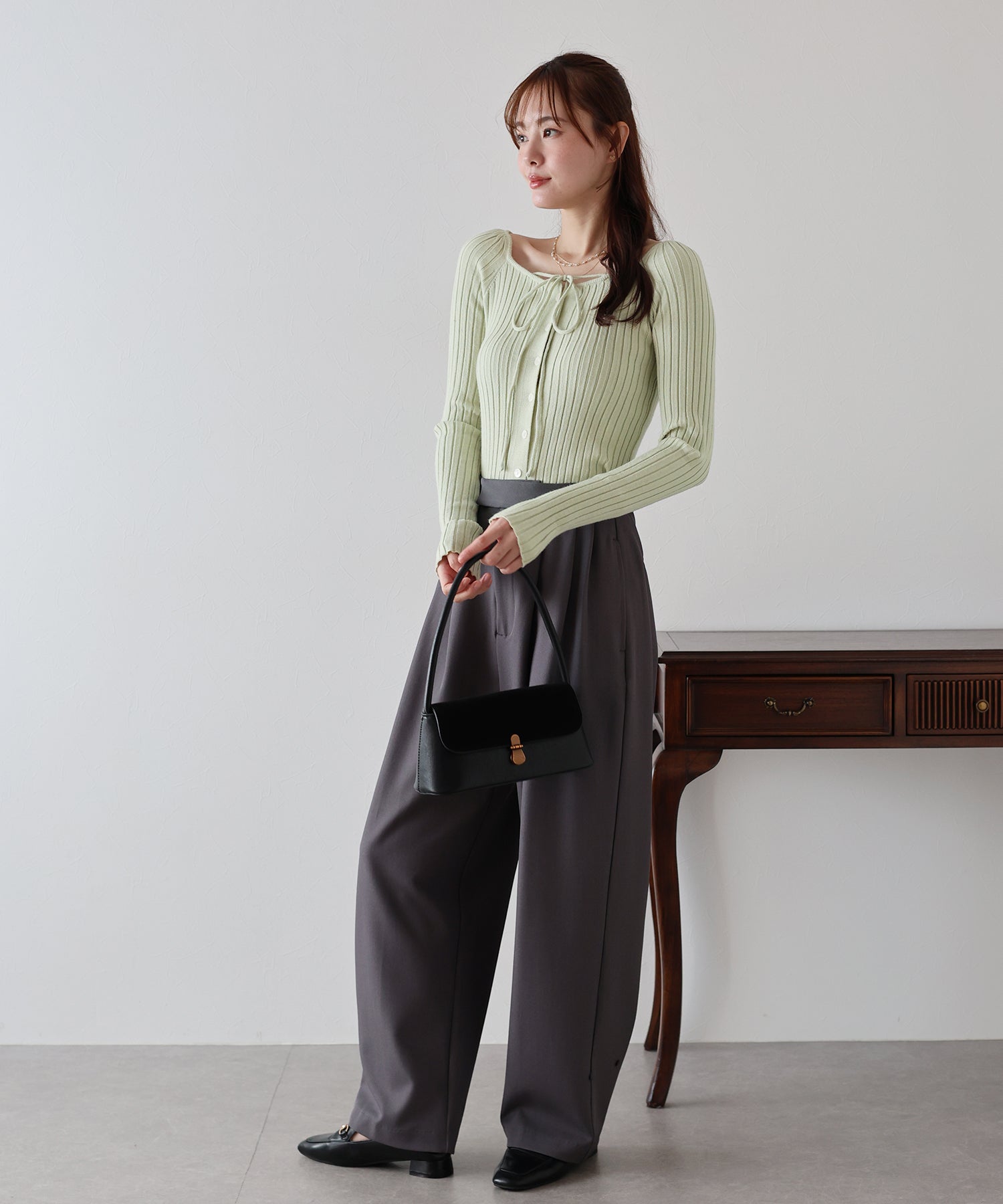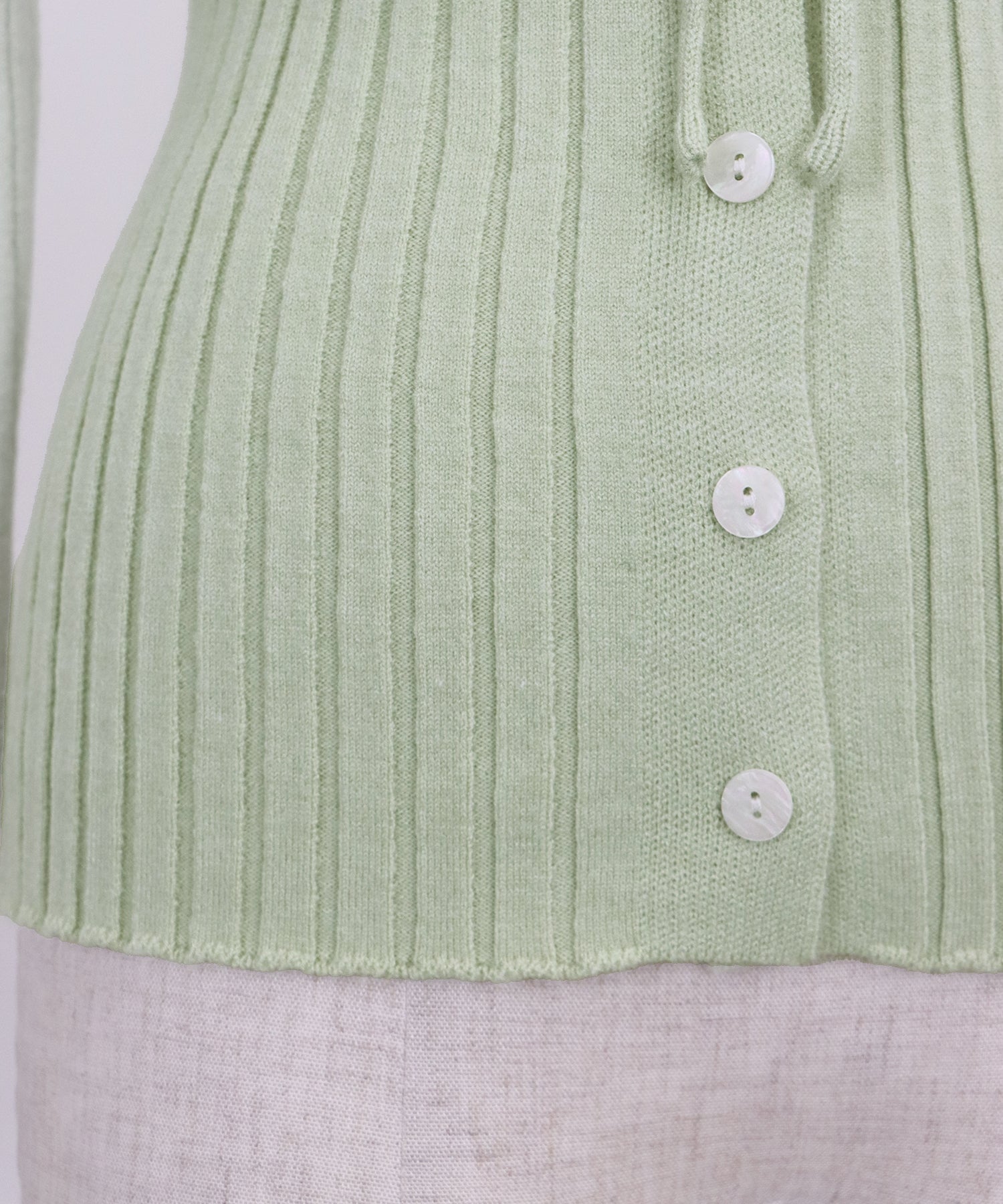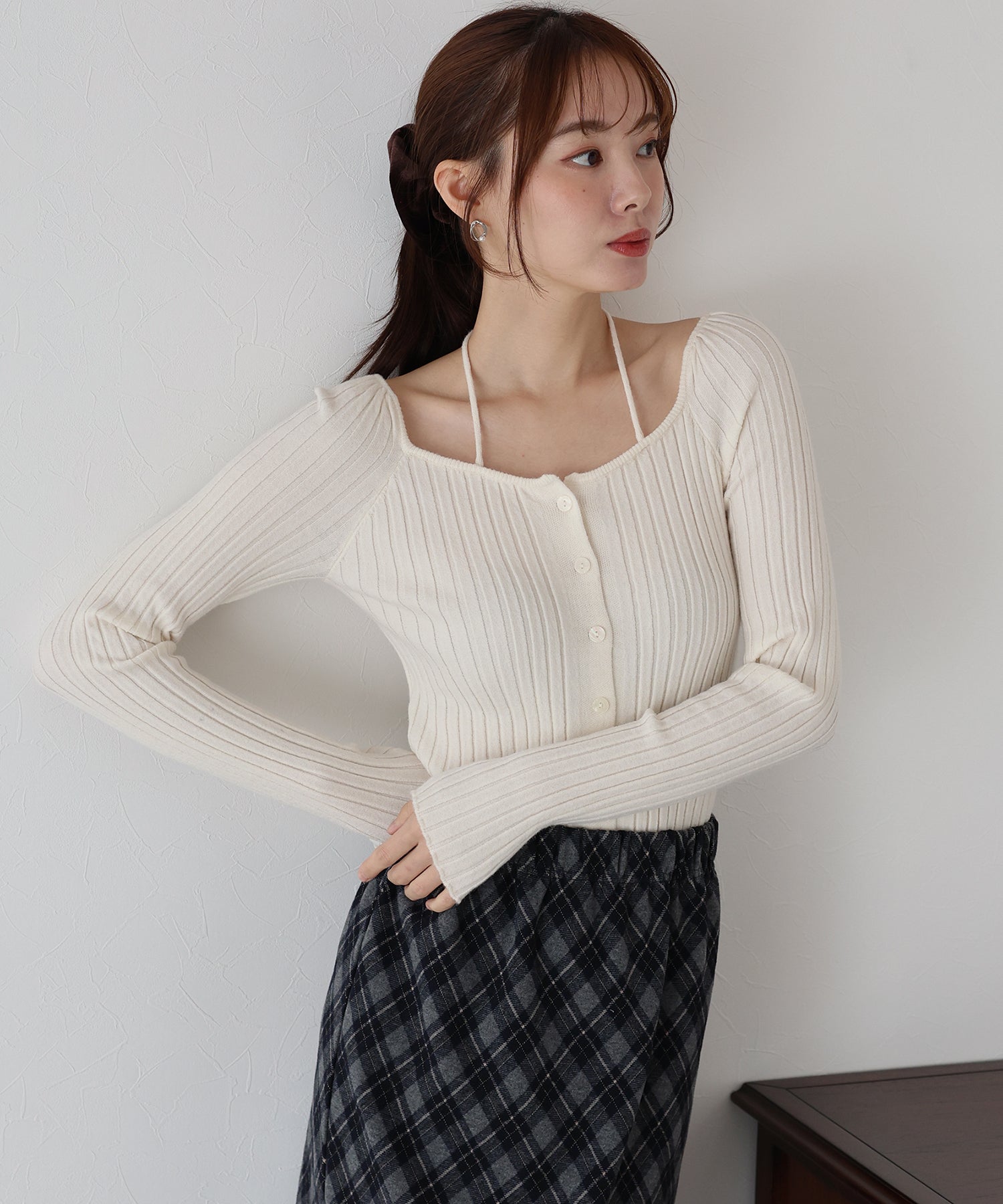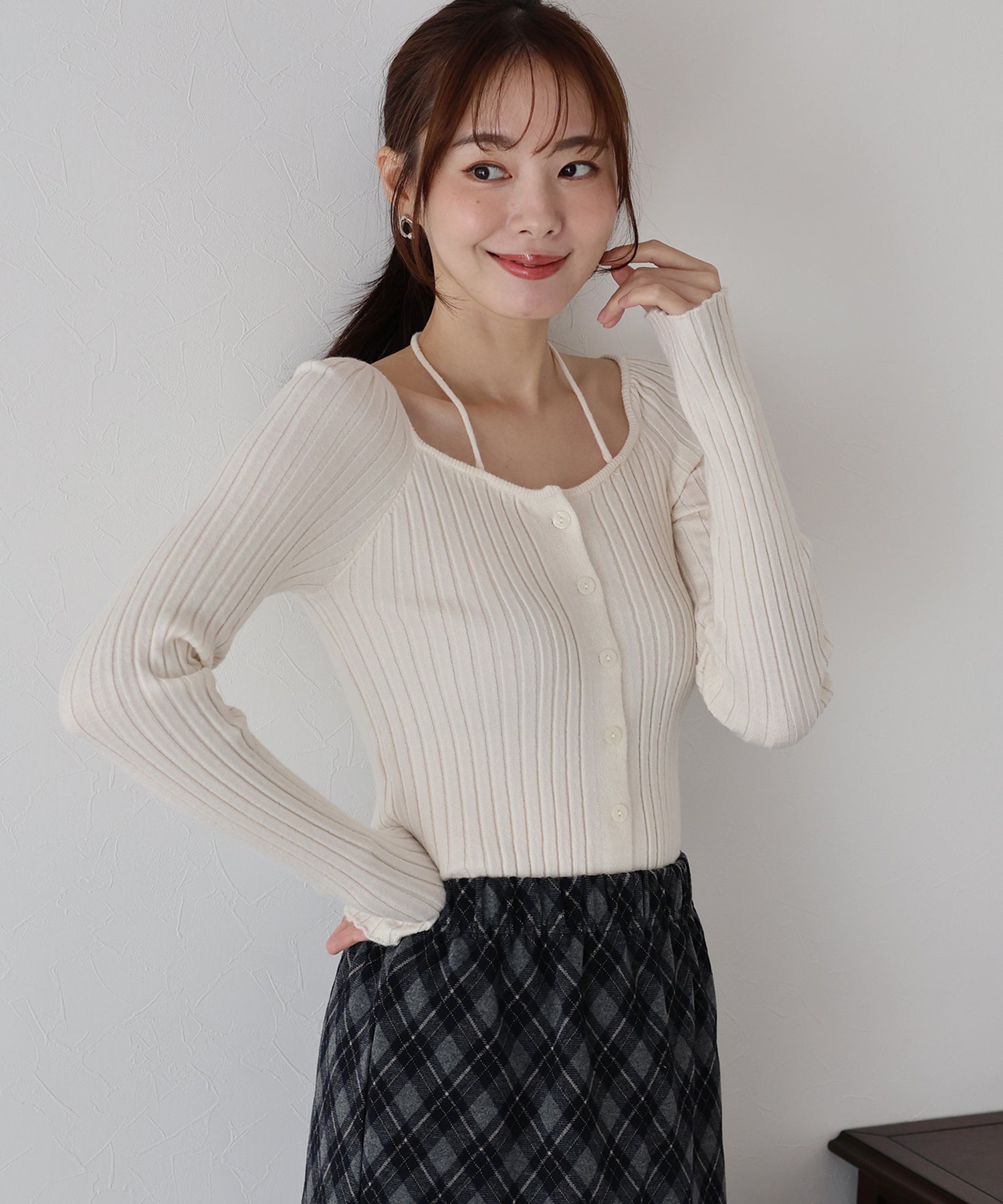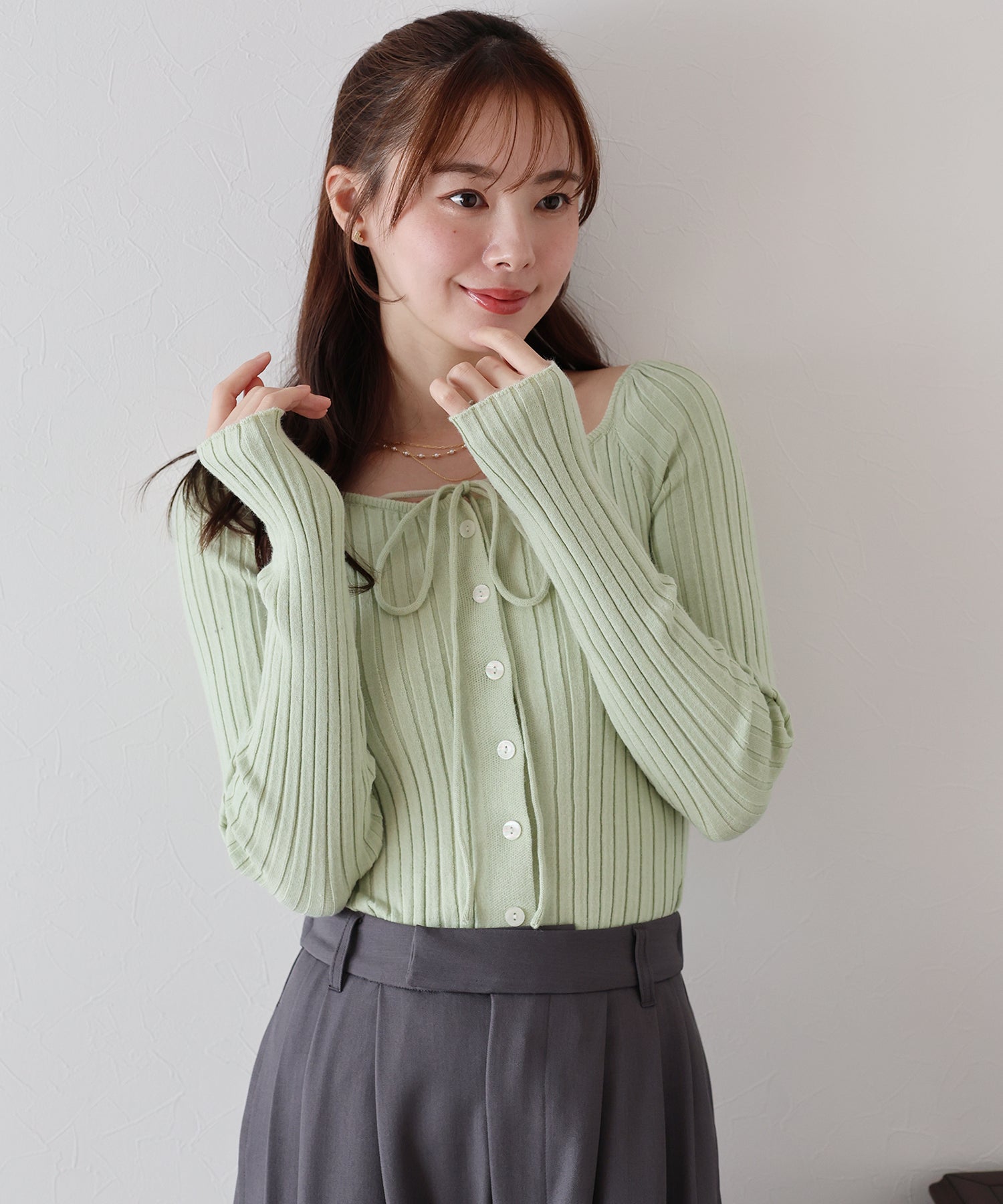 縦リブとボディラインに程よくフィットするシルエットで華奢見せ効果をプラス。