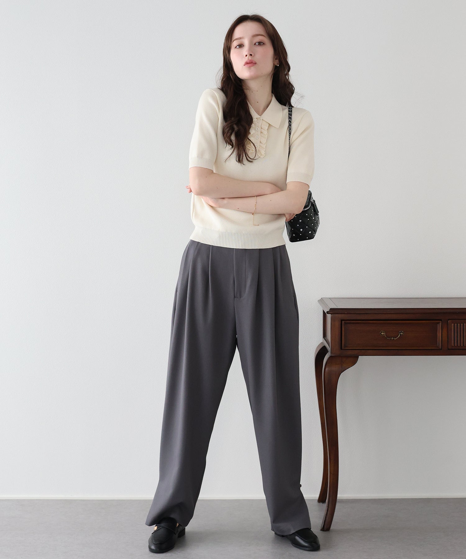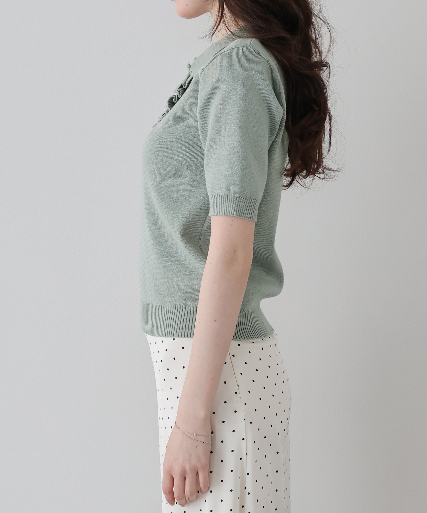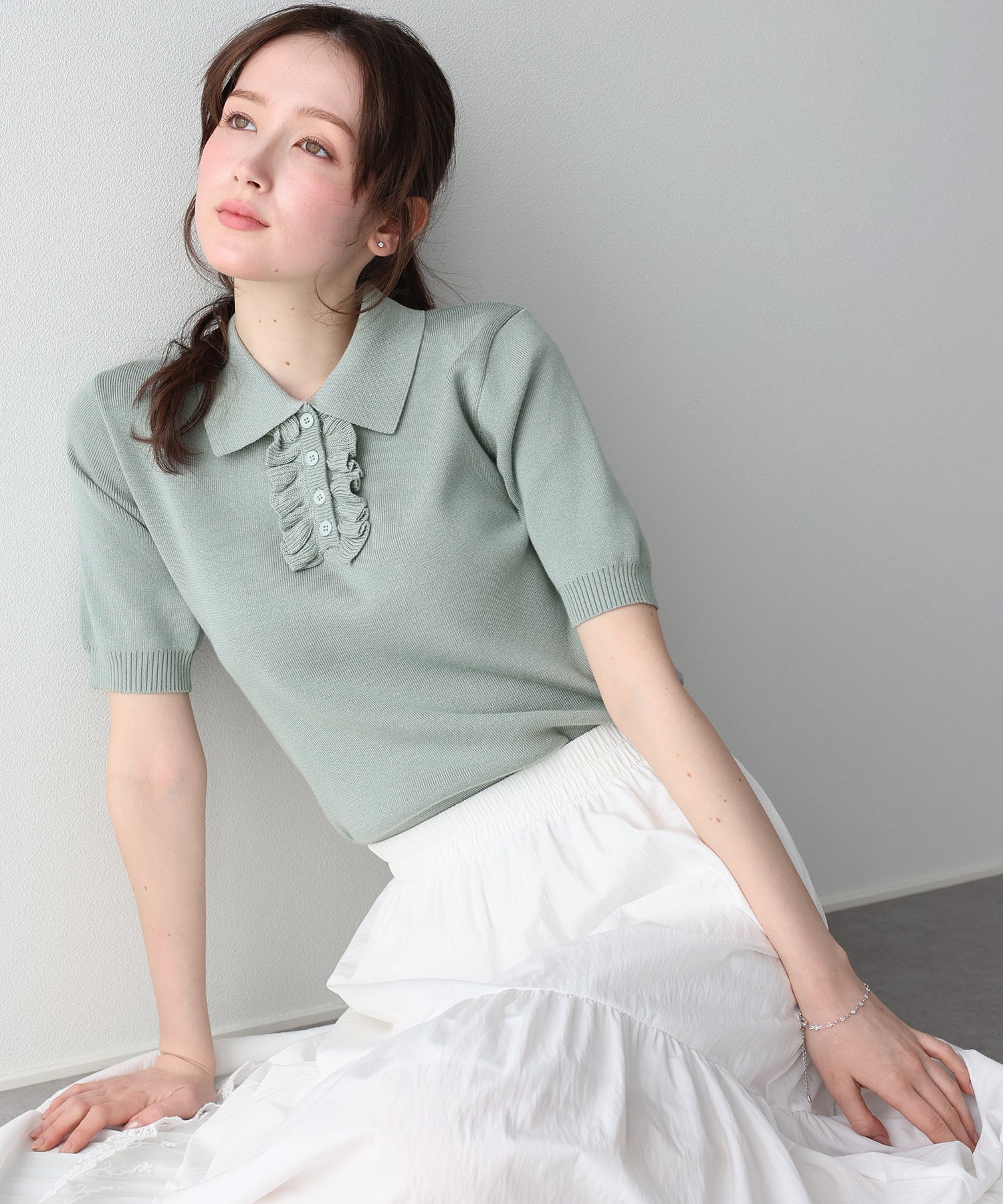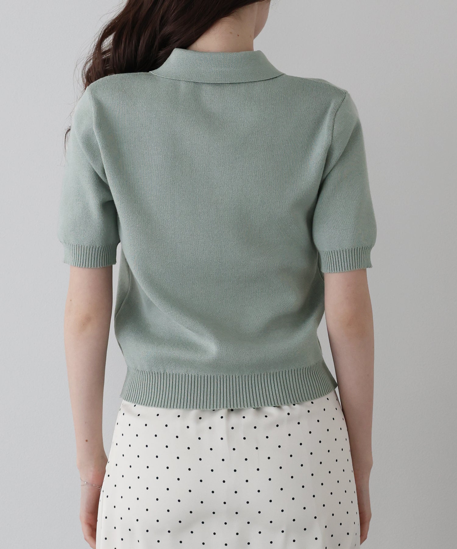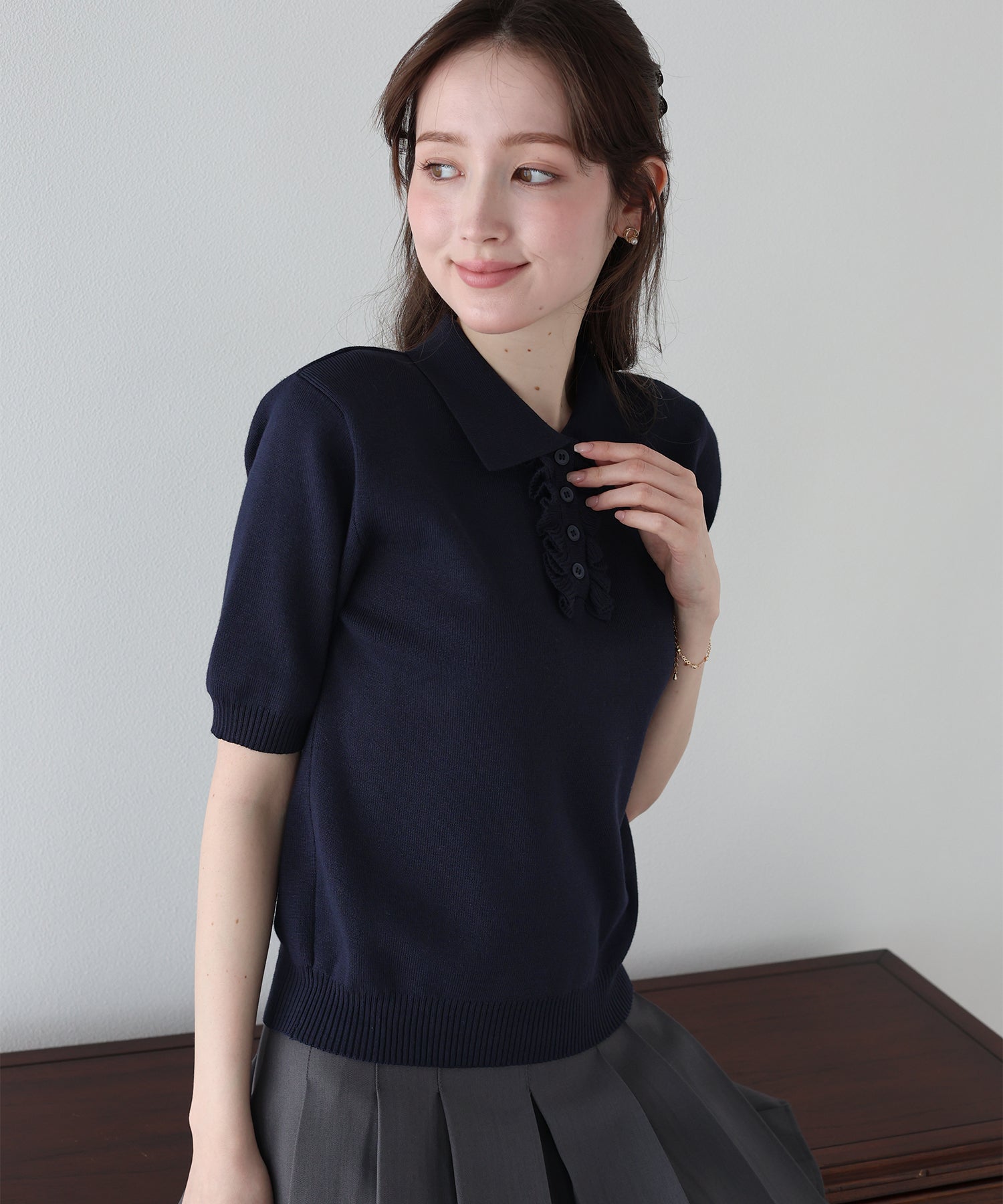 シンプルなポロニットにさりげなくガーリーさをプラスした、大人かわいい一枚です。