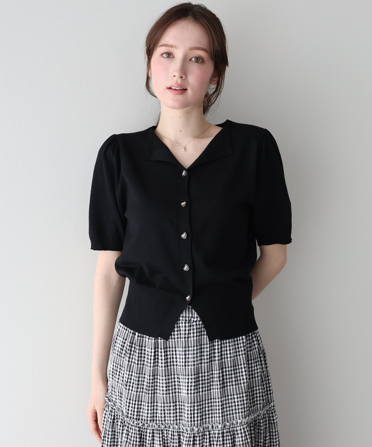 ゴールドのリボン×ハートモチーフのボタンが大人ガーリーな雰囲気を演出するカーディガン。