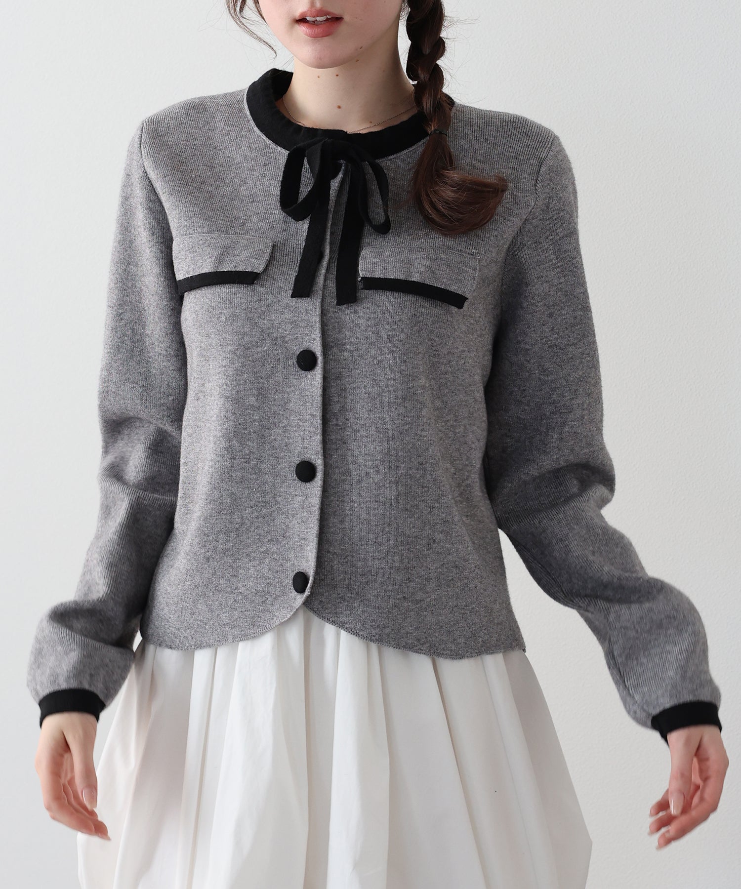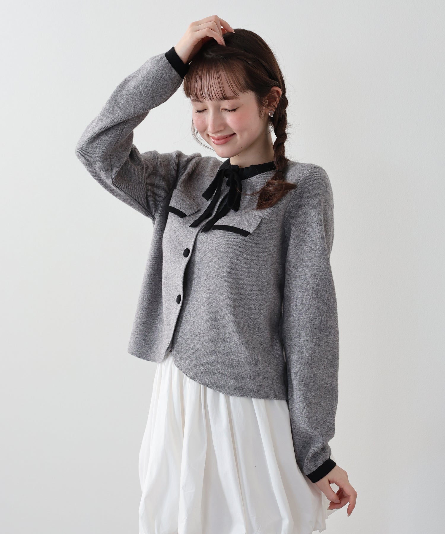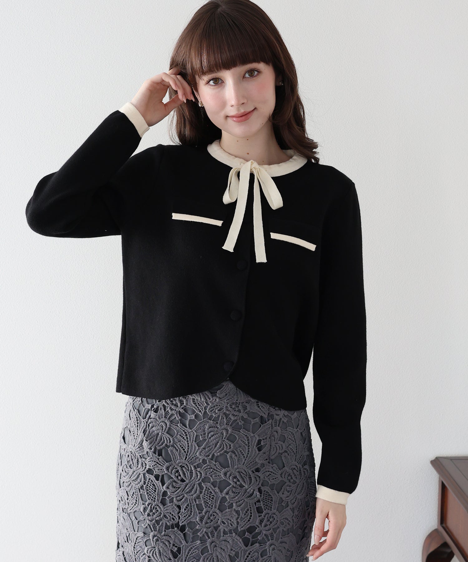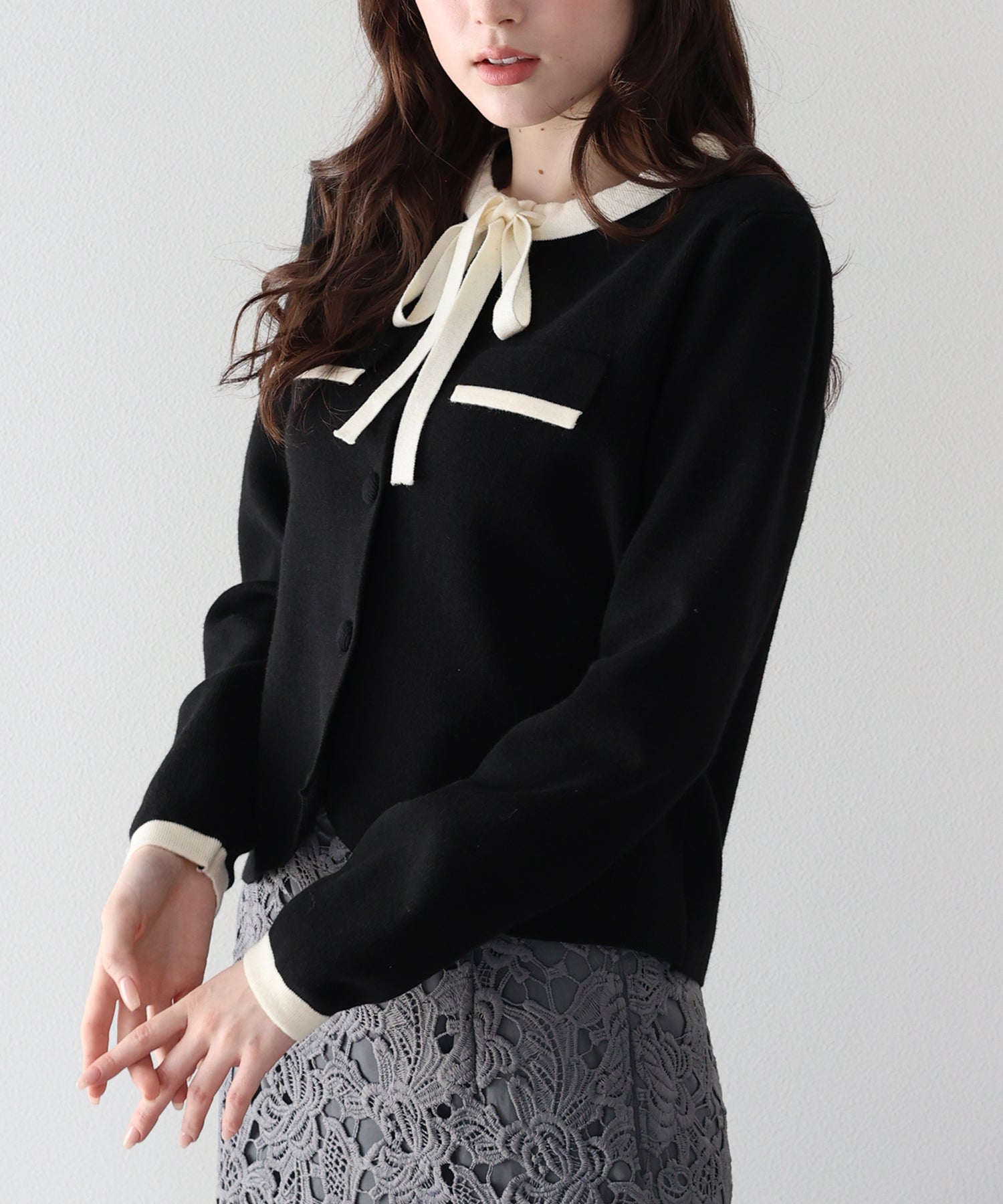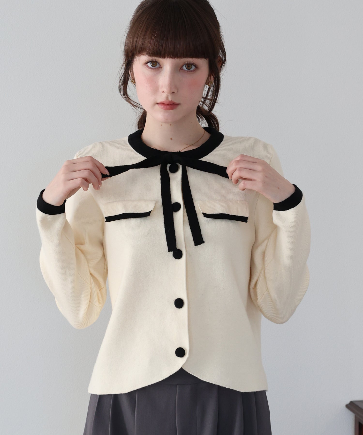 バイカラーのリボンとラインがクラシカルなアクセントを添える、トレンド感のあるリボンニットカーディガン。