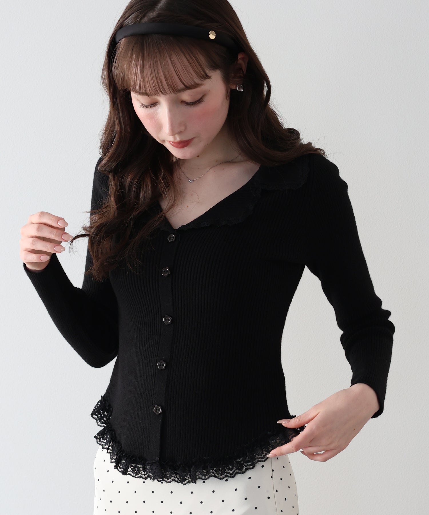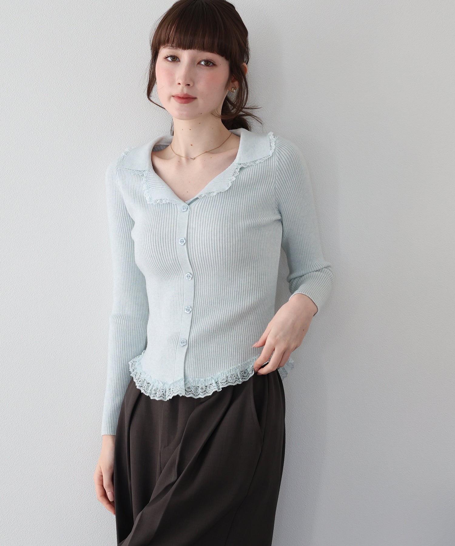 襟元と裾に繊細なレースフリルをあしらった、トレンド感溢れるリブニットトップス。
