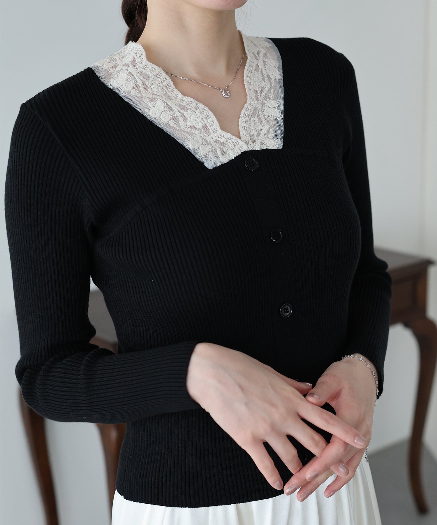 胸元に繊細なレースをドッキングし、一枚でレイヤードスタイルが完成するデザインニット。