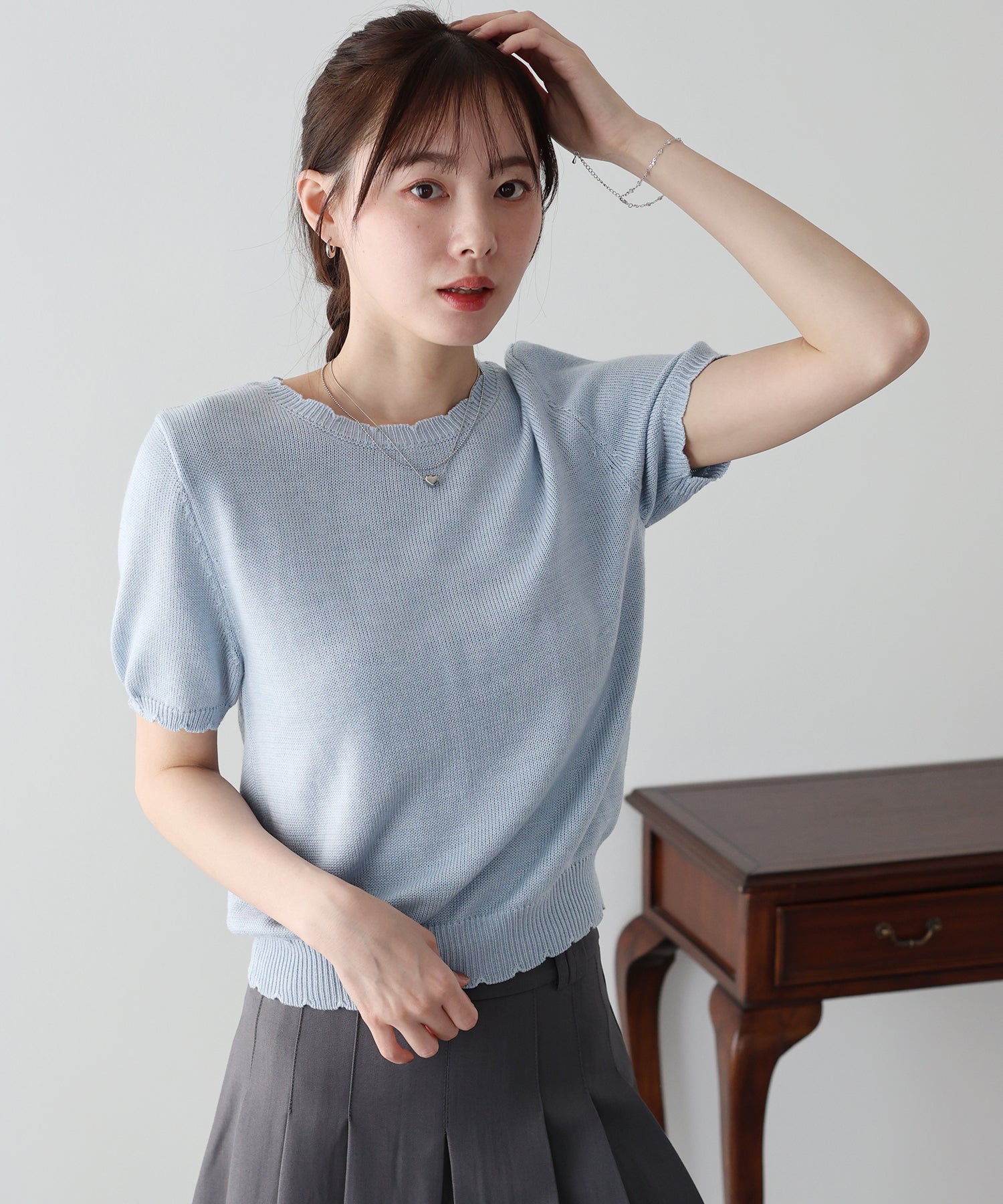 ふんわりとしたフェミニンな魅力を詰め込んだスカラップパフスリーブニット