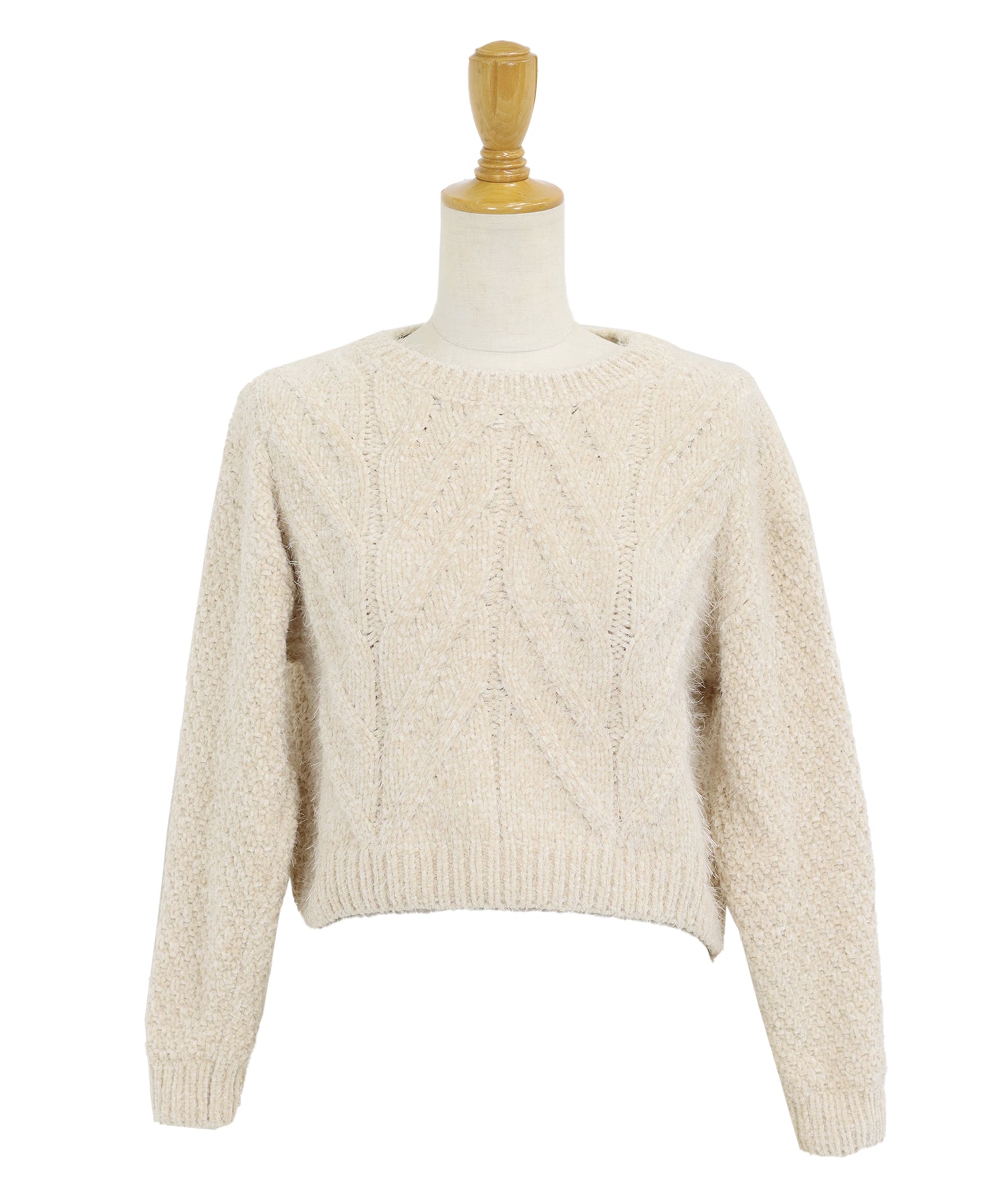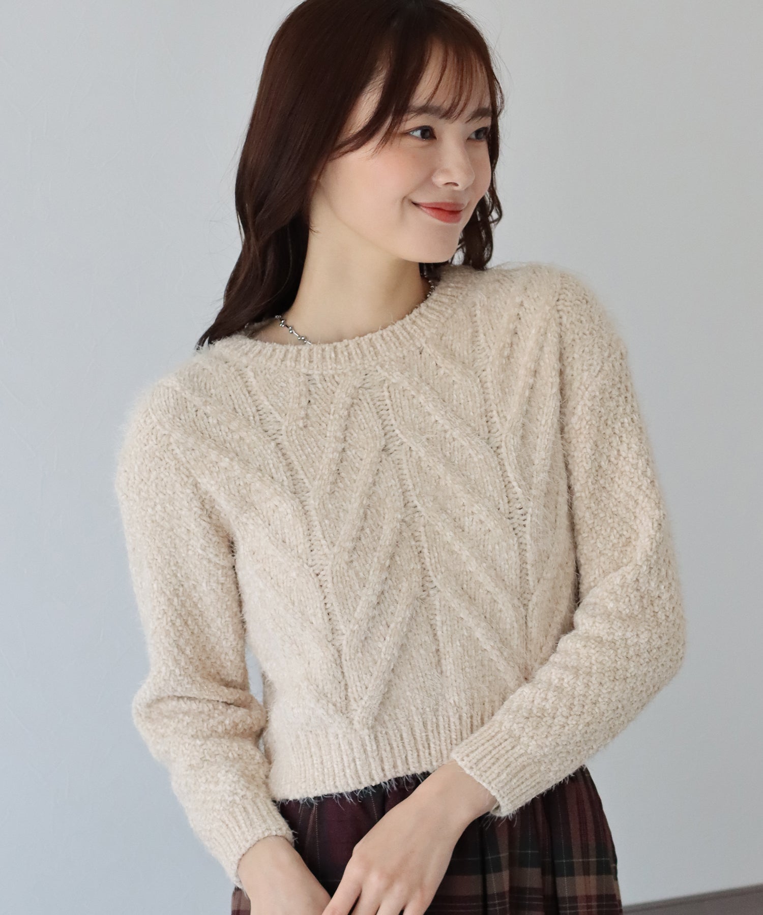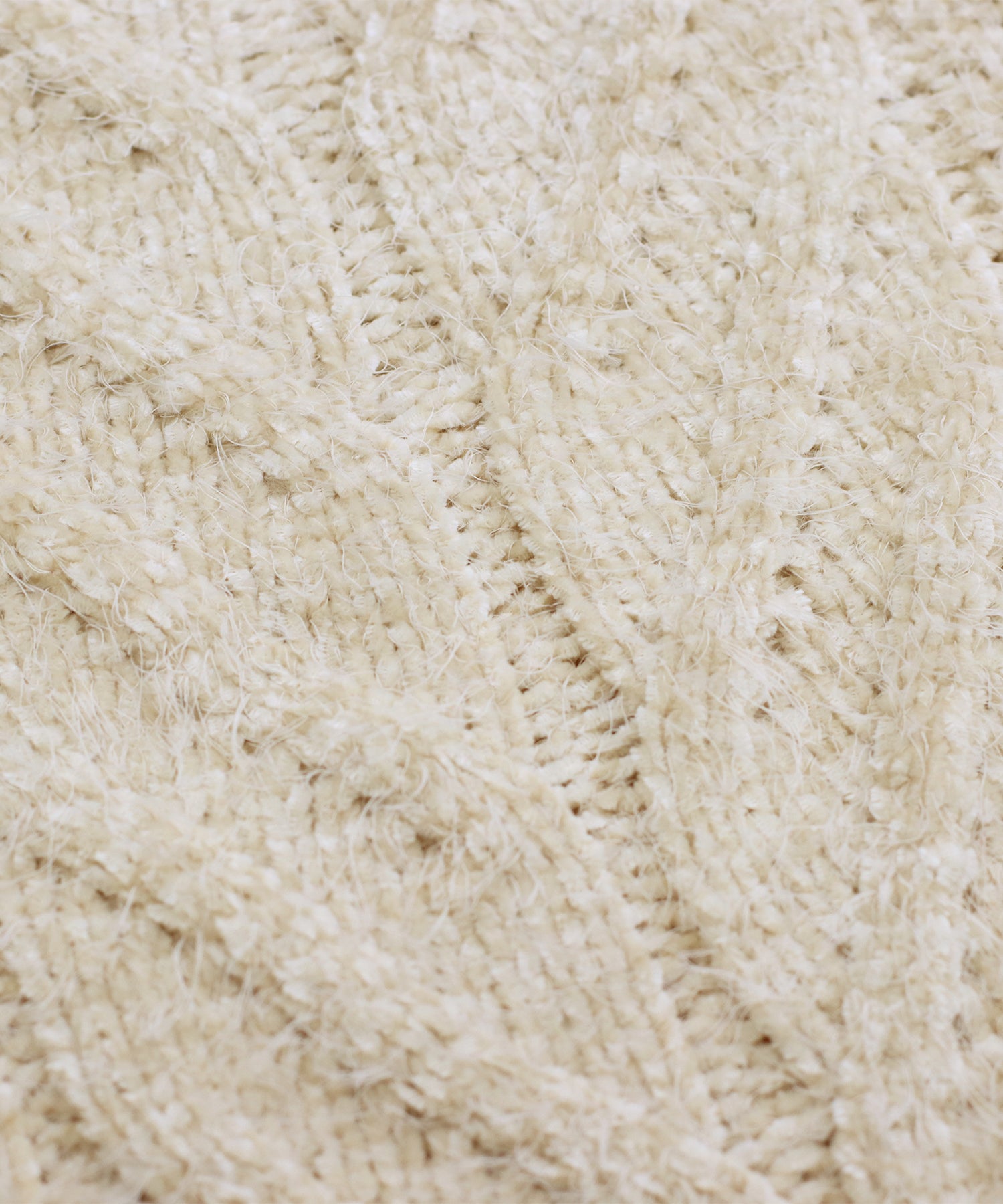 柔らかな肌触りで、暖かく軽い着心地が魅力のモール糸を使用したケーブルニット。