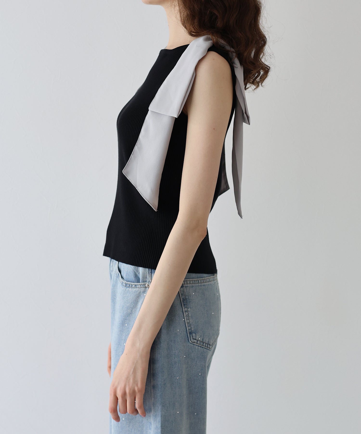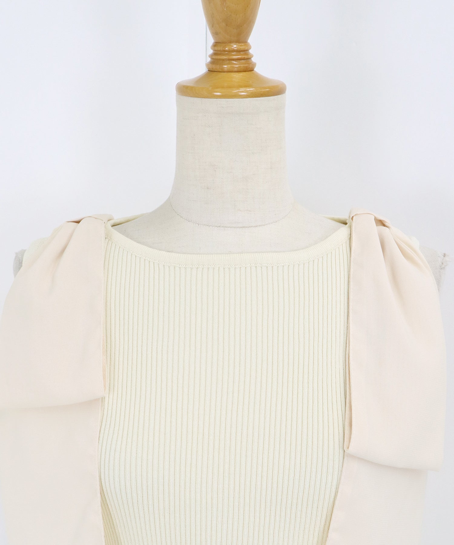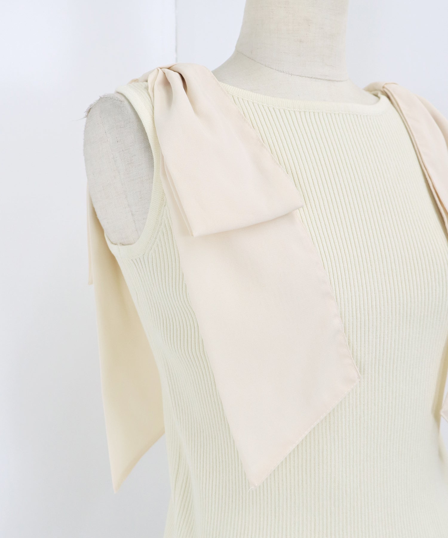 【SALE】ショルダーリボンノースリリブニット