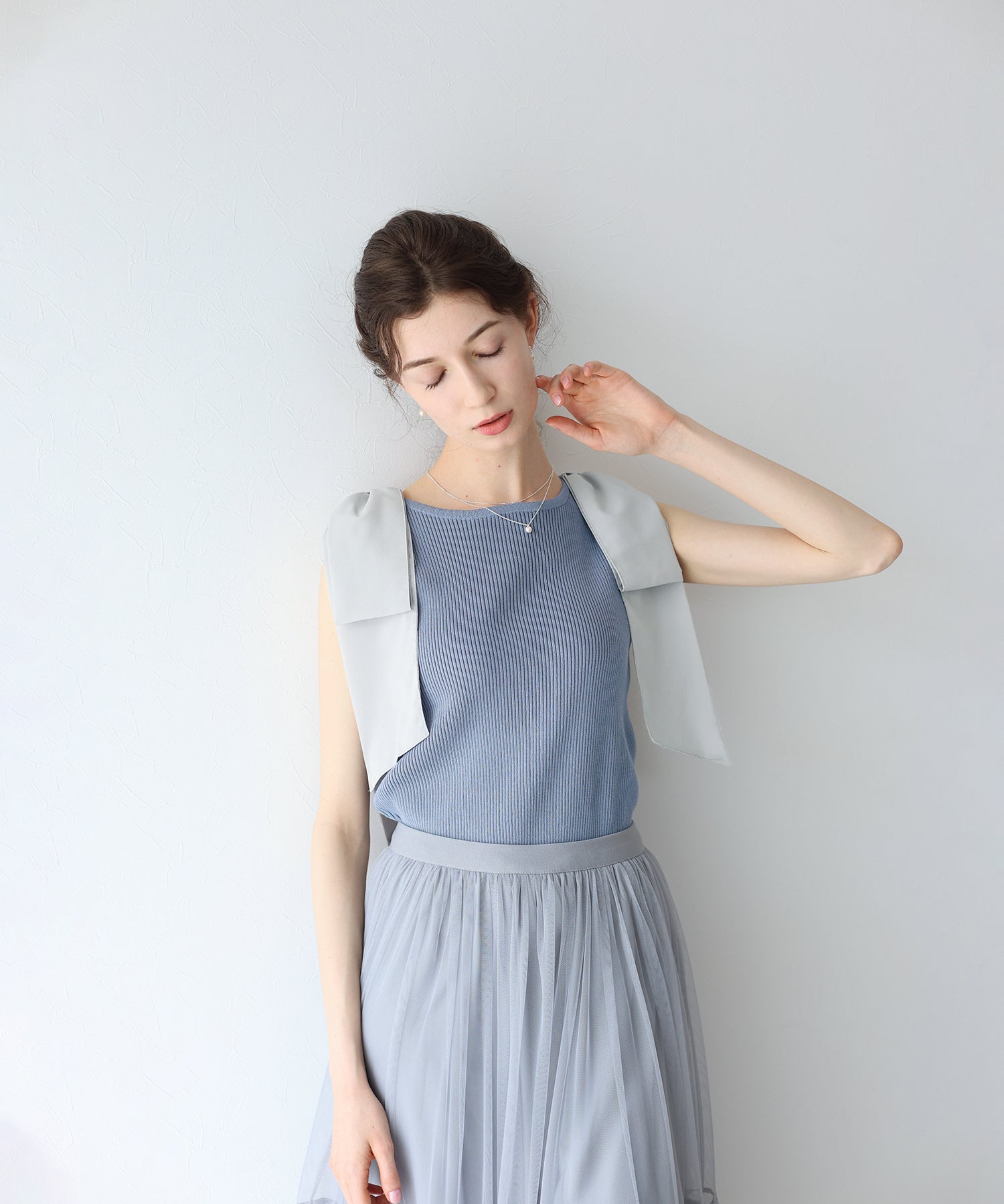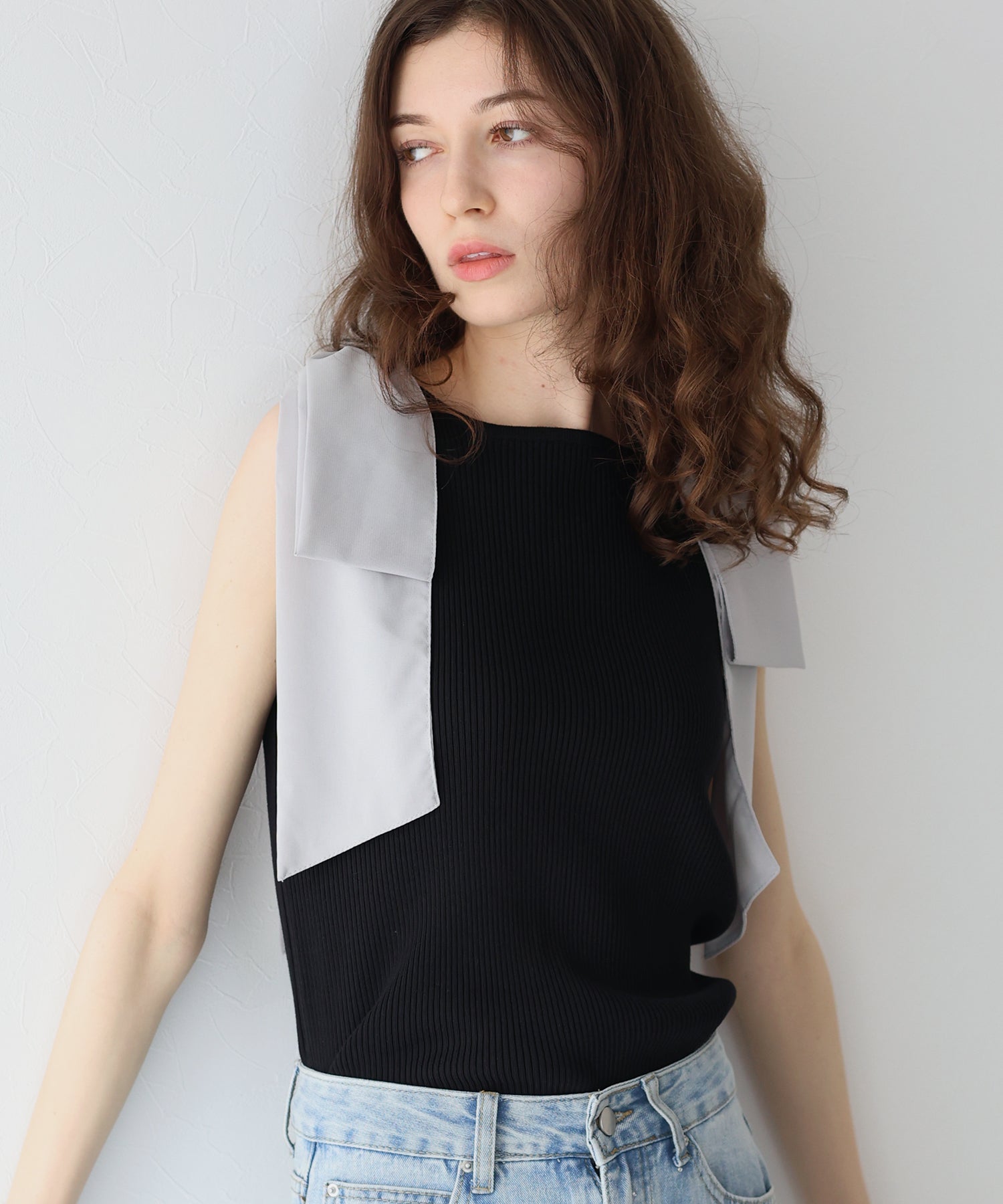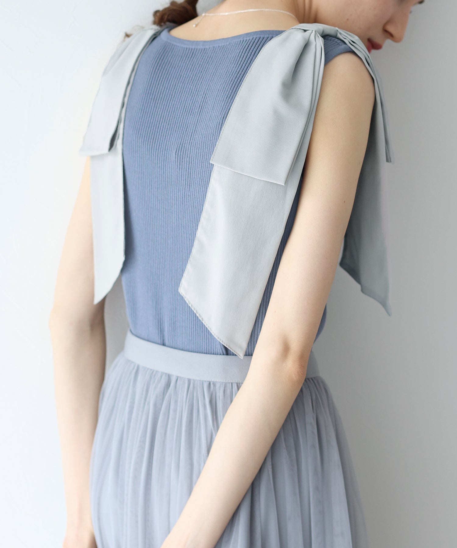【SALE】ショルダーリボンノースリリブニット