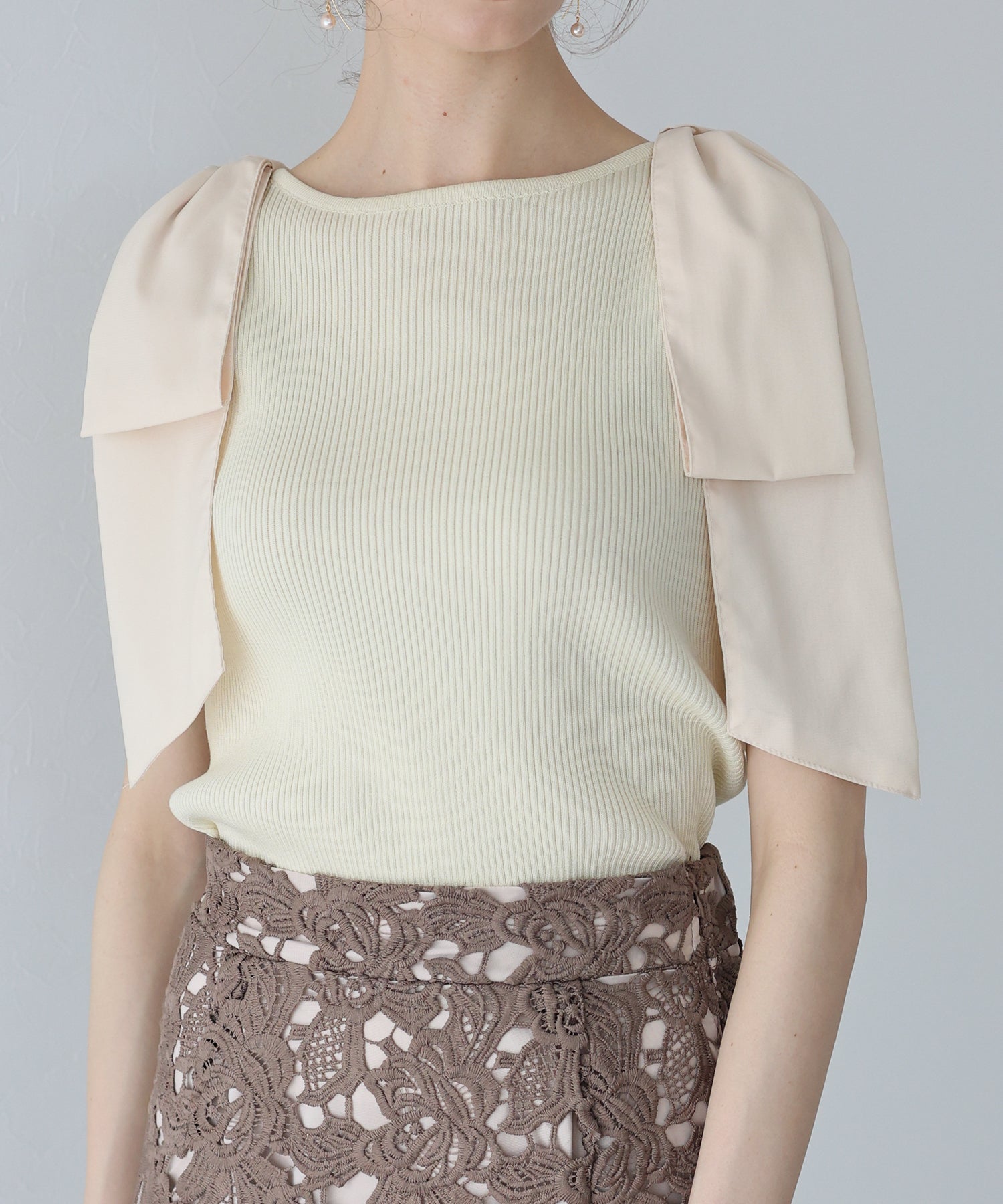 肩部分にビッグリボンをデザインしたラブリーなトップス。