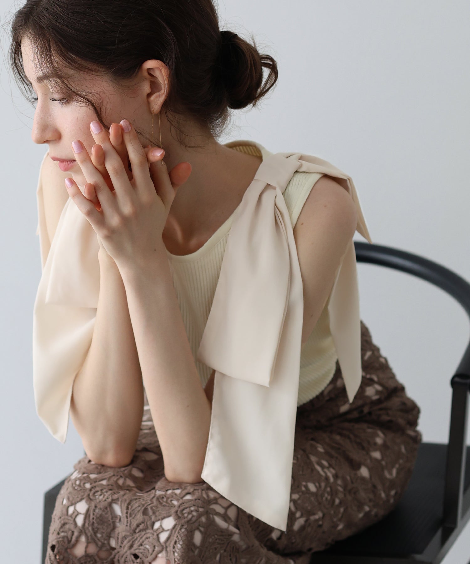 大きめのリボンデザインが顔まわりに華やかさをプラスしてくれます。