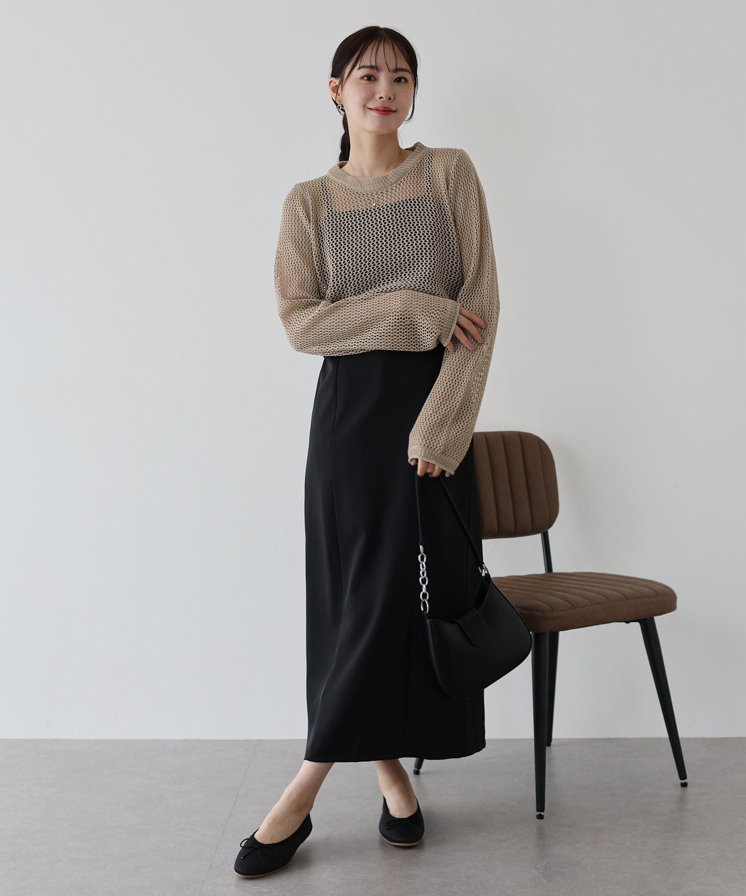 透かし編みなのでインナーのカラーを変えるとまた違う雰囲気のスタイリングを楽しめます。