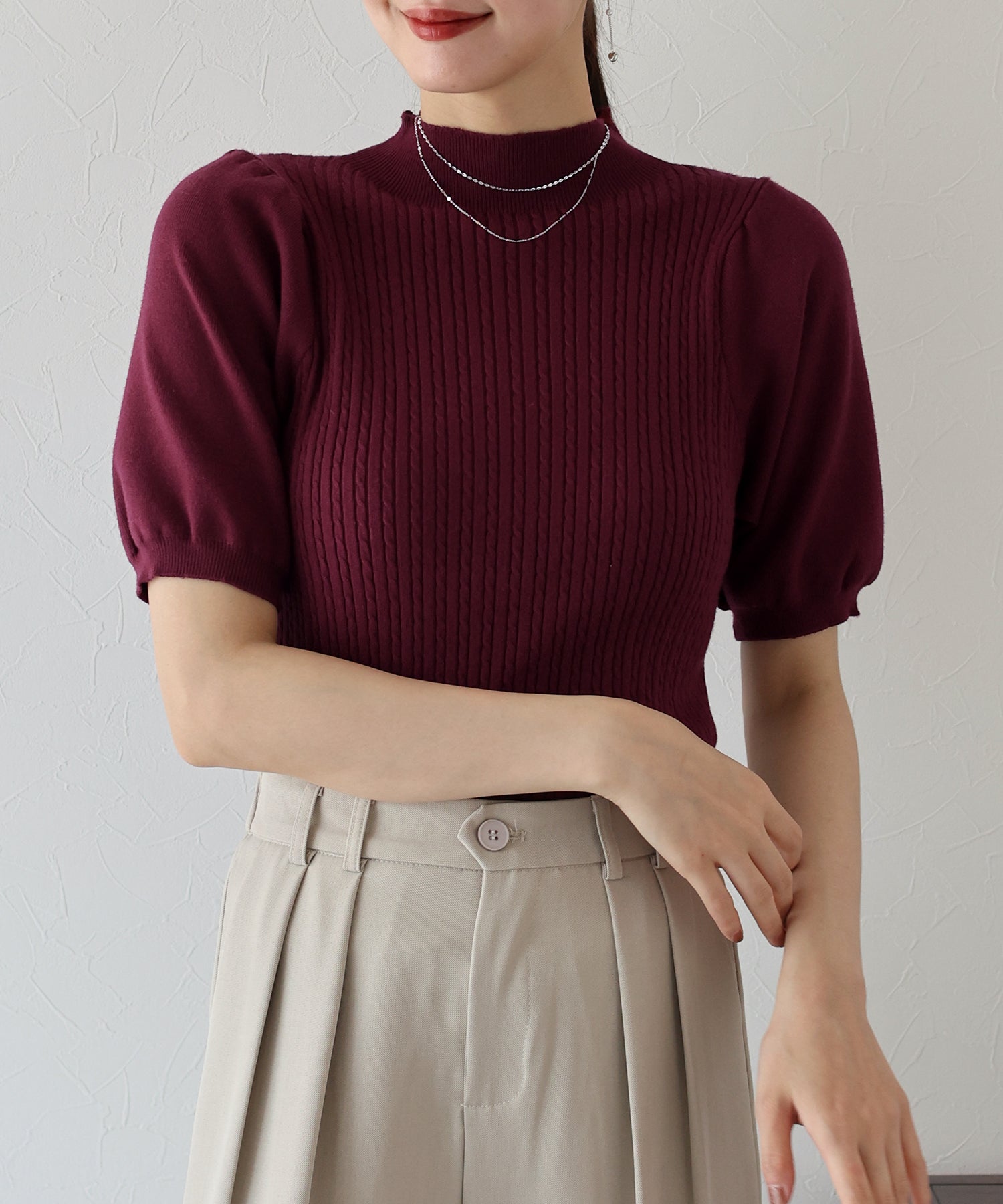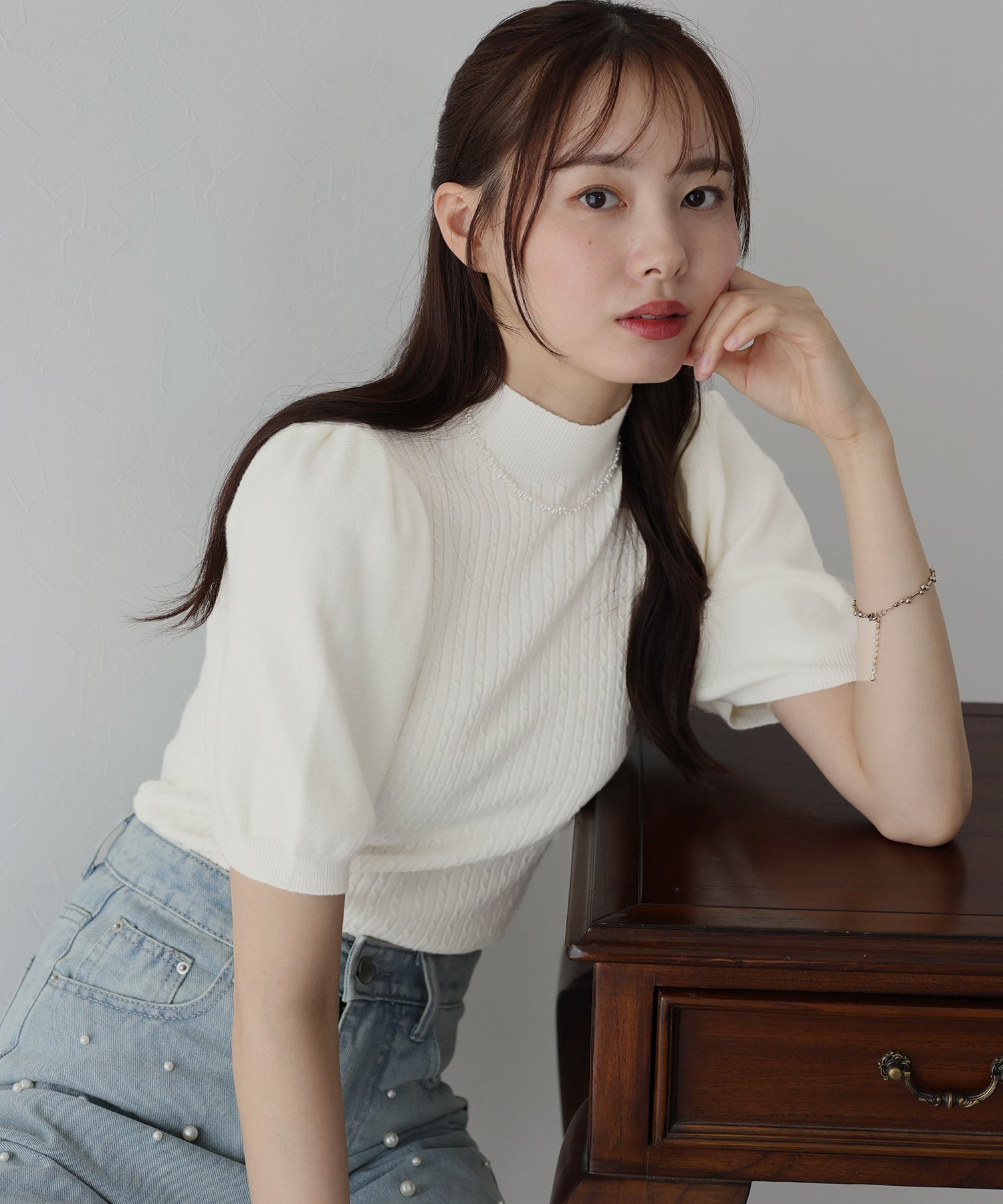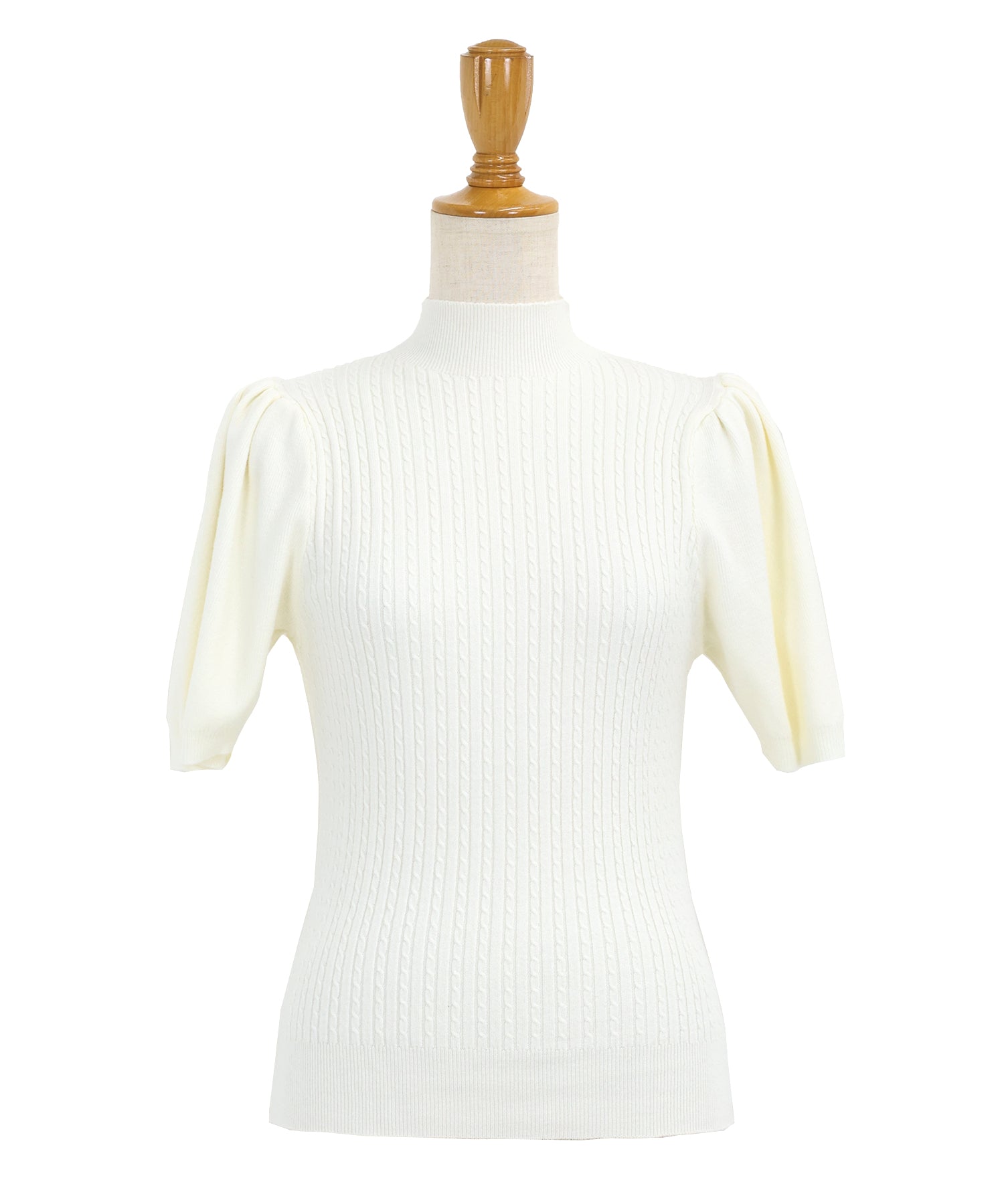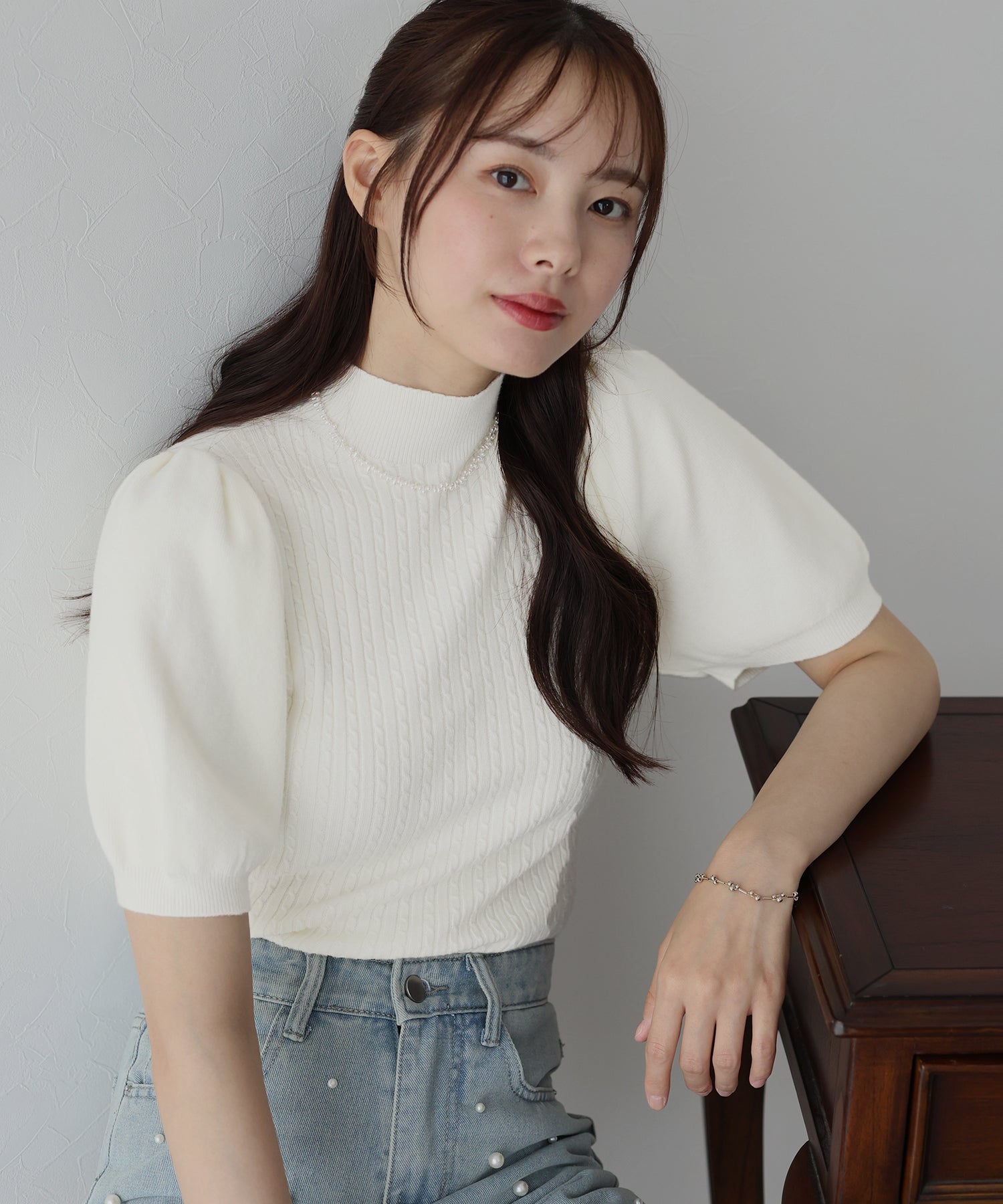 【SALE】パフスリーブ半袖ミニケーブルニット