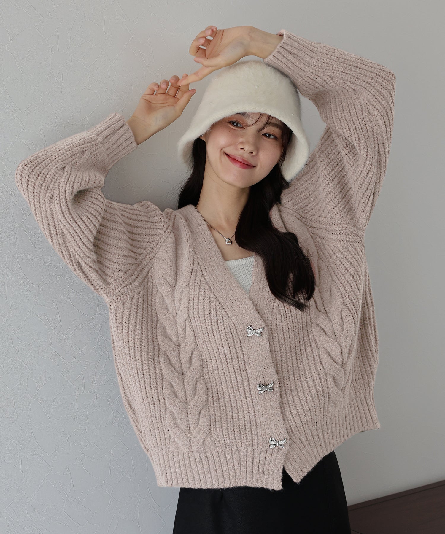 立体的なケーブル編みとビジューのリボンボタンがキュートなニットカーディガン。