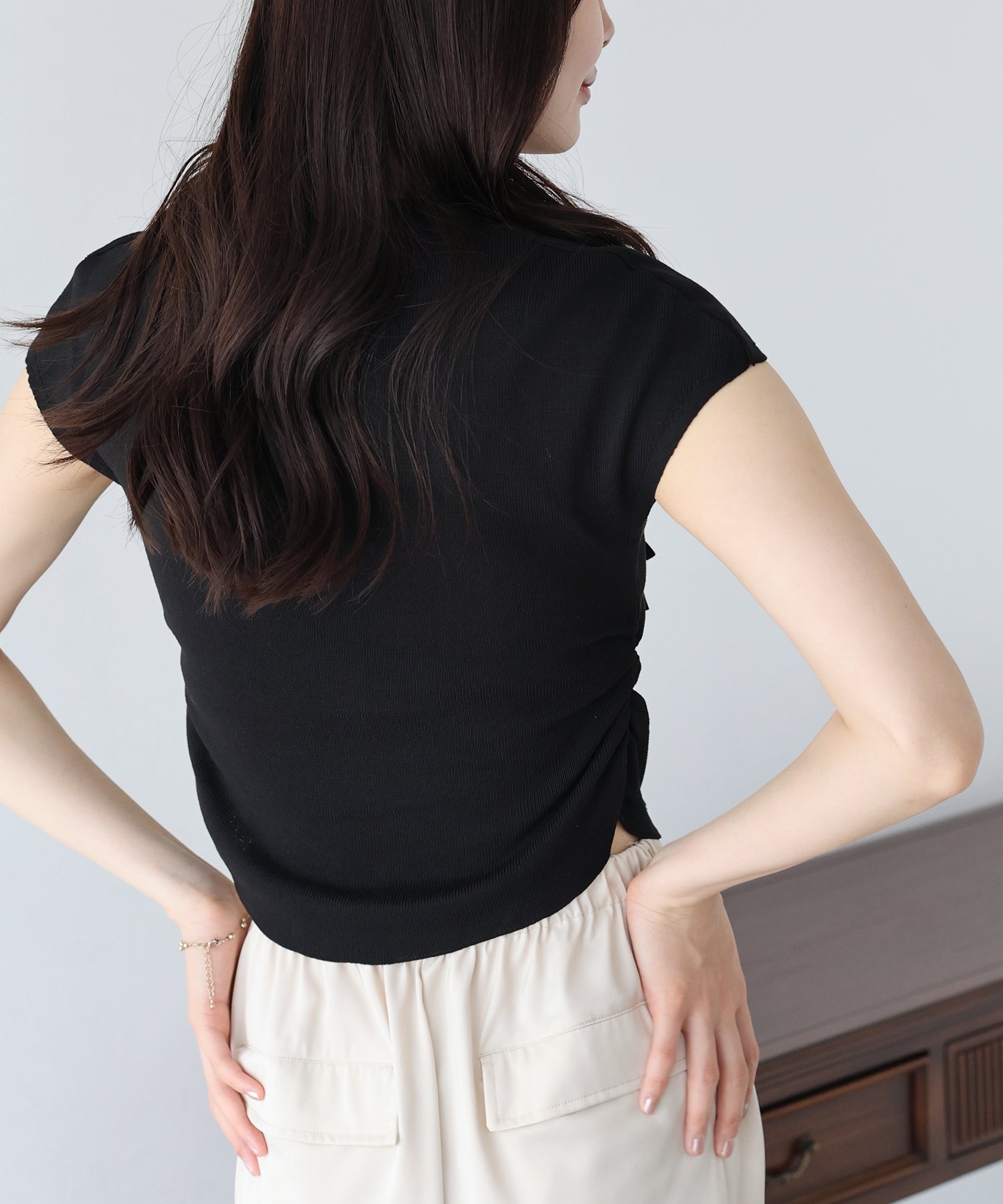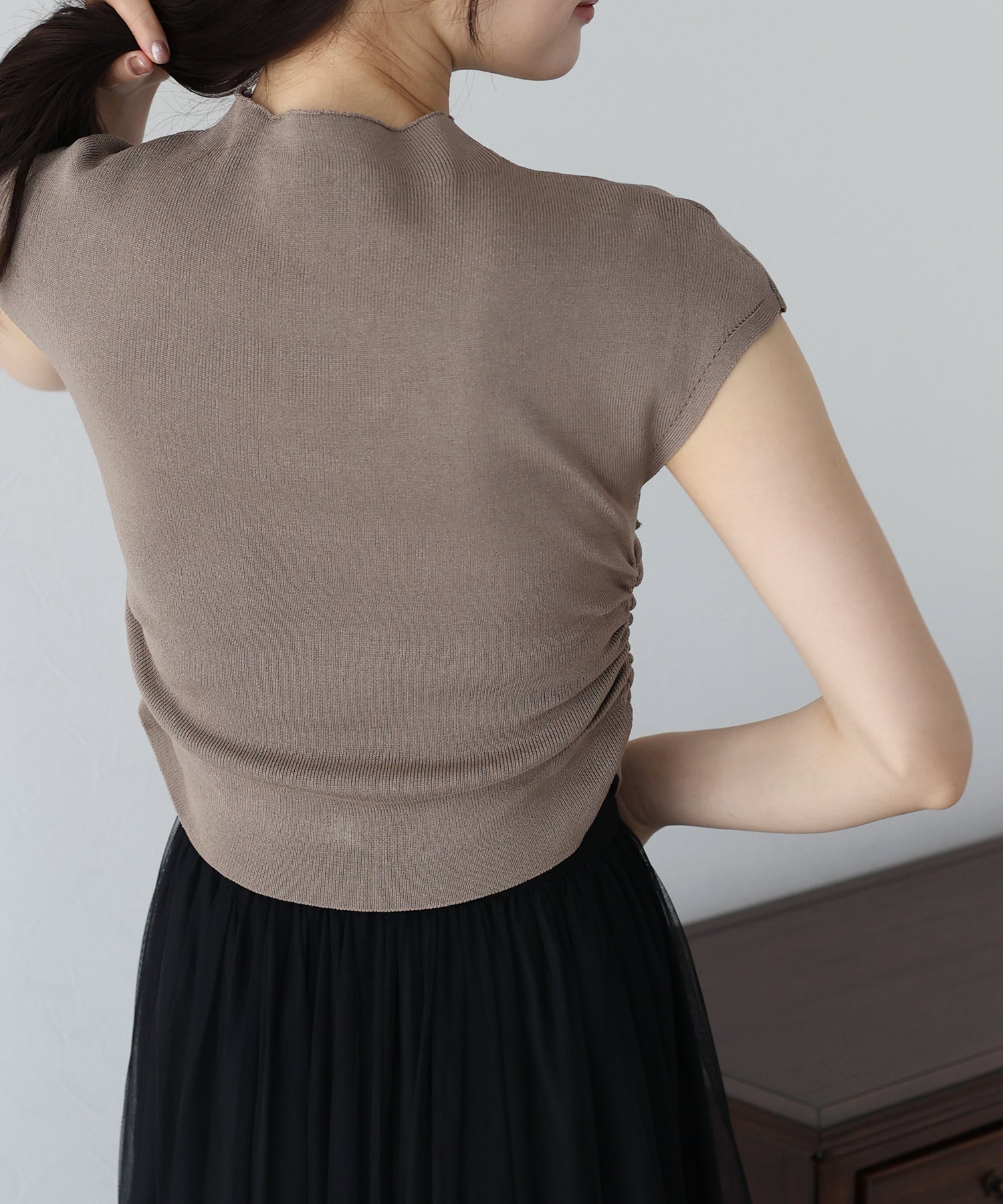 フレンチスリーブとハイネックデザインで女性らしさを加え、サイドシャーリングで身体のラインを綺麗に見せます。