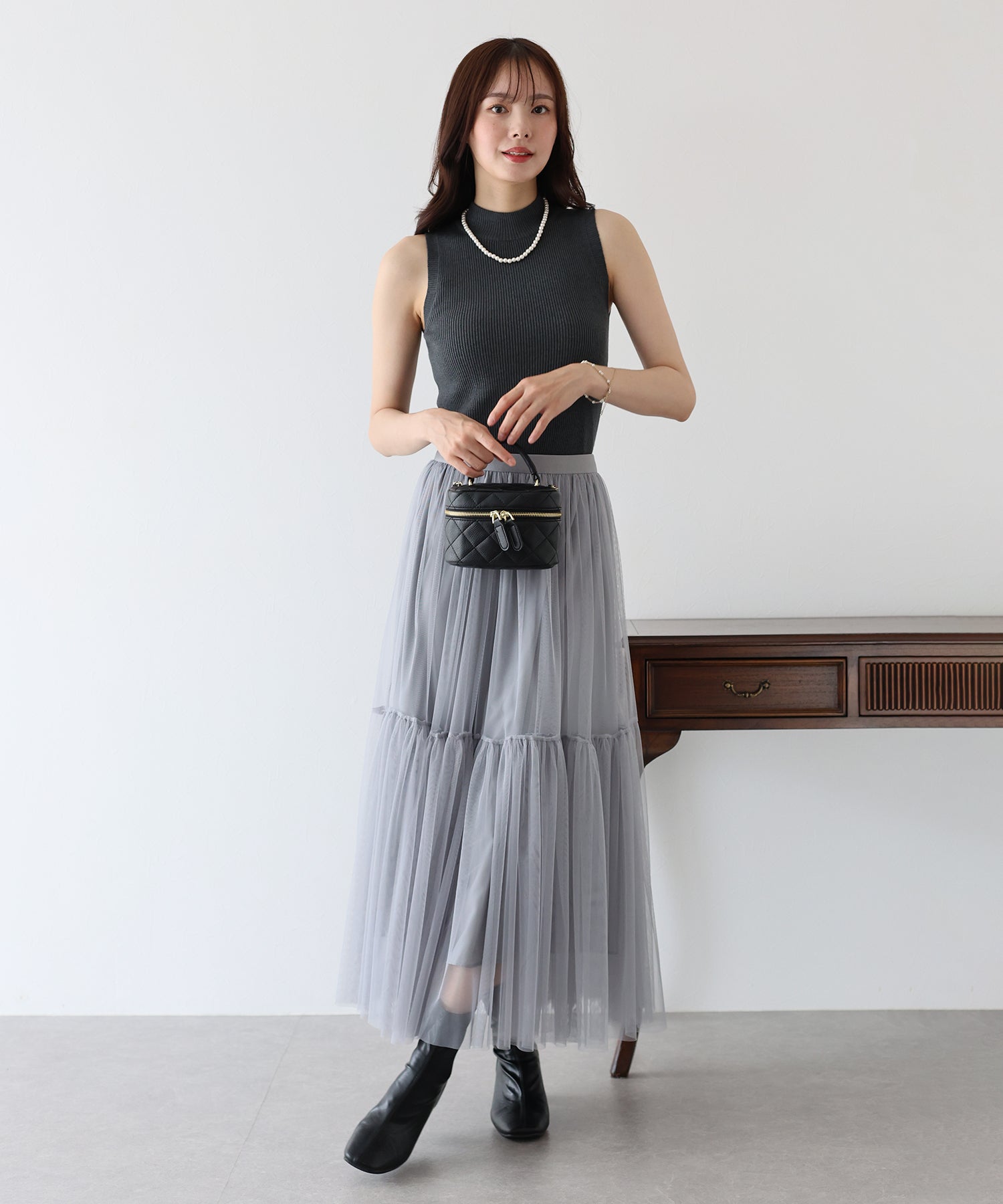 チュールやティアードスカートなどボリューム感のあるボトムスに合わせるとシルエットにメリハリが出て、バランスよく着こなせます。