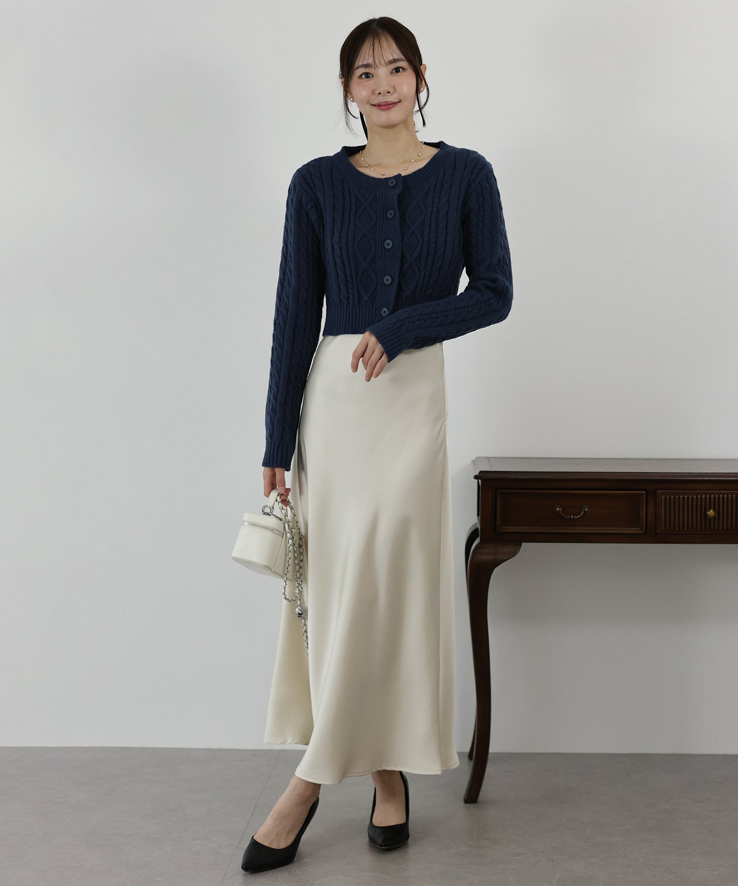 シンプルなボトムスに合わせるだけでも、ケーブル編みがアクセントになり華やかな印象。