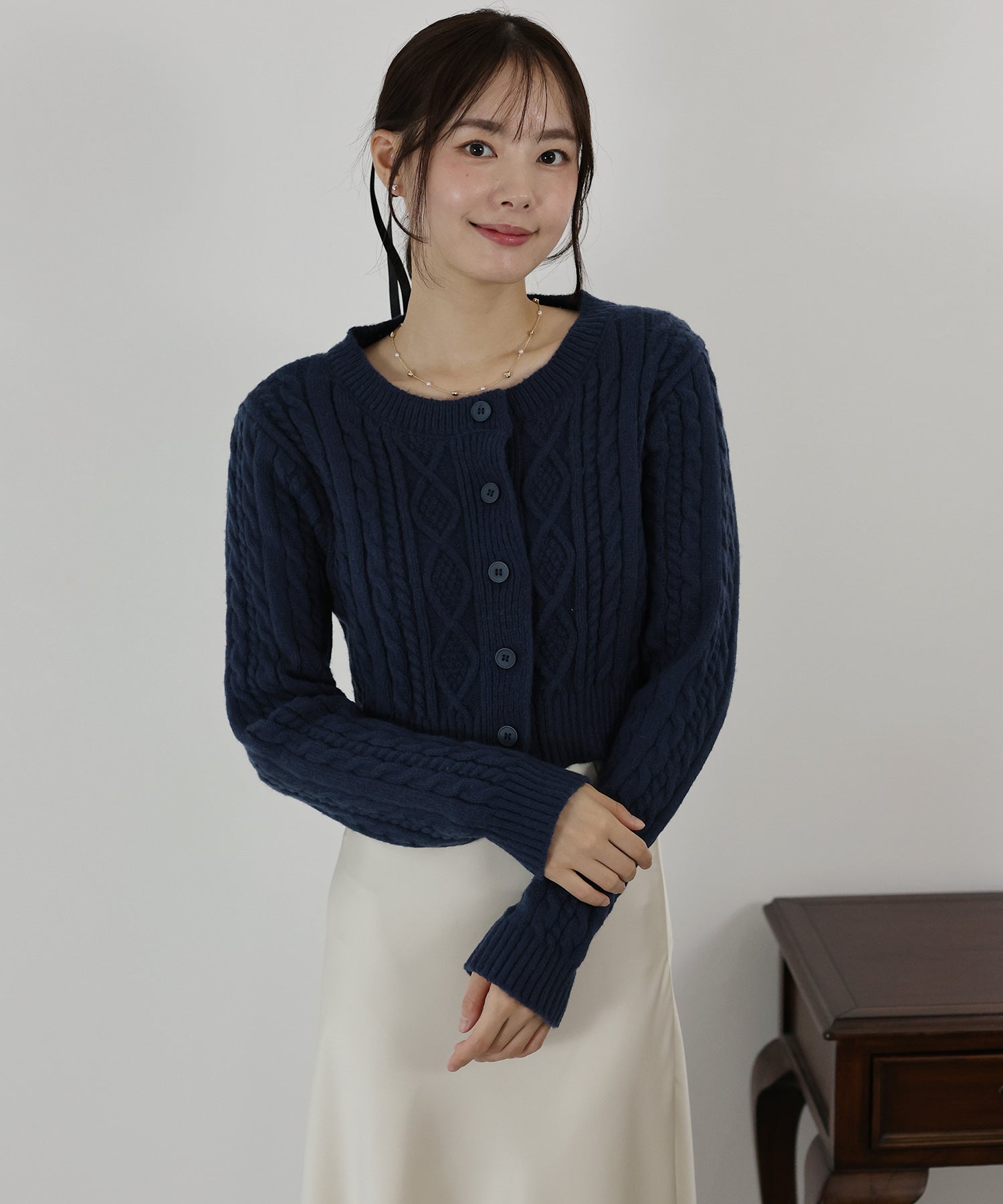 ケーブル編みできれいめな印象のショート丈ニットカーディガン。
