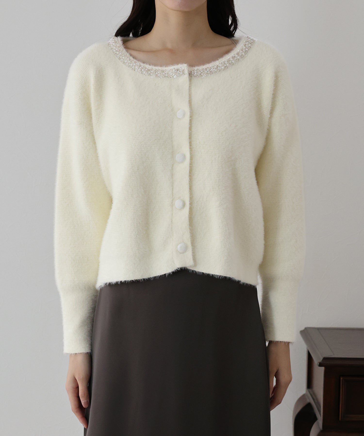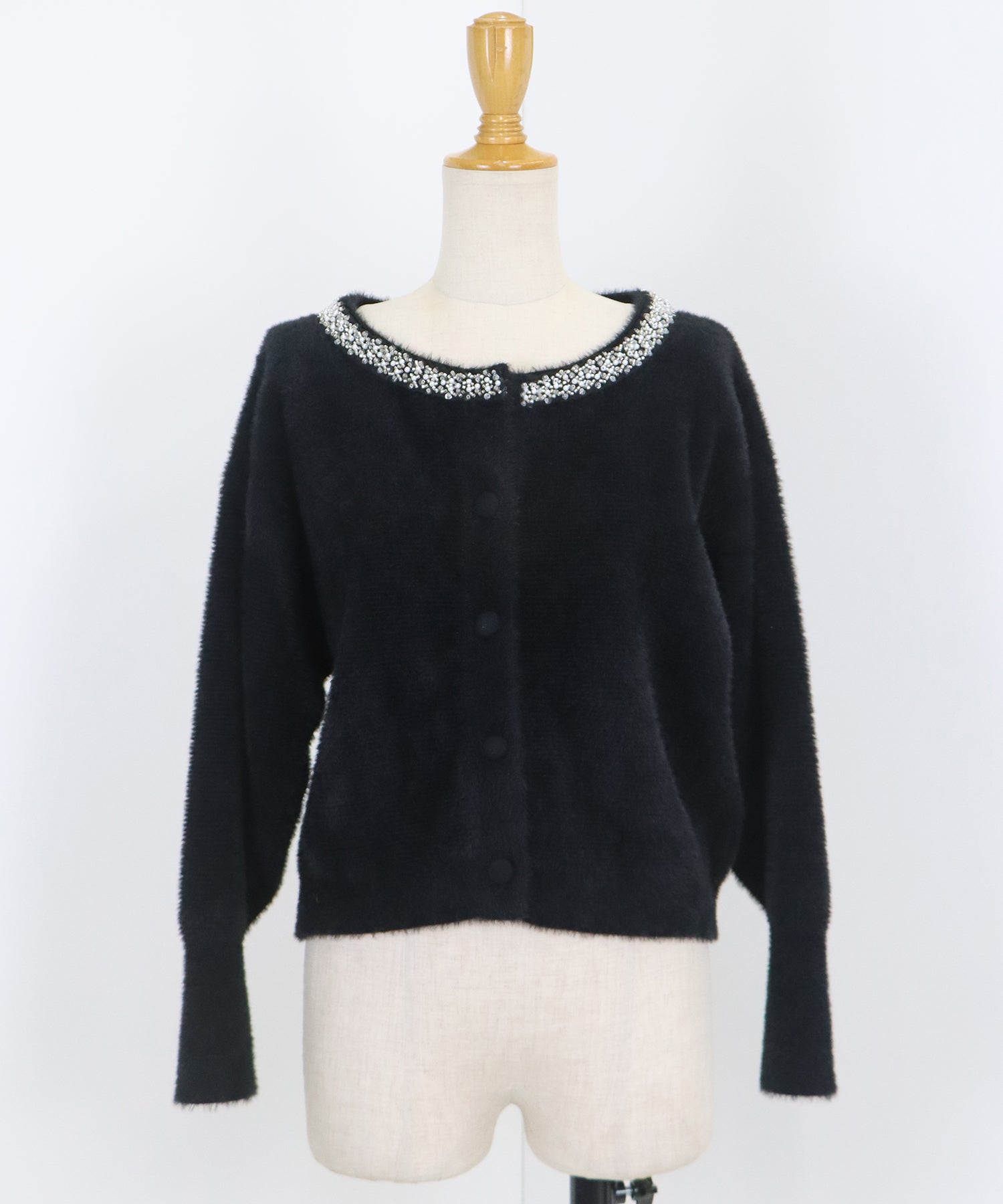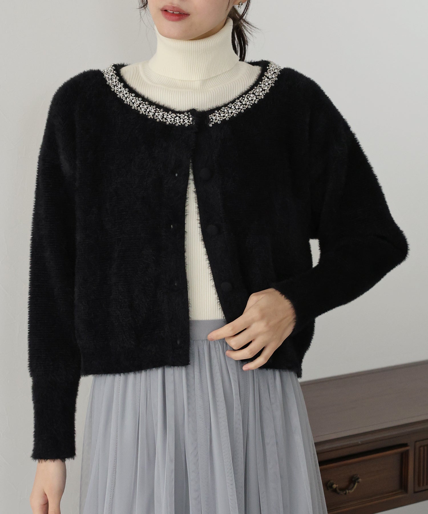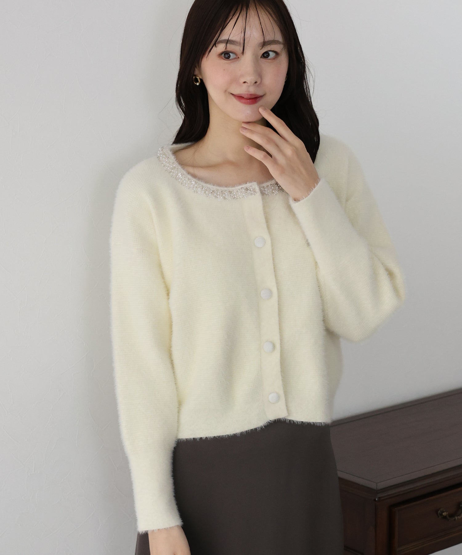 ビジューをあしらった華やかな印象のニットカーディガン。
