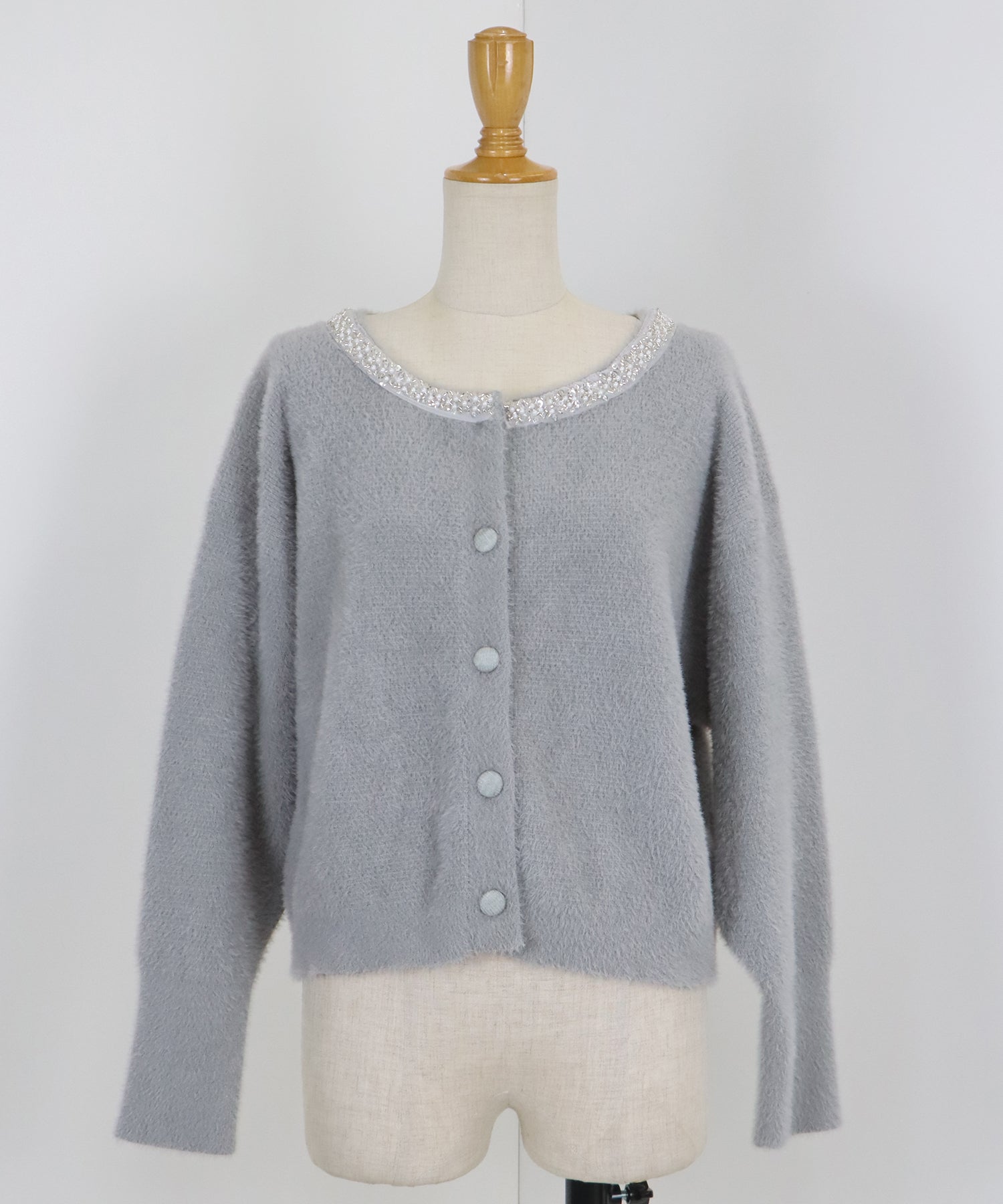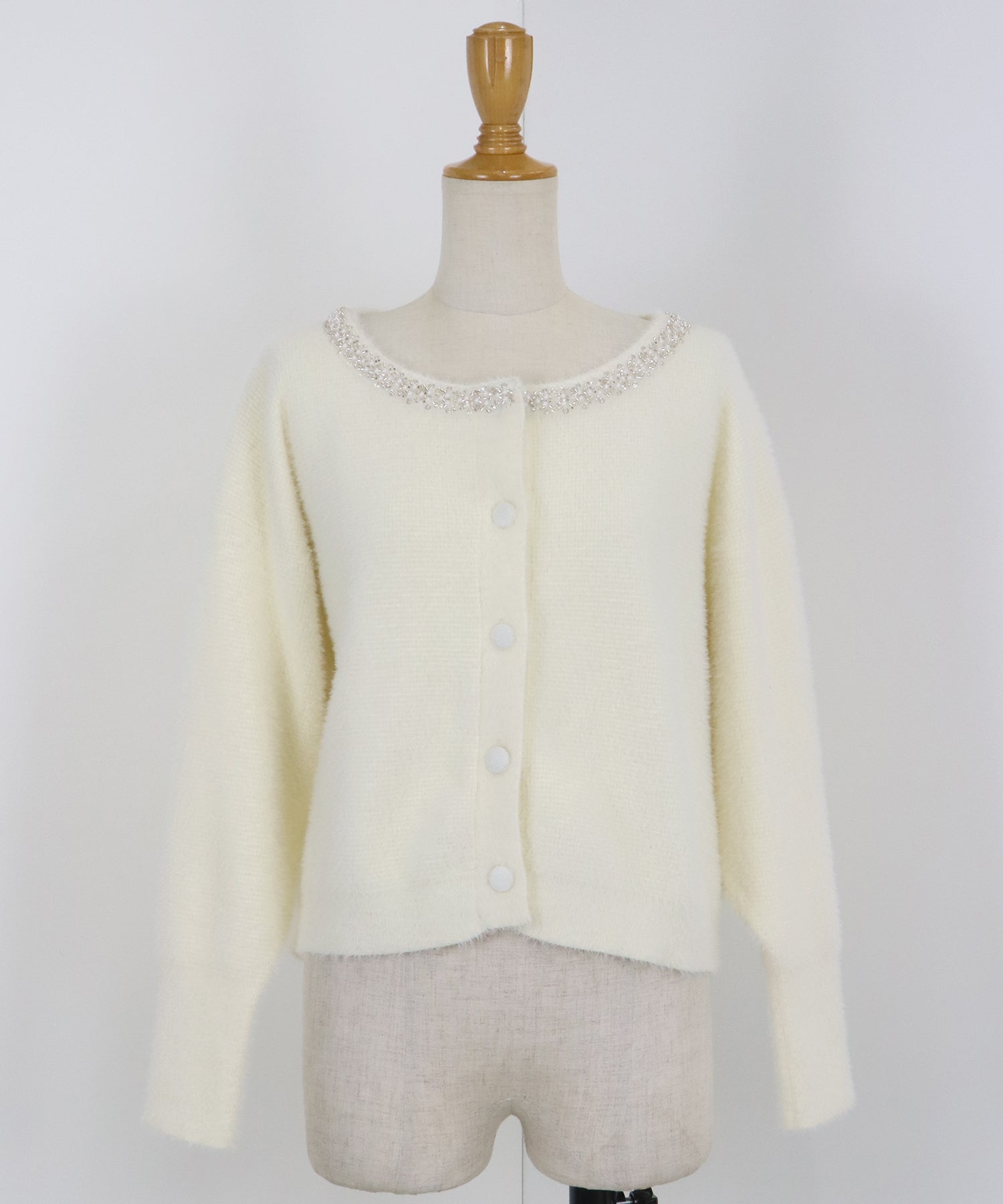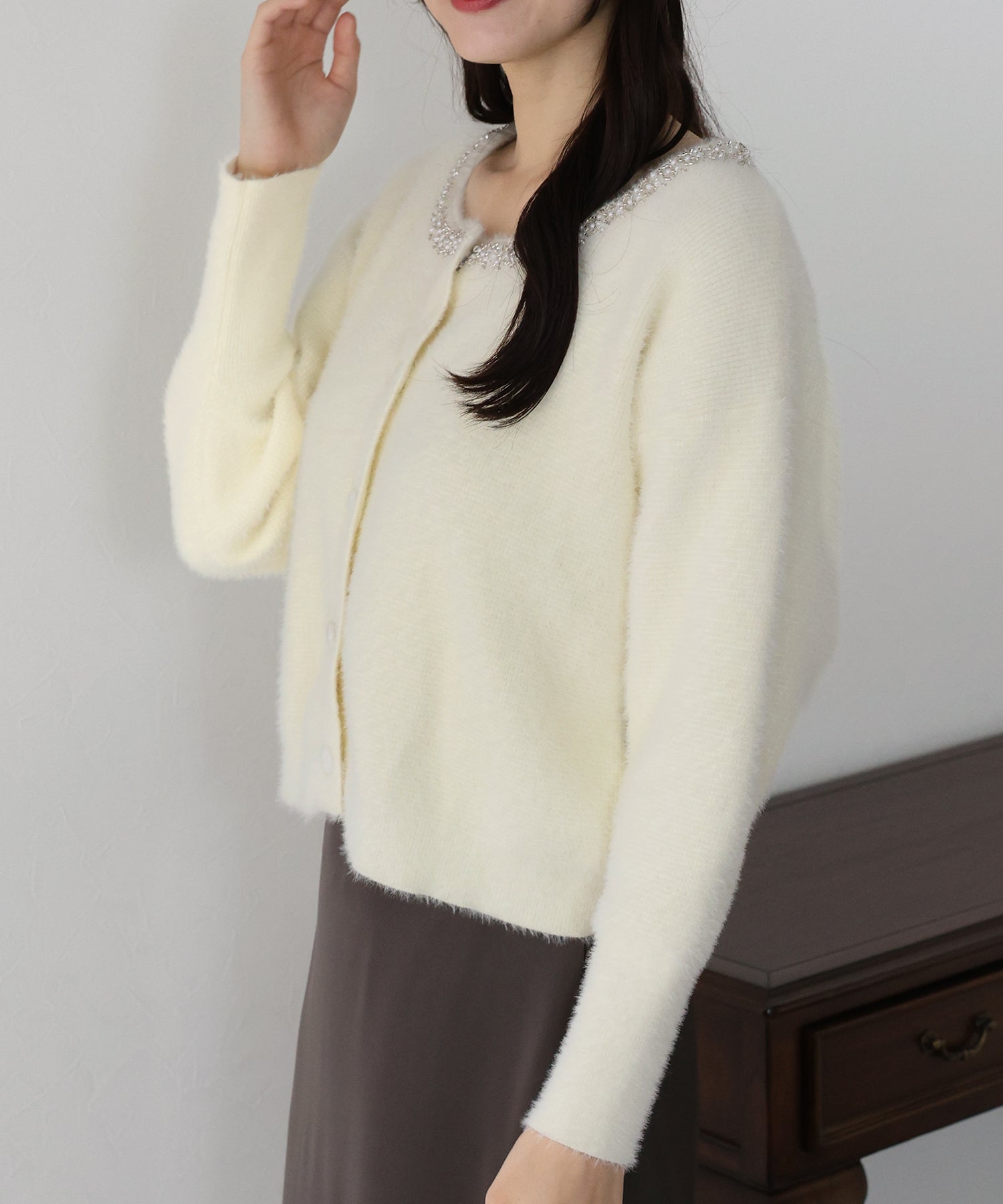 ビジューをあしらった華やかな印象のニットカーディガン。