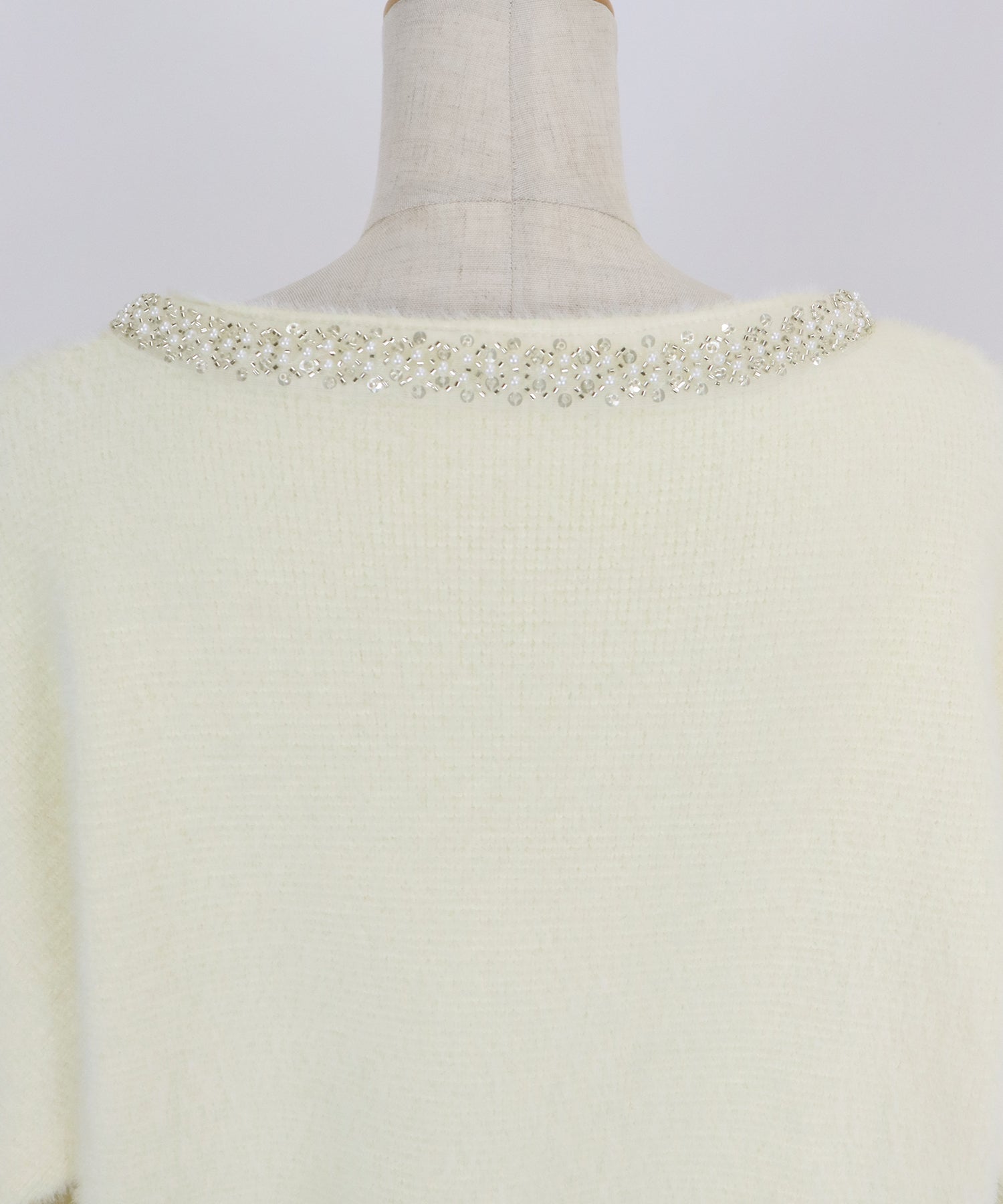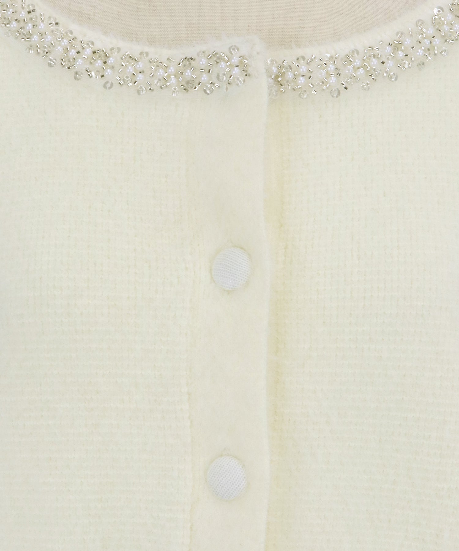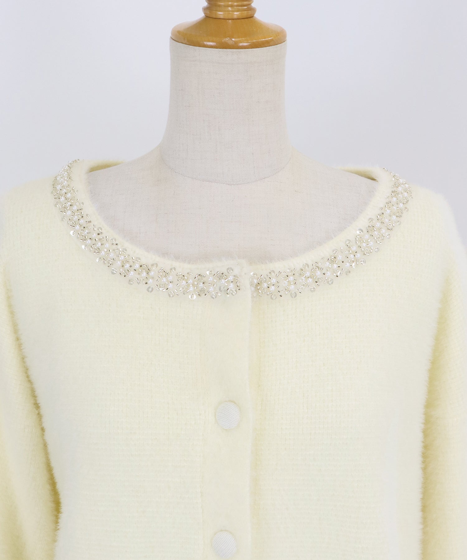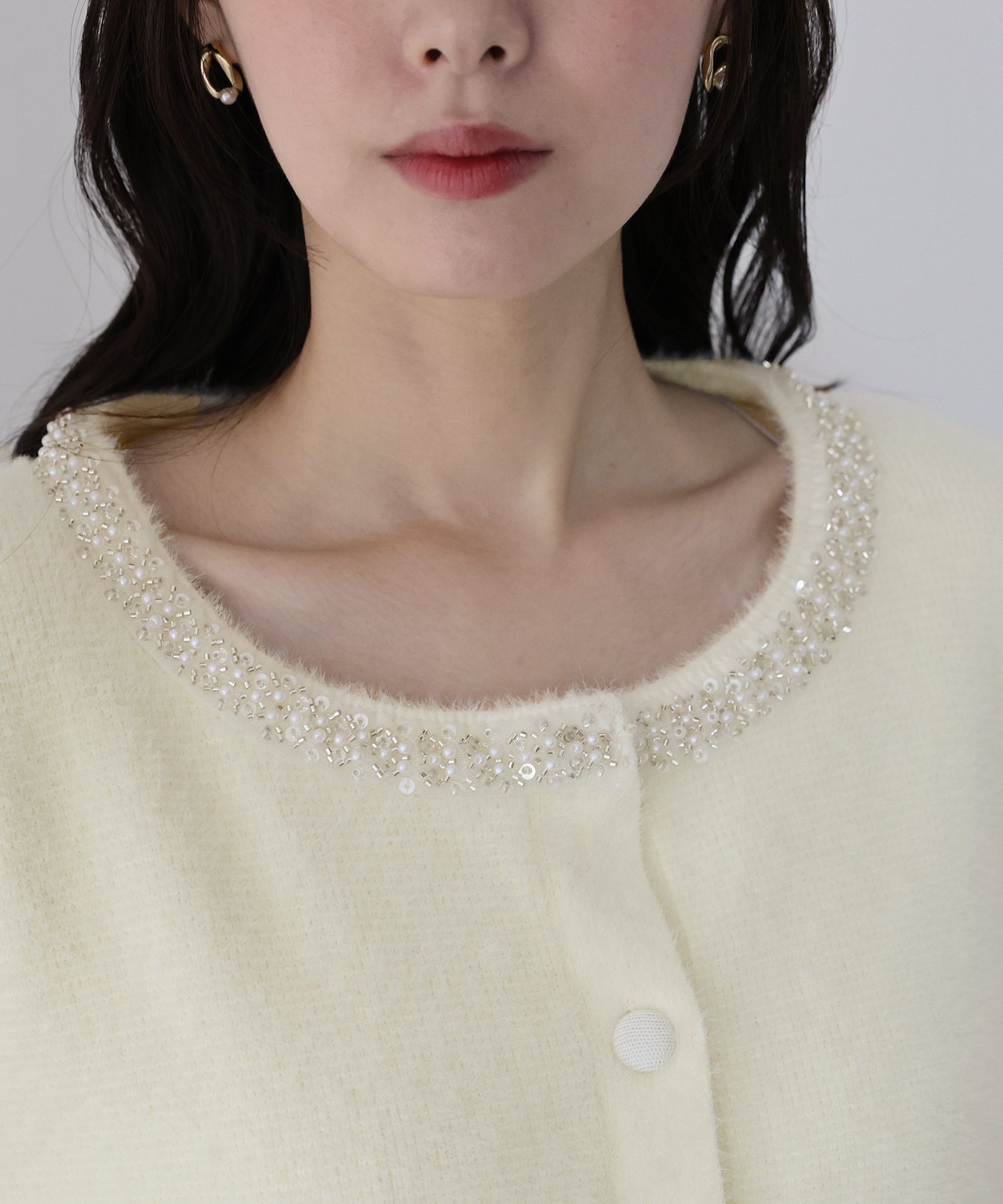 ビジューをあしらった華やかな印象のニットカーディガン。