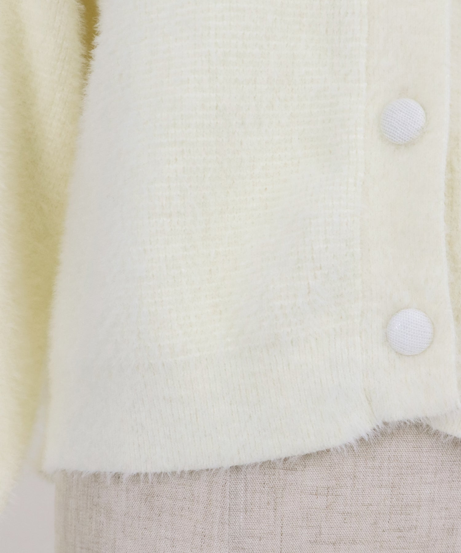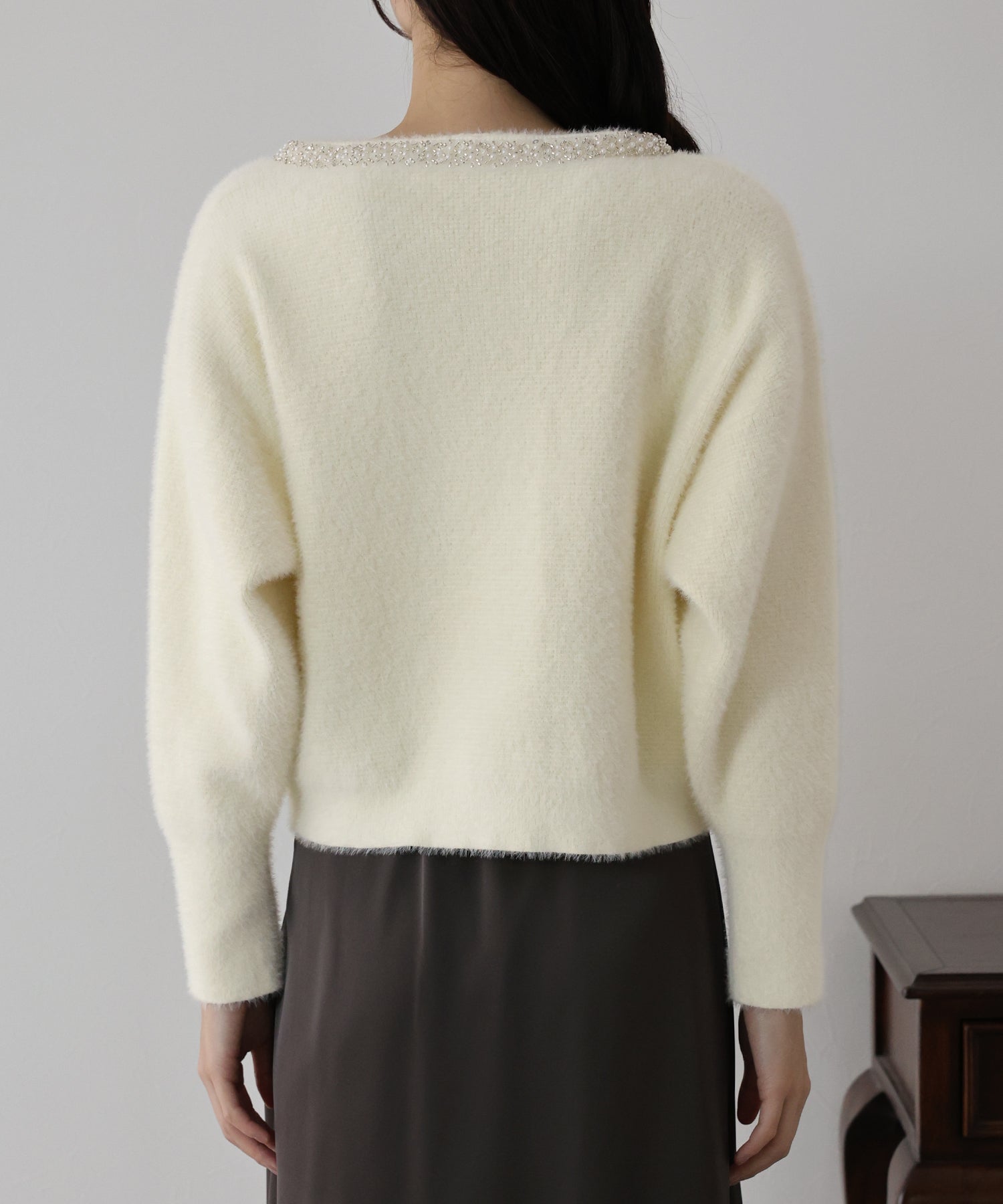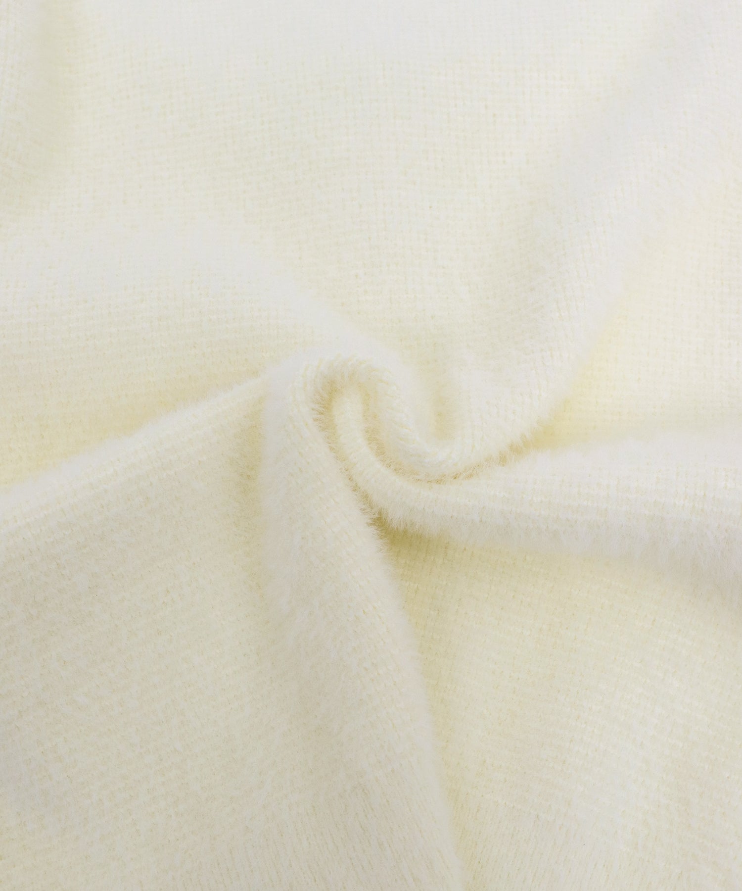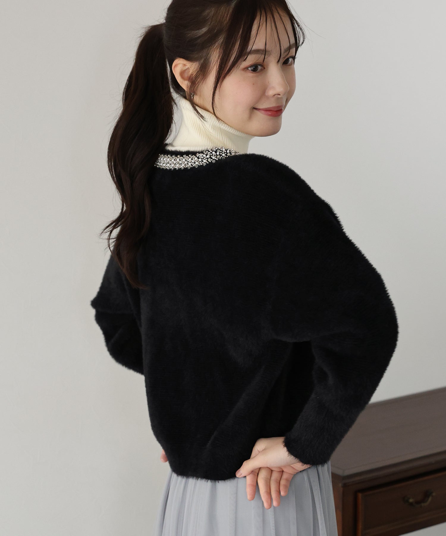 ふんわりとした毛足のシャギーニットが、コーデを女性らしく上品に演出し、首元のビジューテープで大人の華やかさをプラスしました。