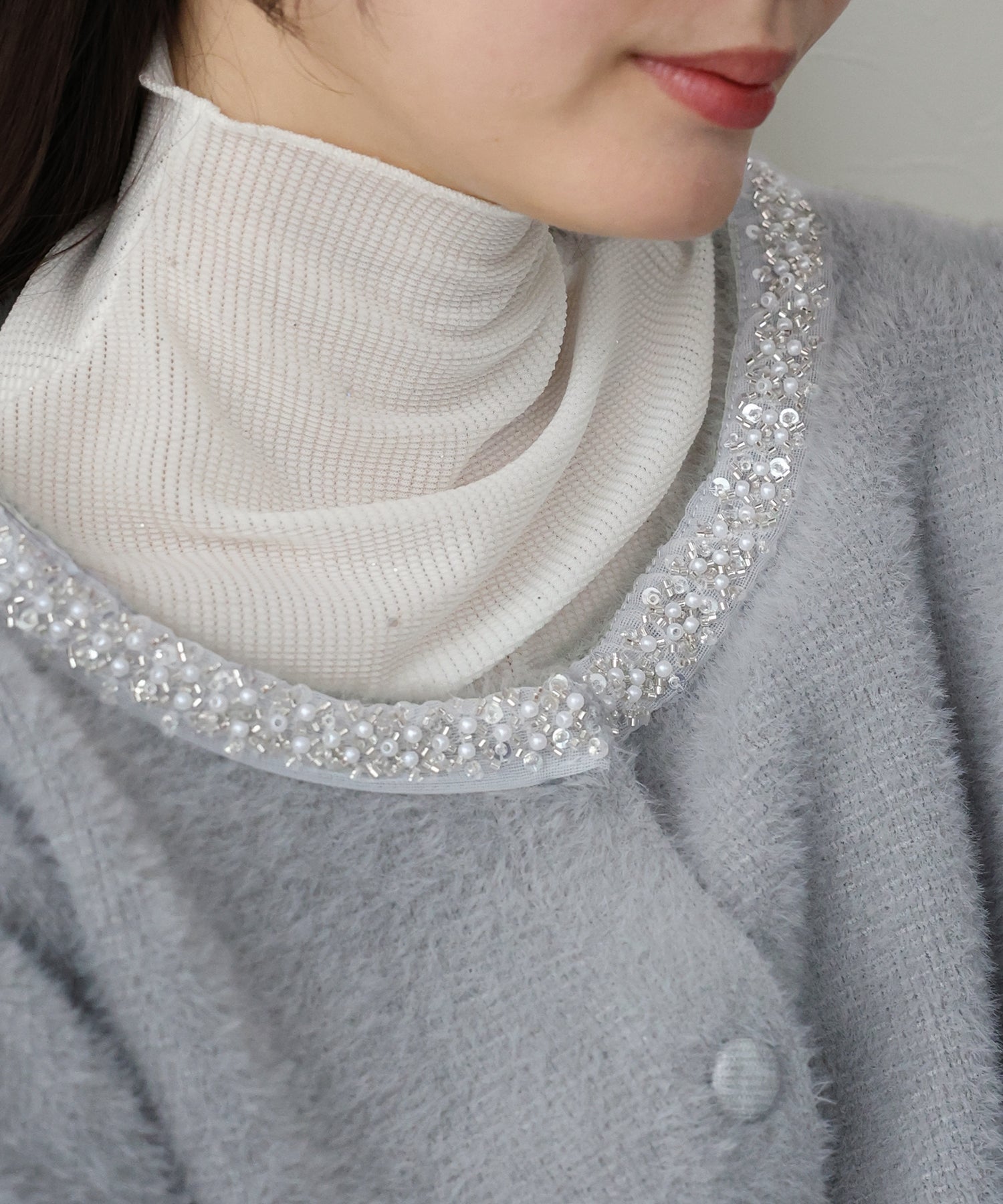 派手過ぎない首元のビジューで、パンツにもスカートにも合わせやすい一枚です。
