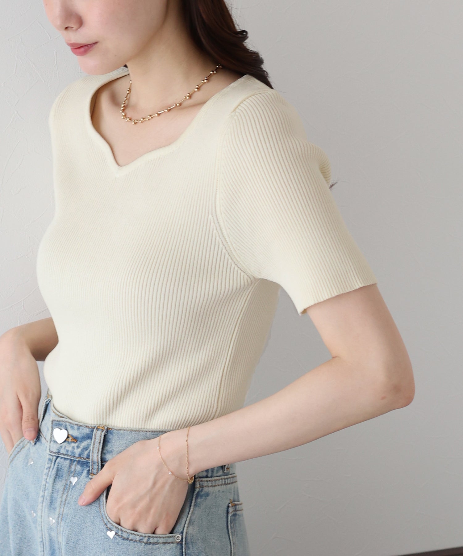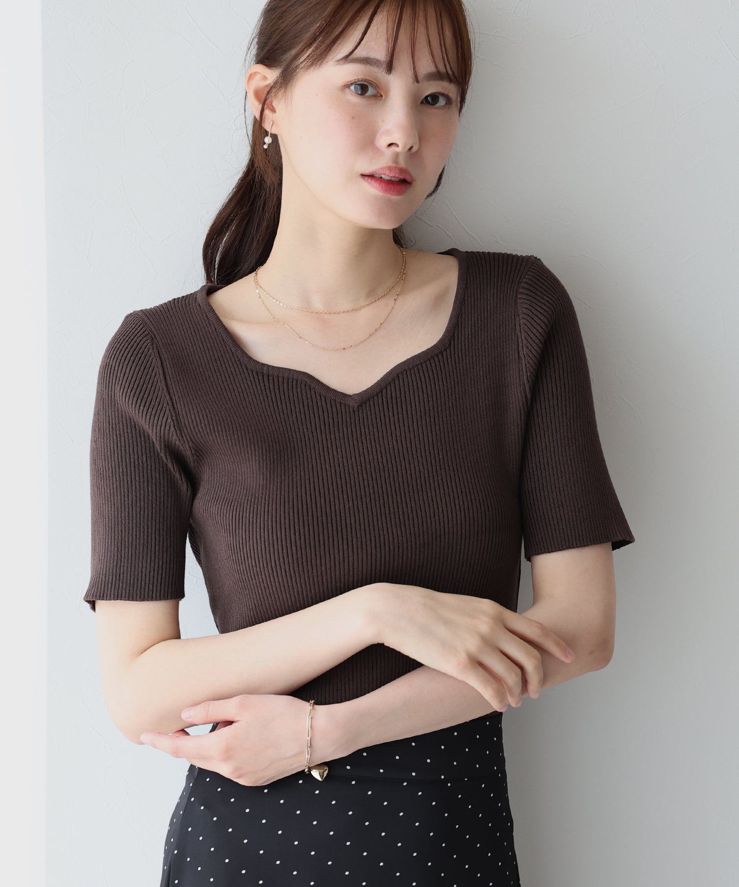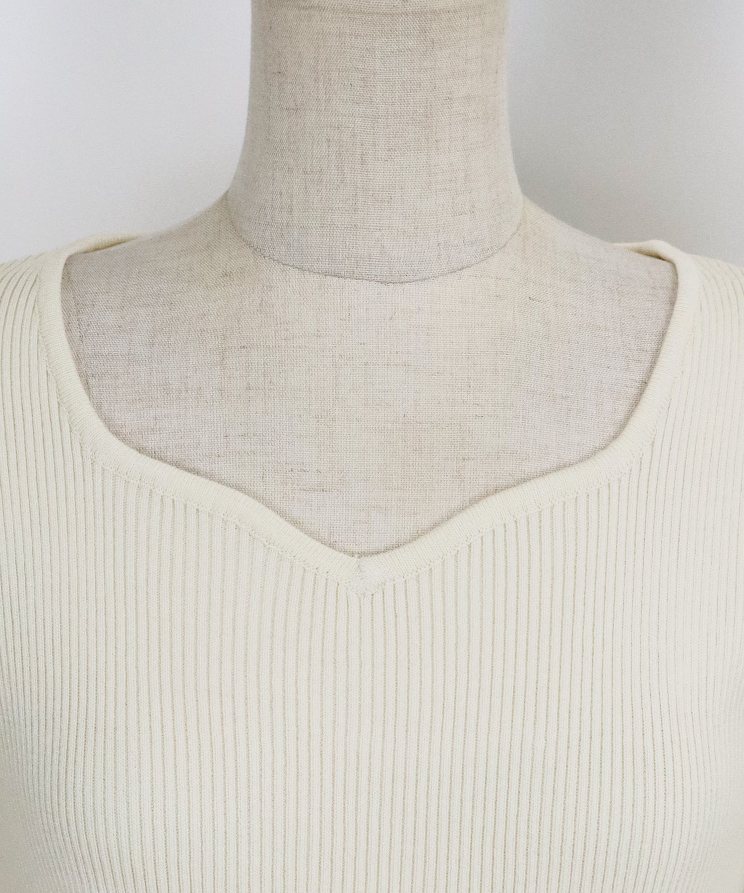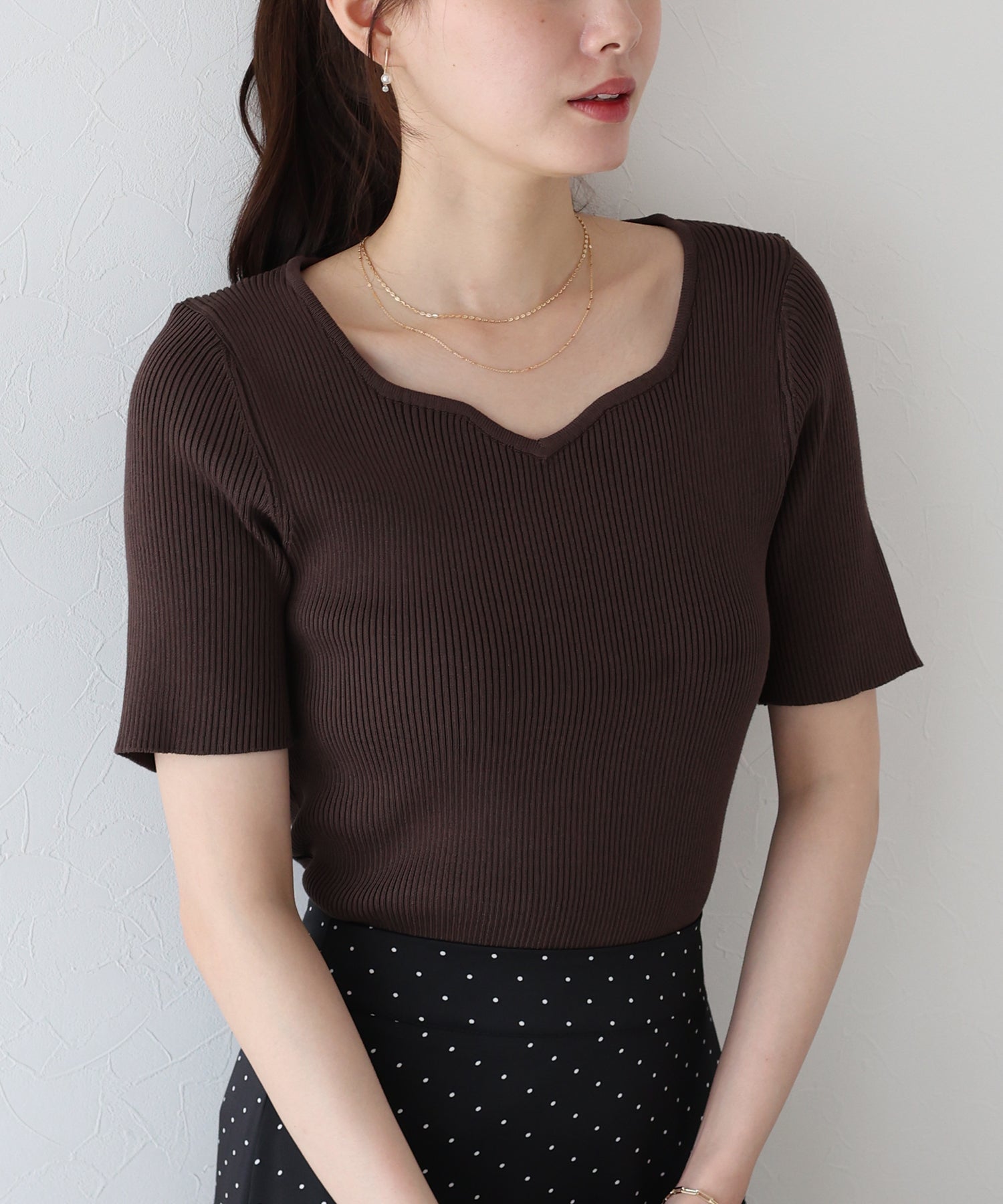 デコルテを美しく見せてくれるハートネックリブニット。