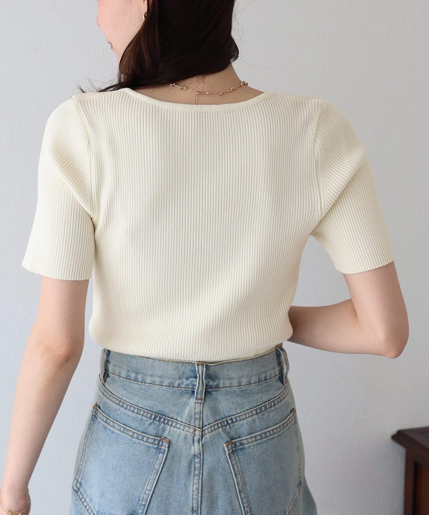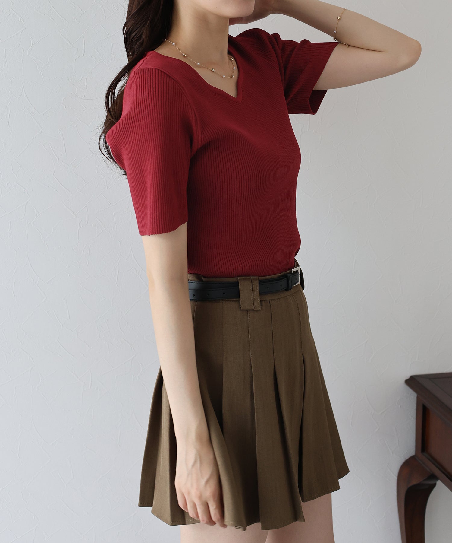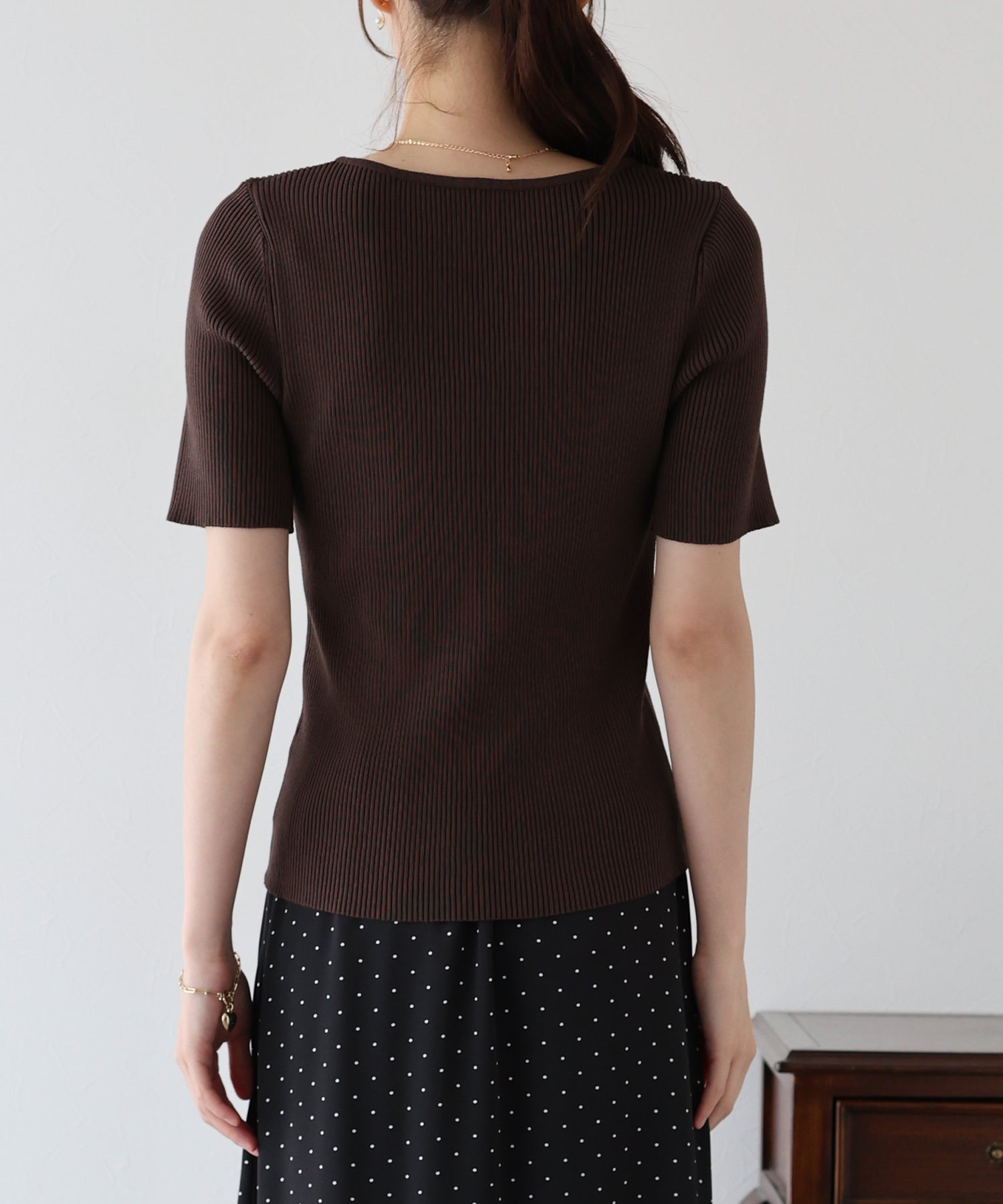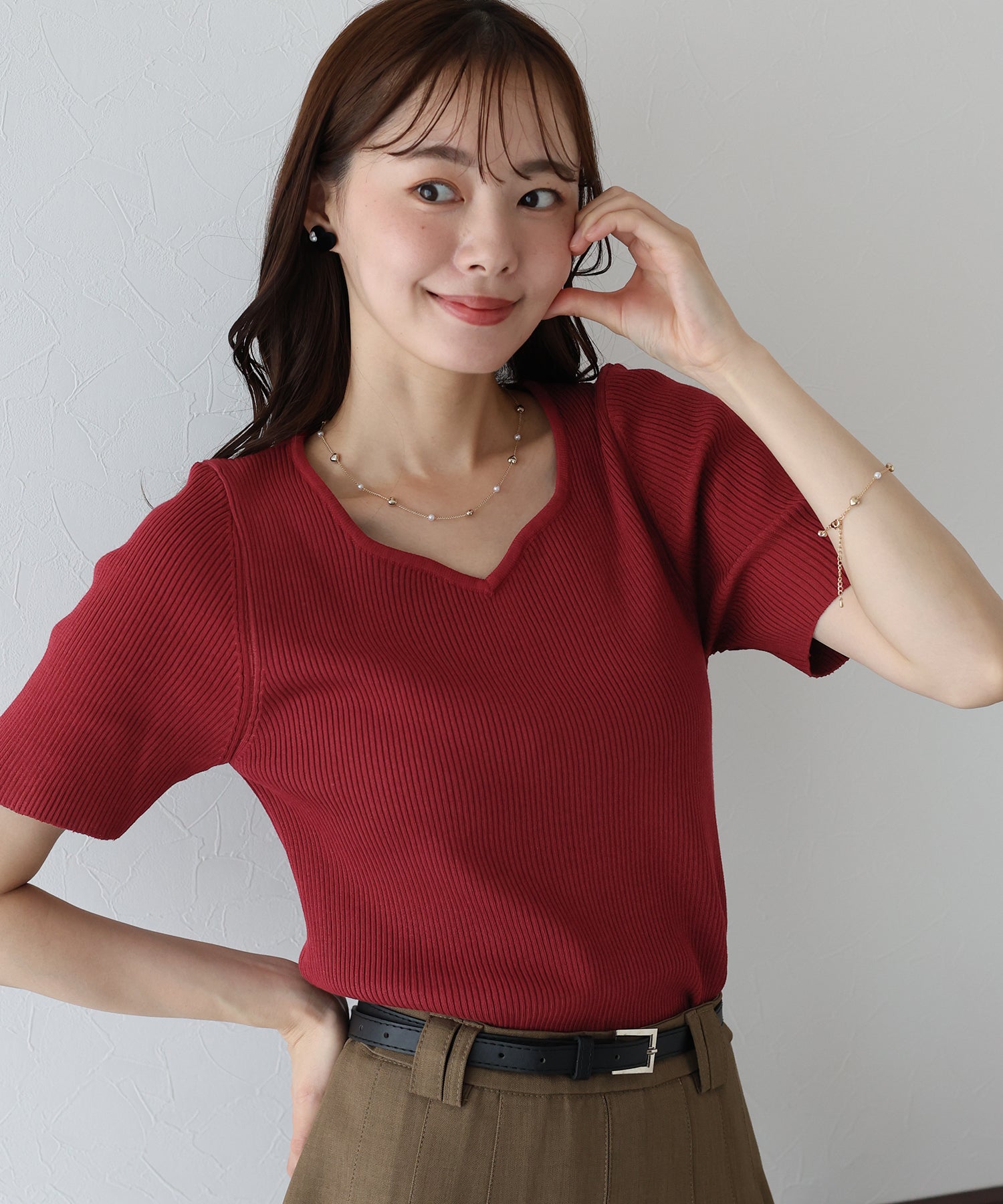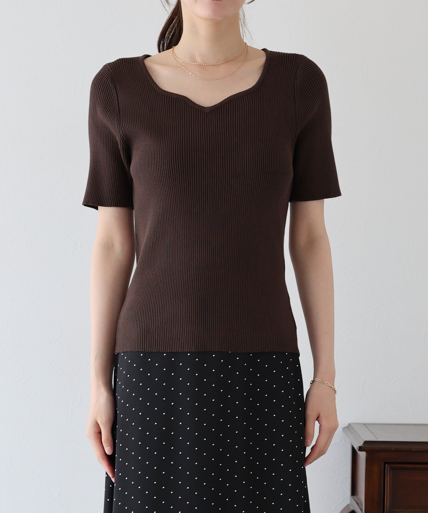 デコルテを美しく見せてくれるハートネックリブニット。