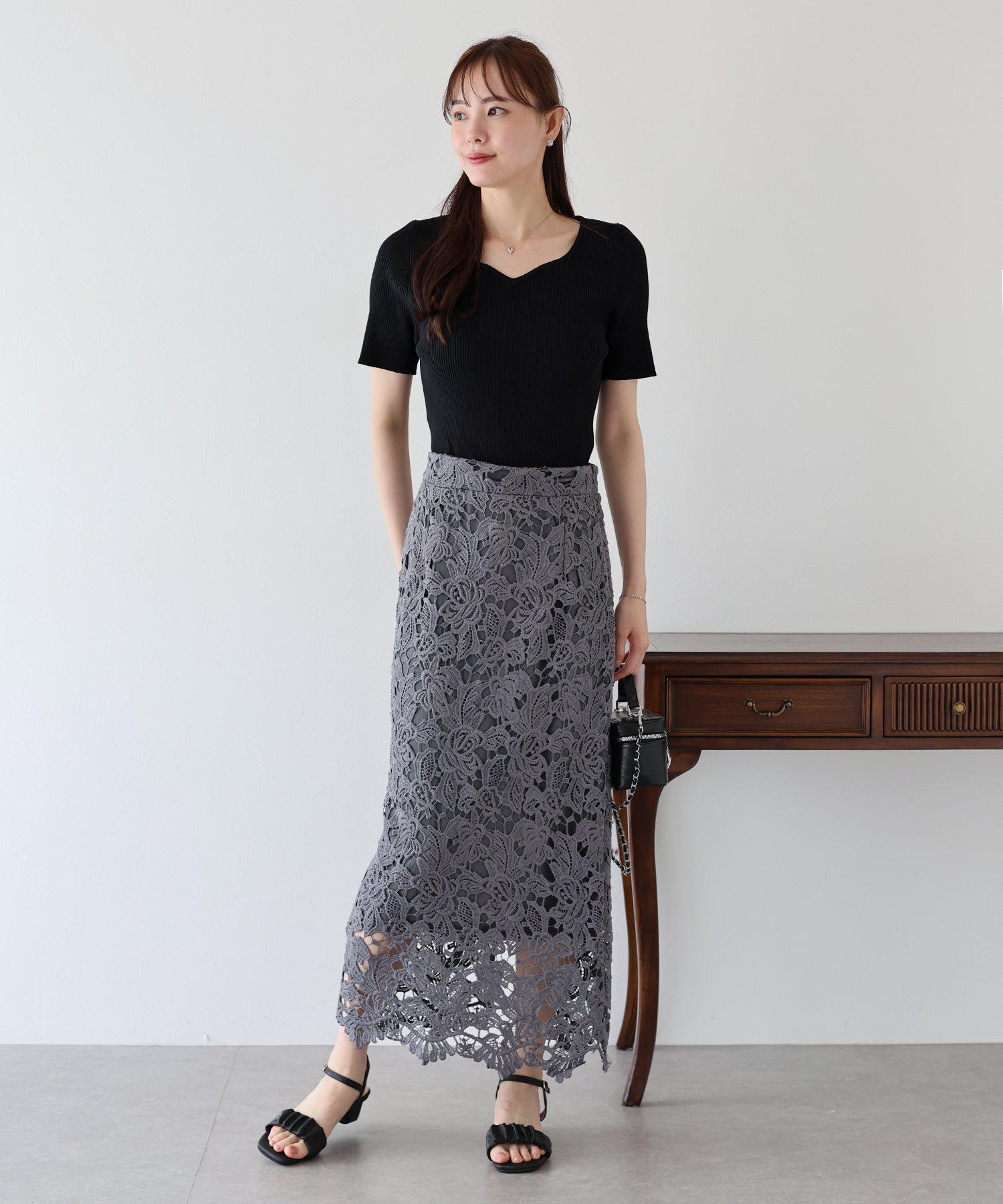 女性らしさが際立つハートネック襟ぐりで顔回りを華やかに演出。