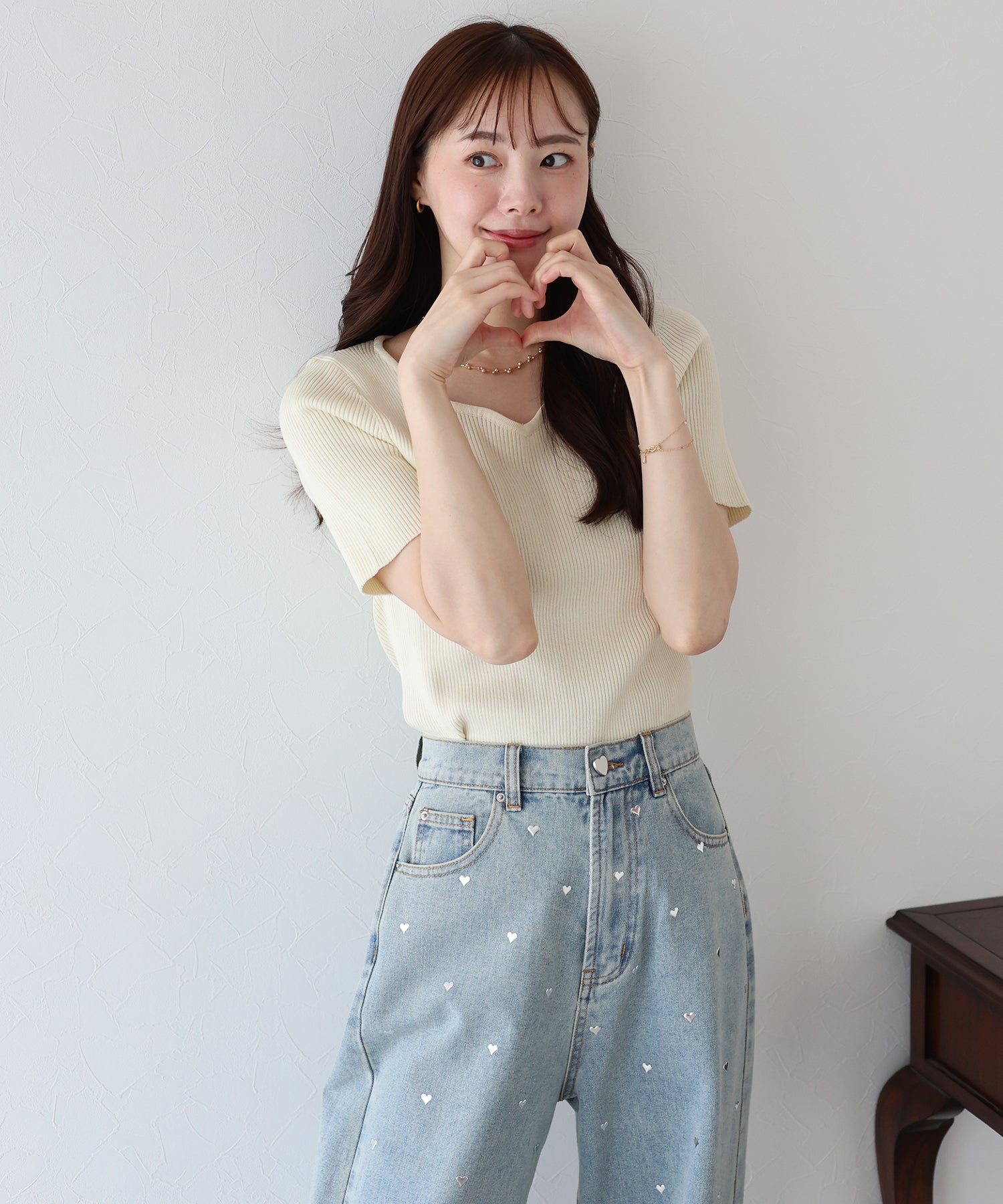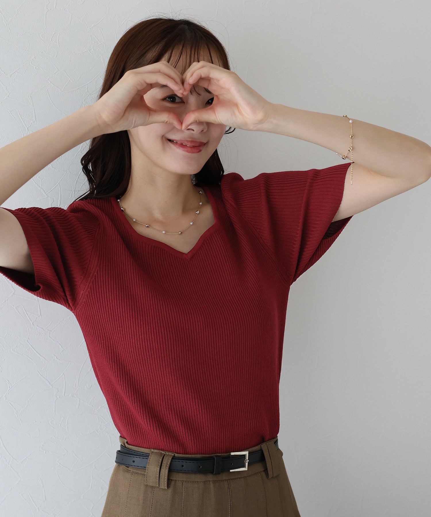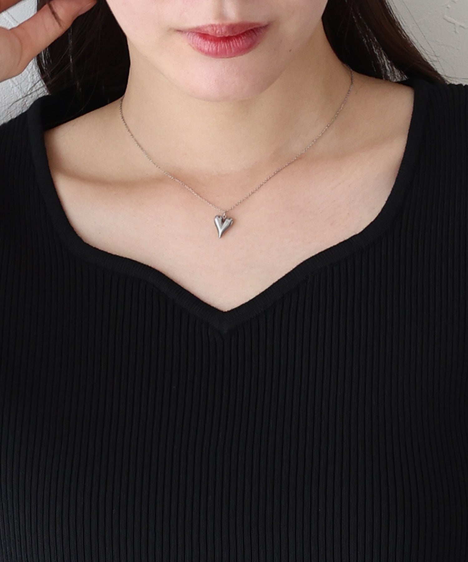 日常のコーディネートにほのかに華やかなアクセントを与えるハートネックニット