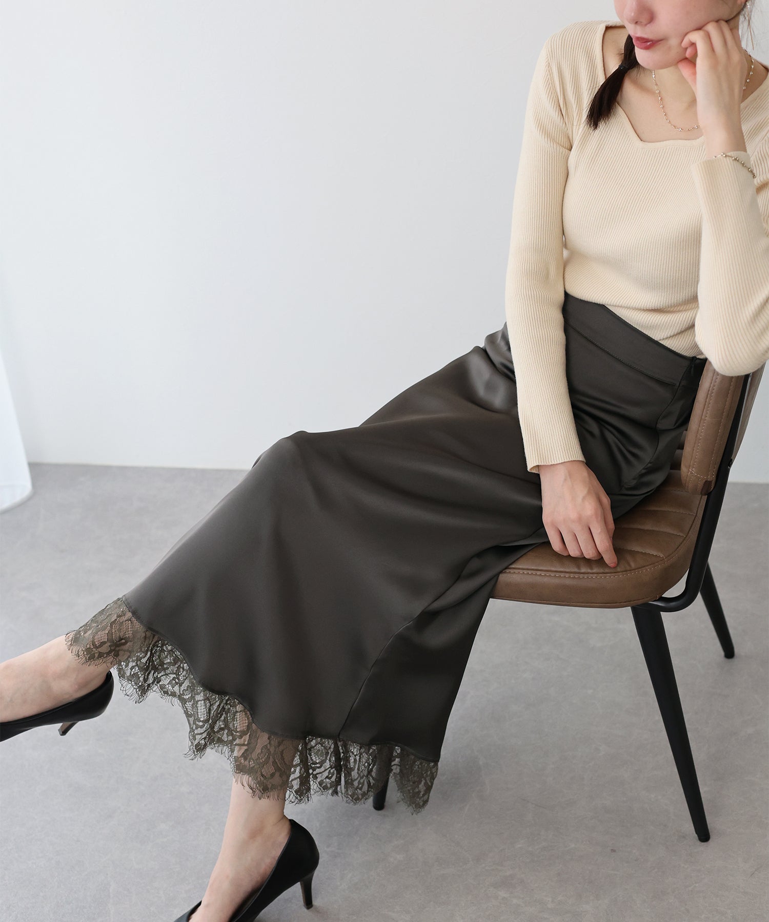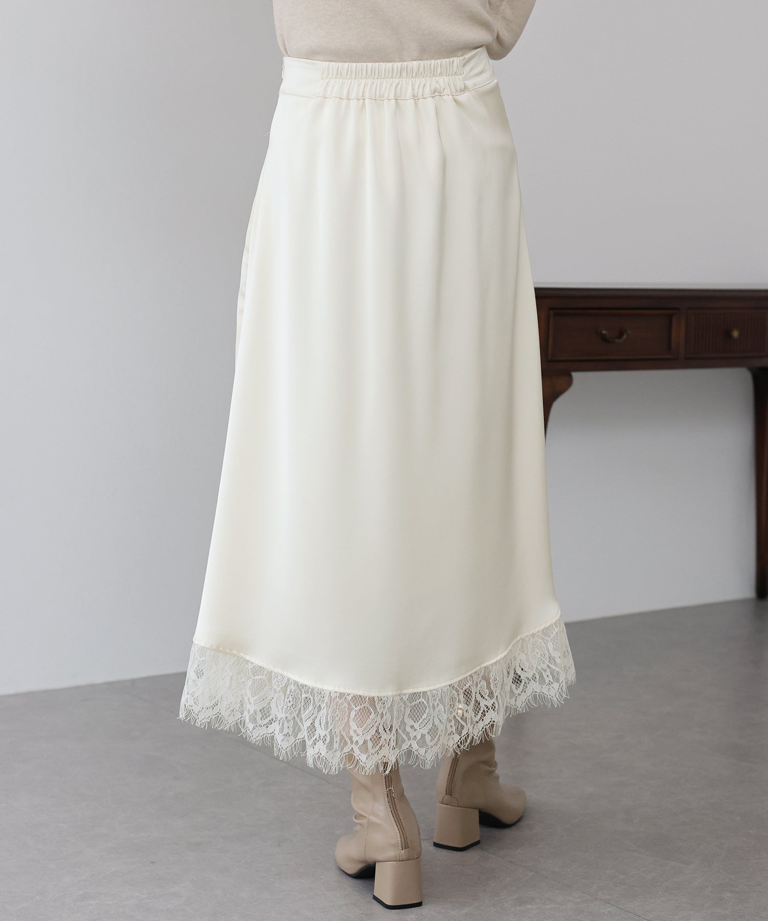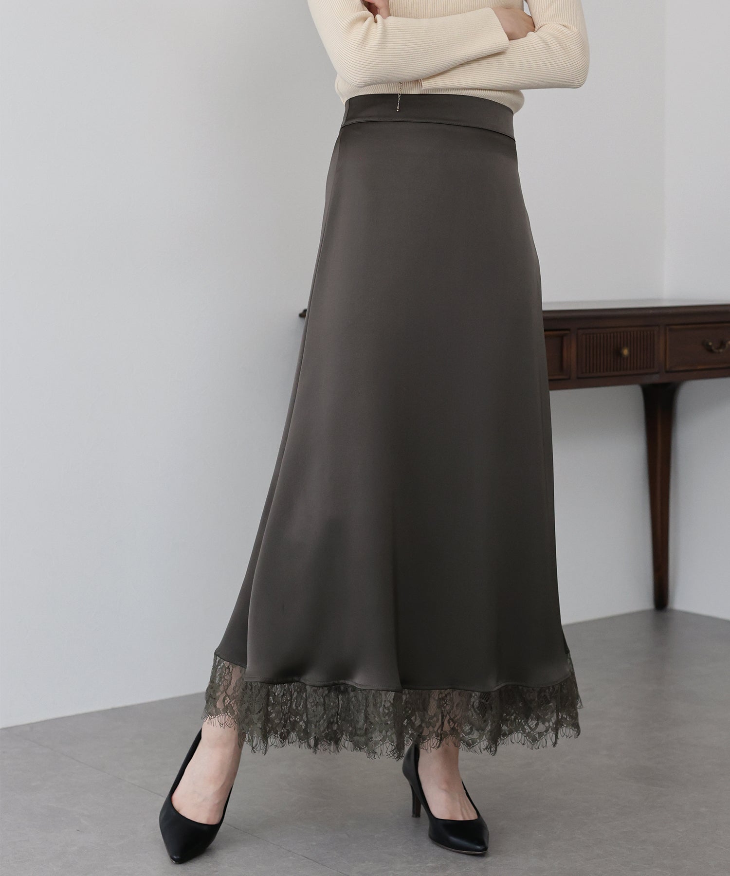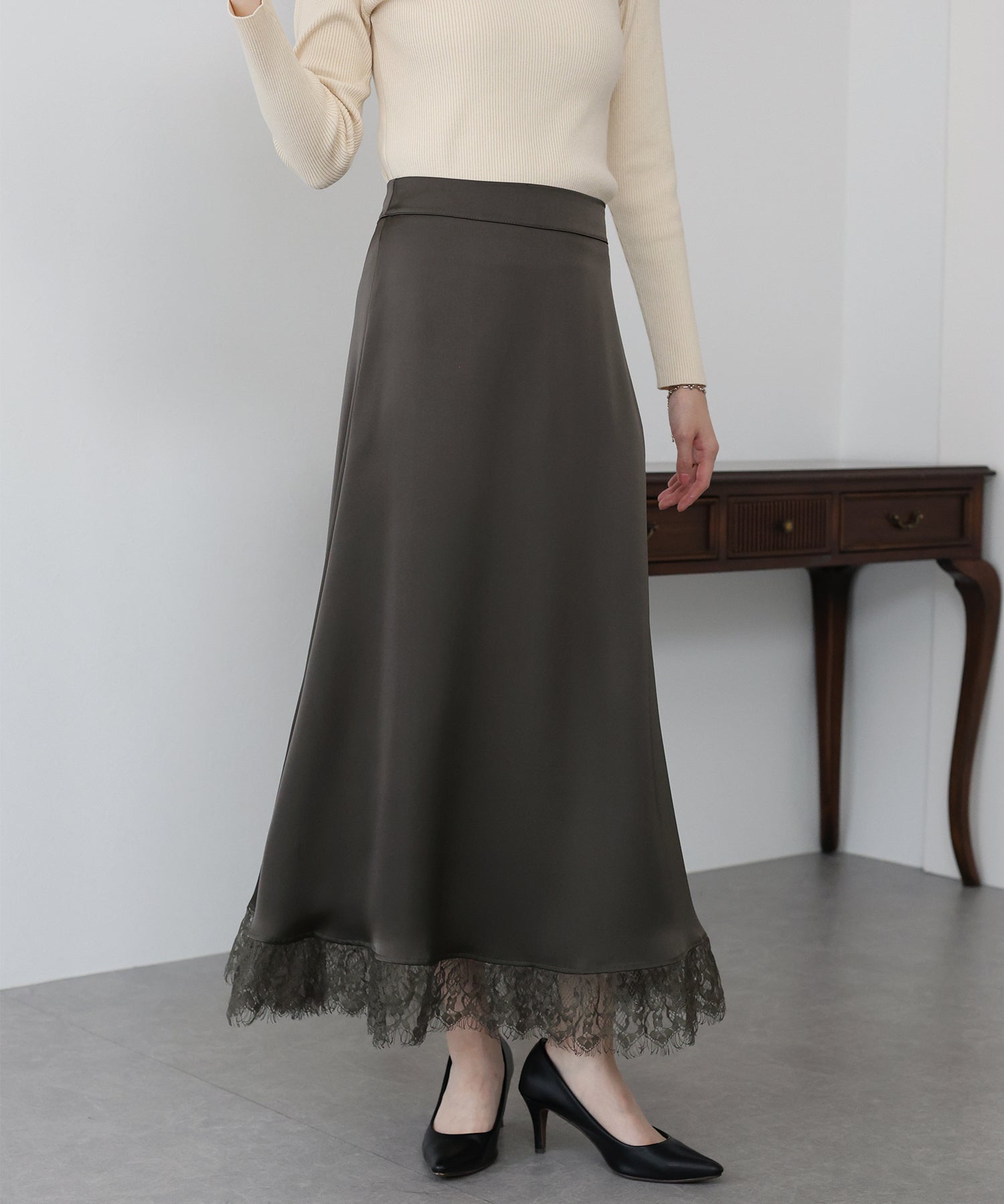 裾に繊細なレースをあしらった、女性らしい印象のサテンスカート。