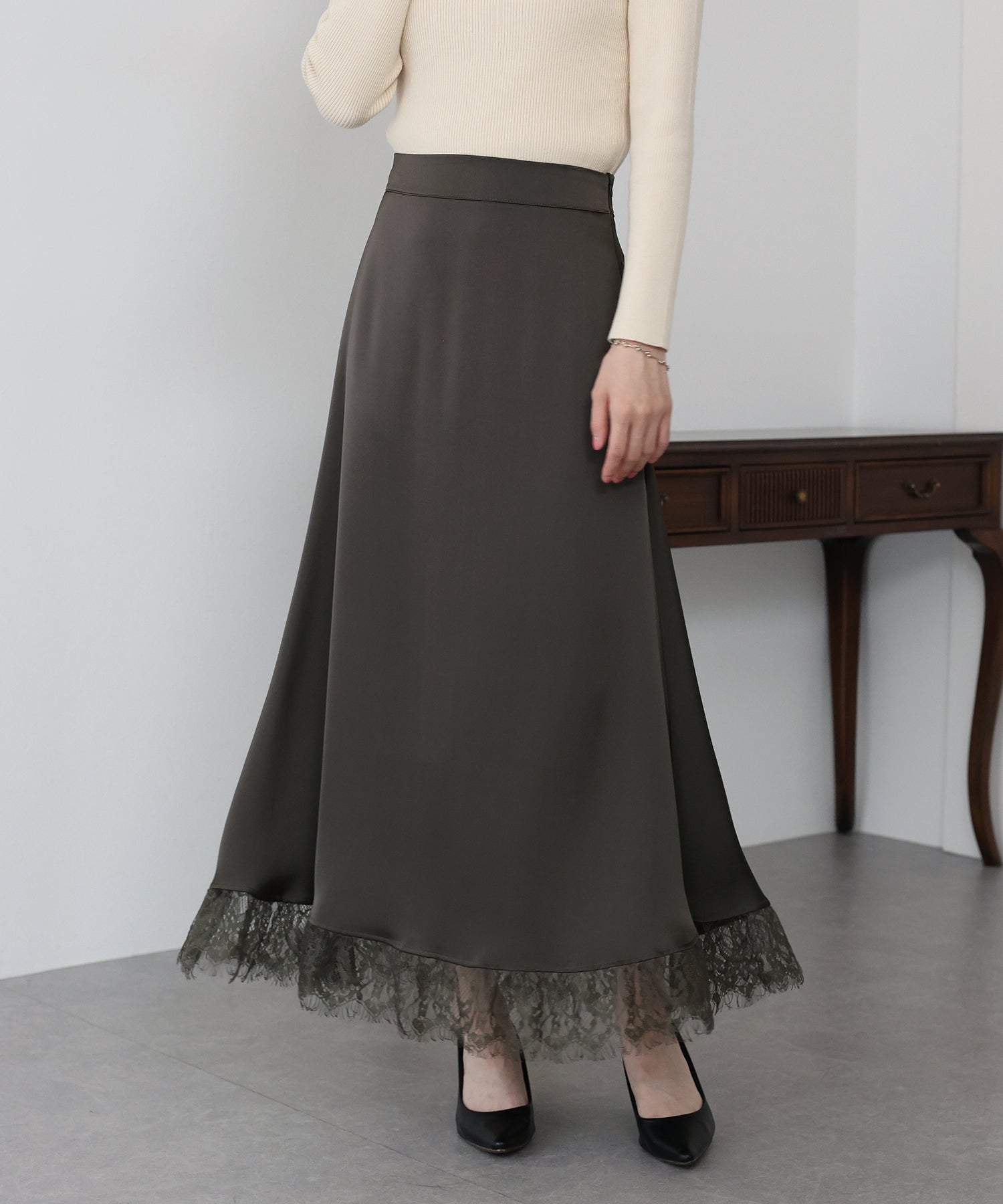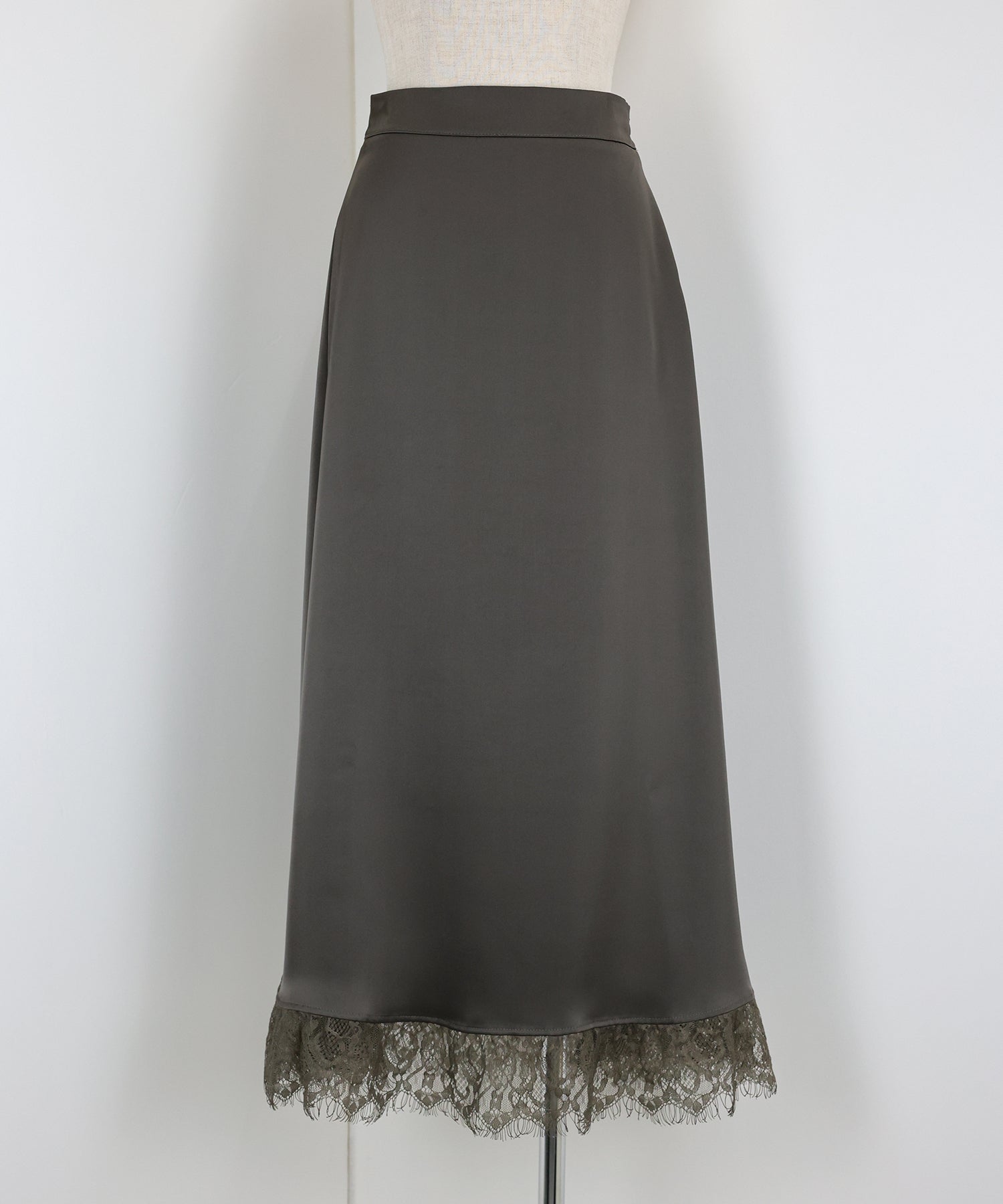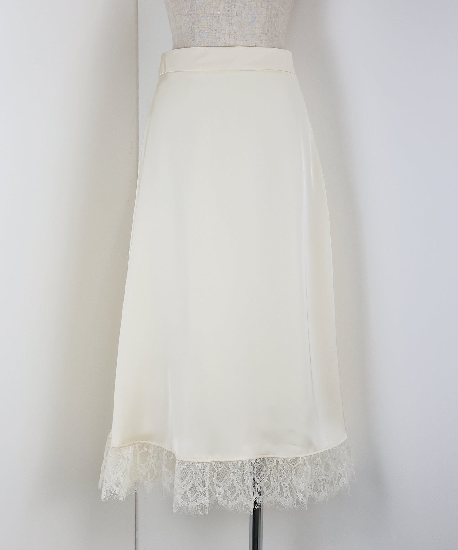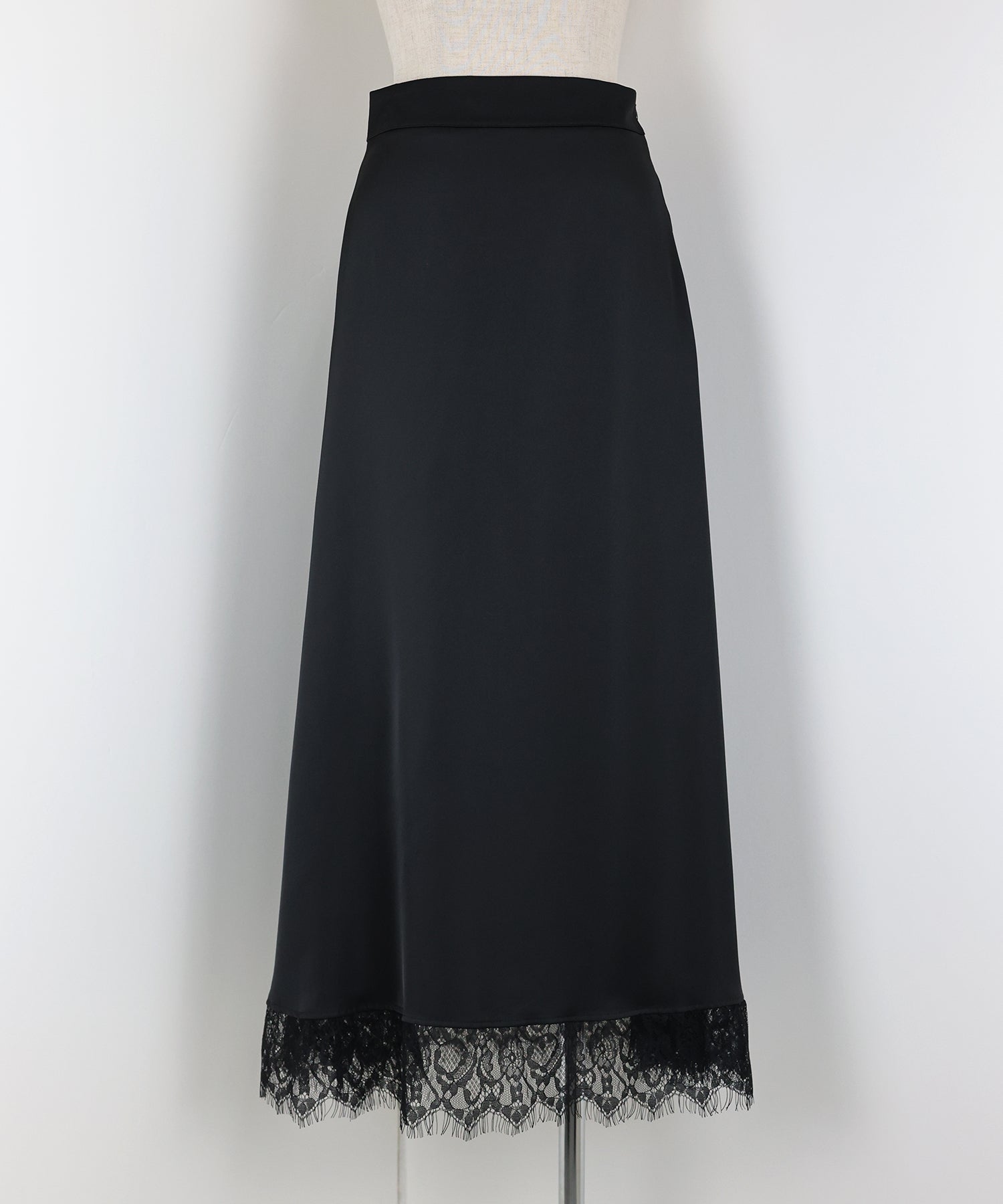 裾に繊細なレースをあしらった、女性らしい印象のサテンスカート。