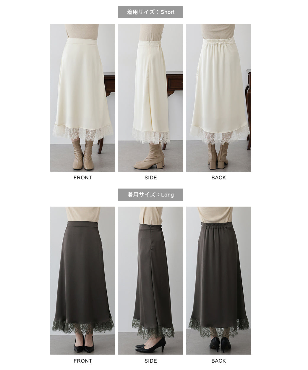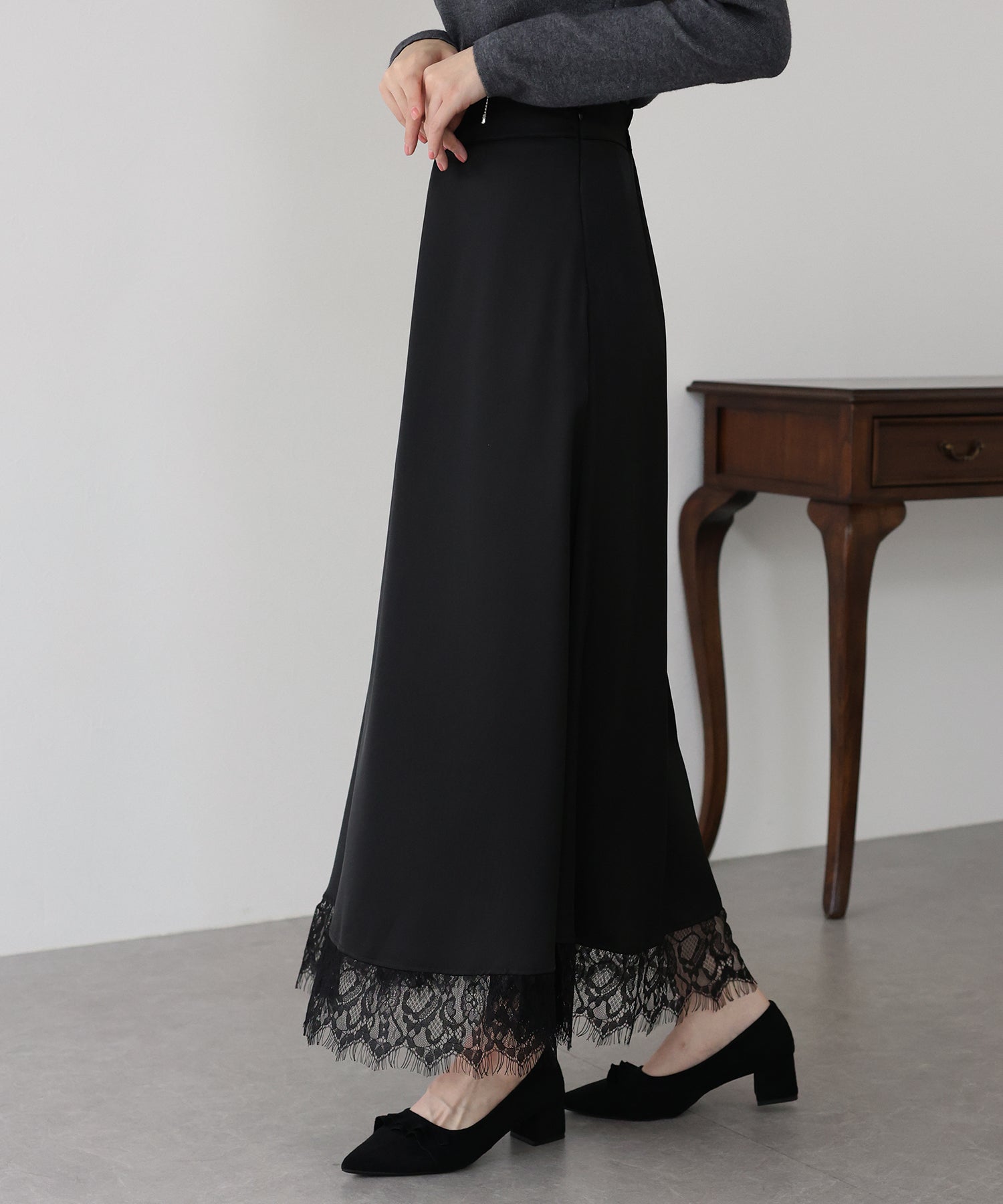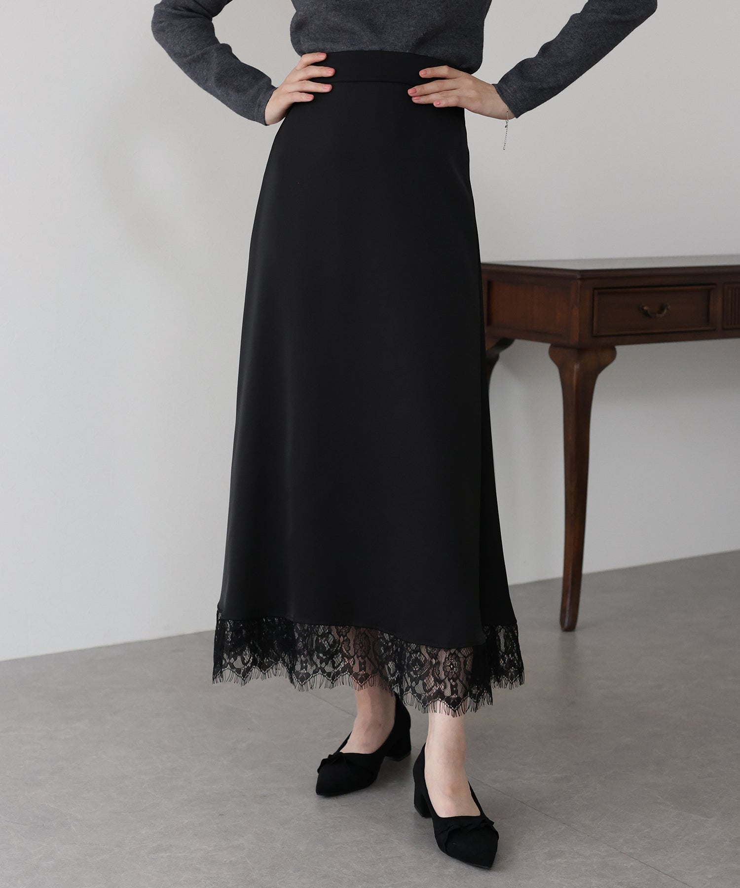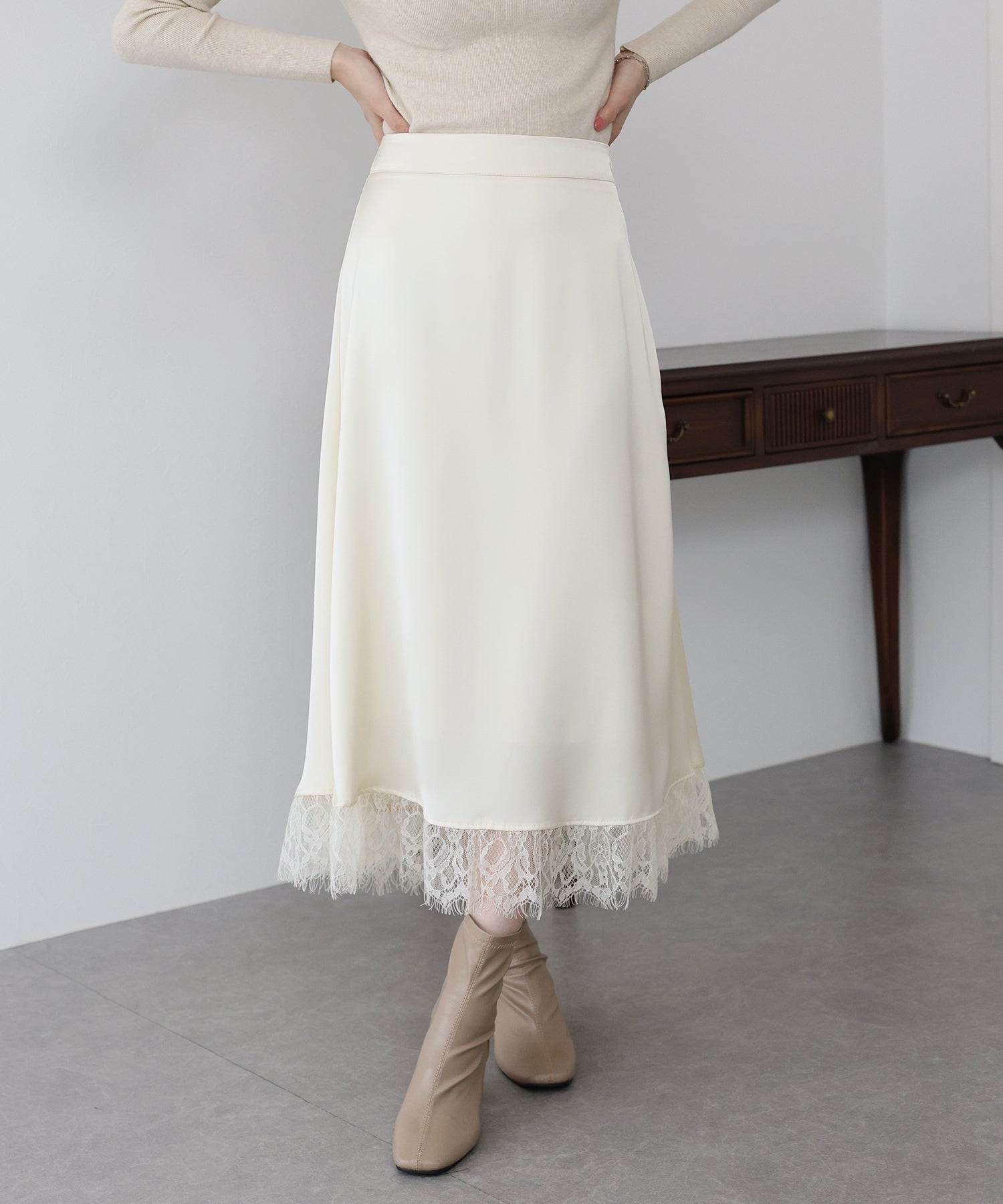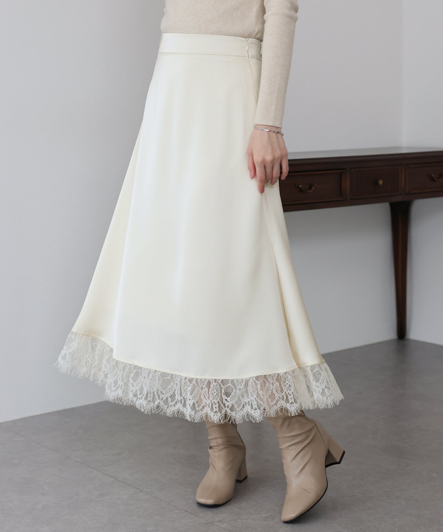 裾に繊細なレースをあしらった、女性らしい印象のサテンスカート。