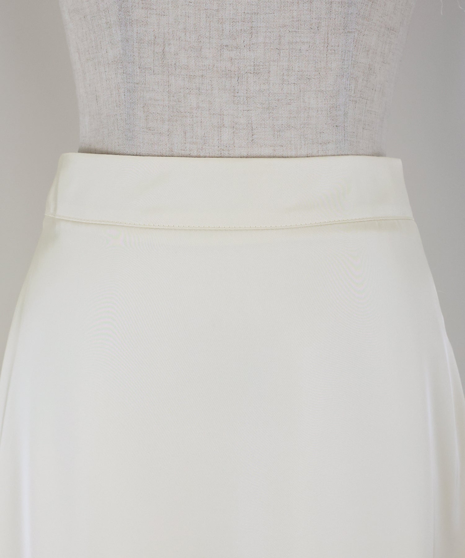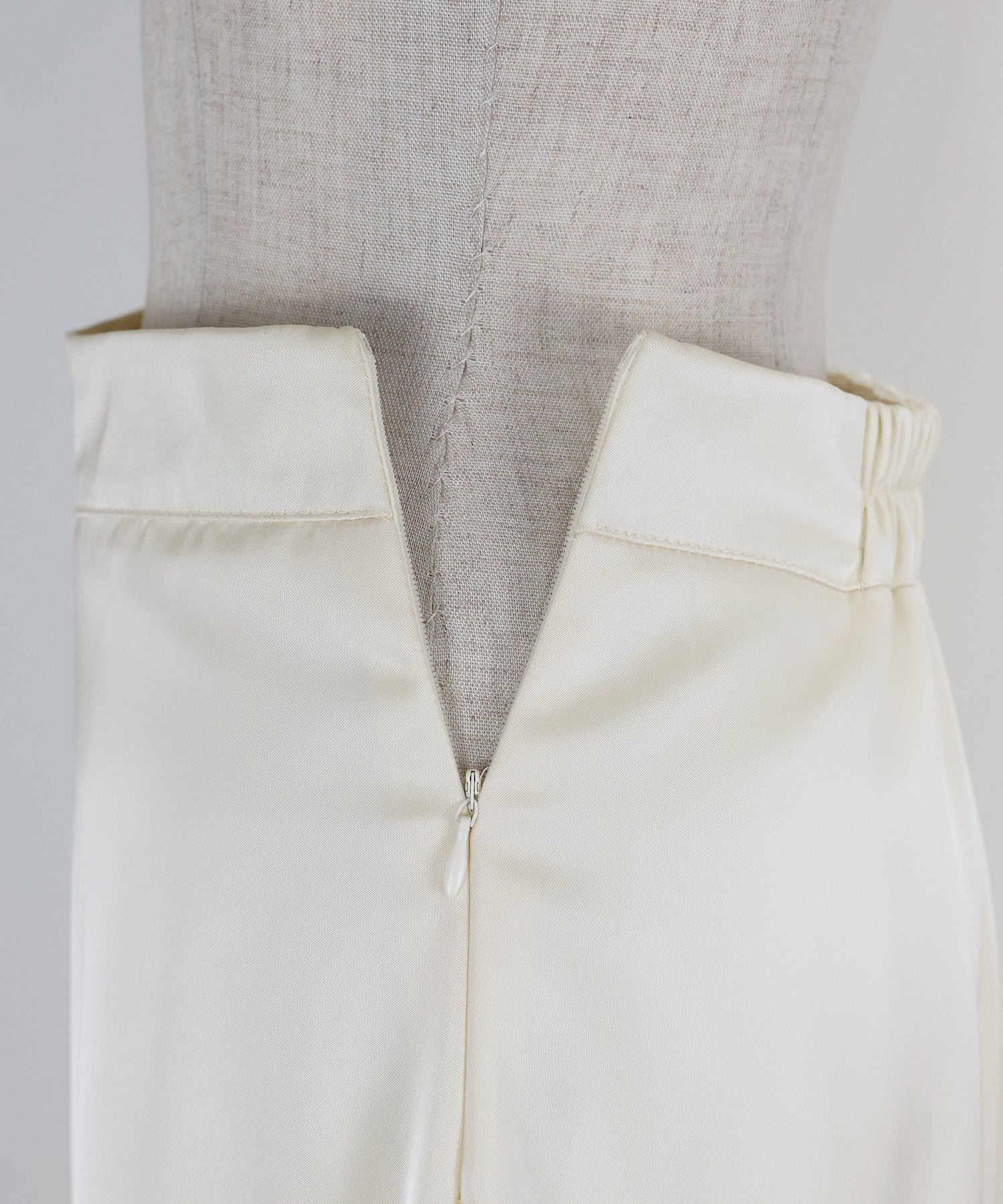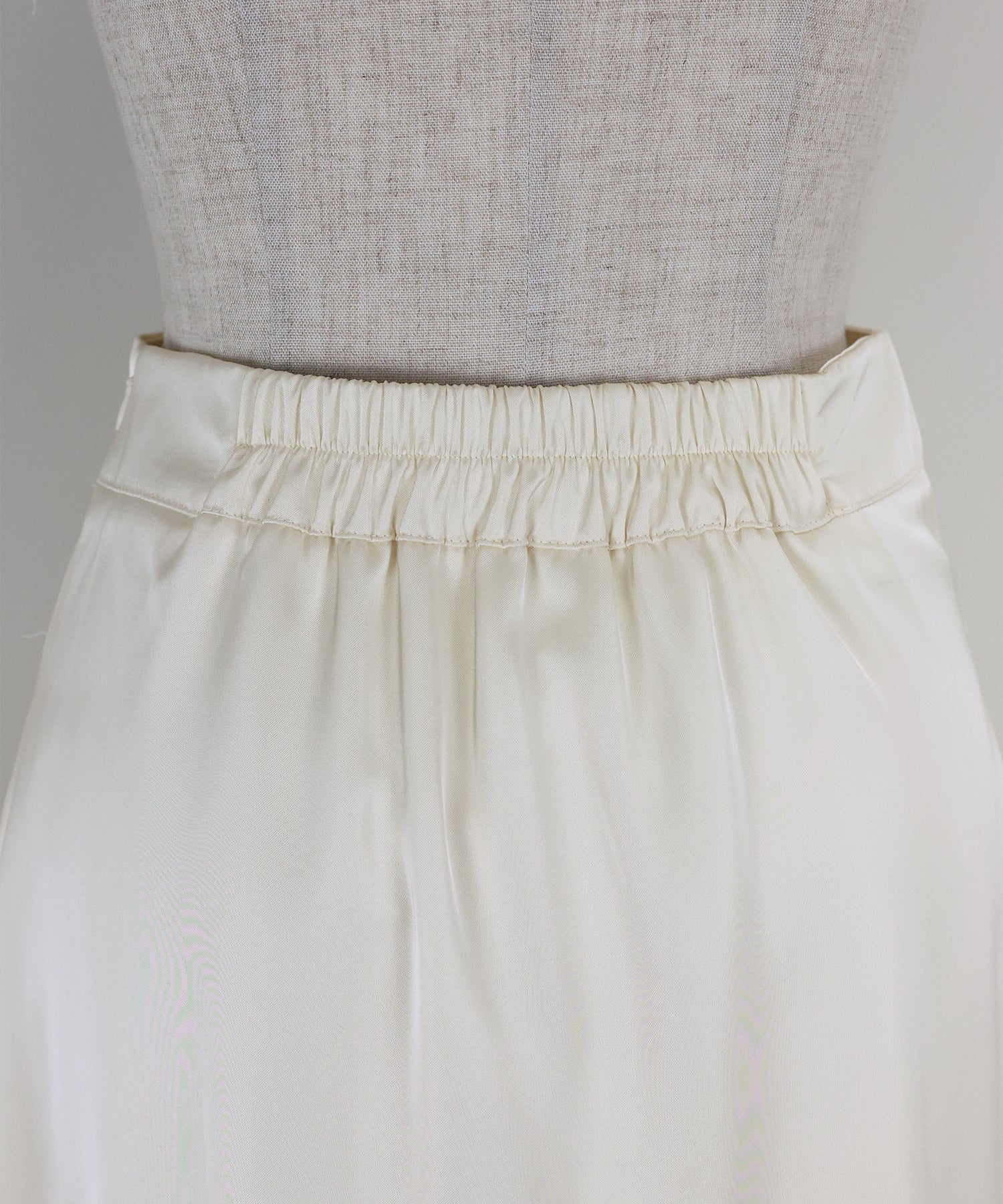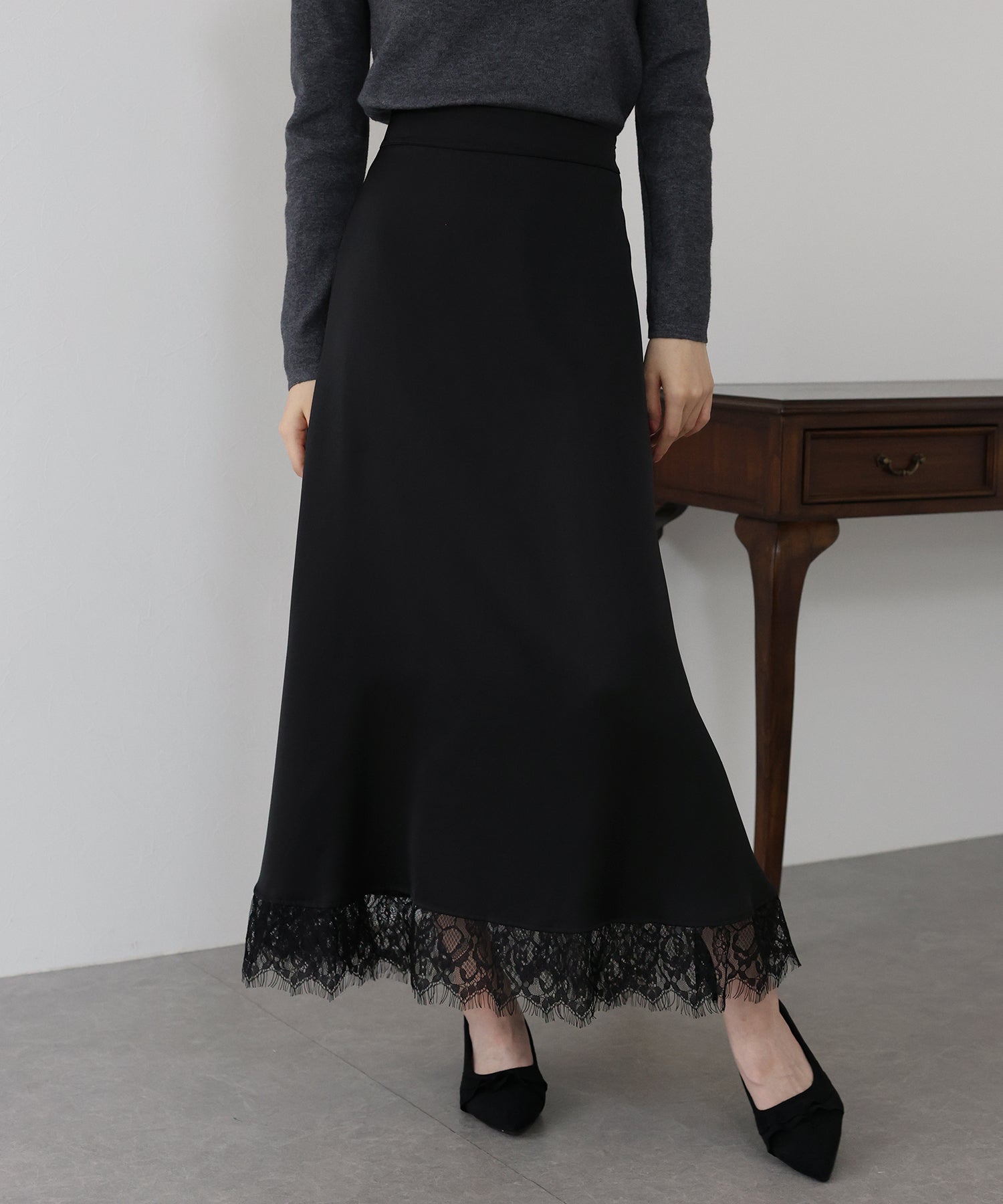 裾に繊細なレースをあしらった、女性らしい印象のサテンスカート。
