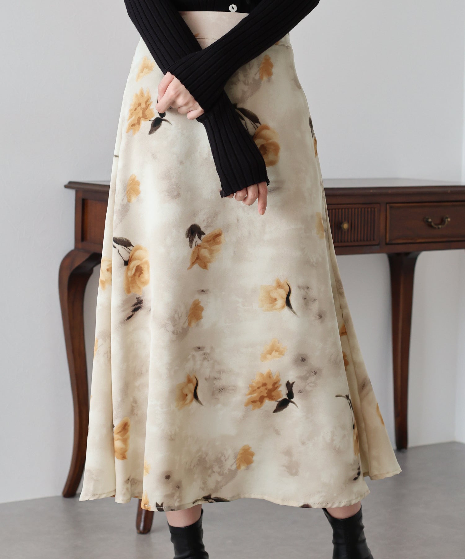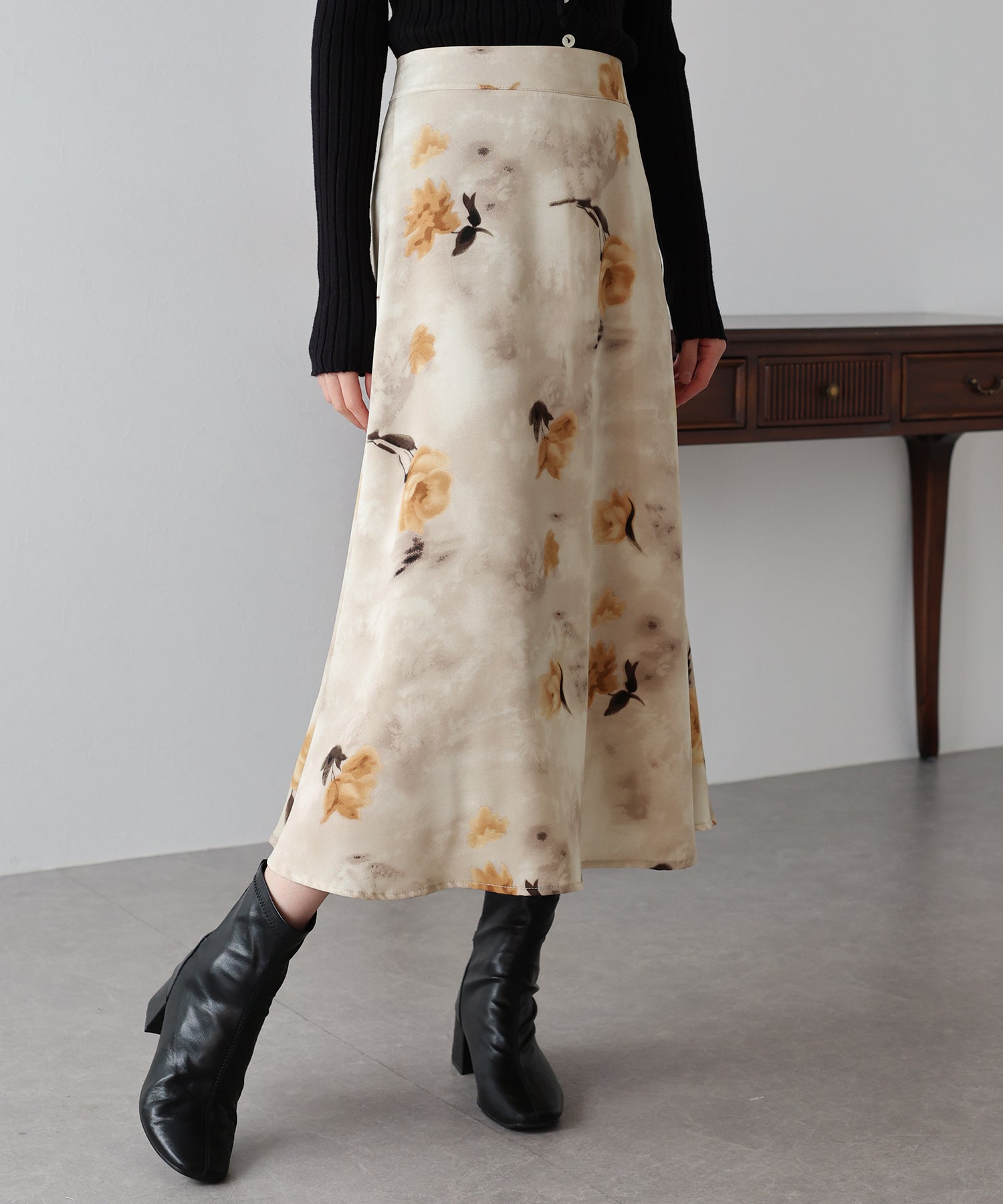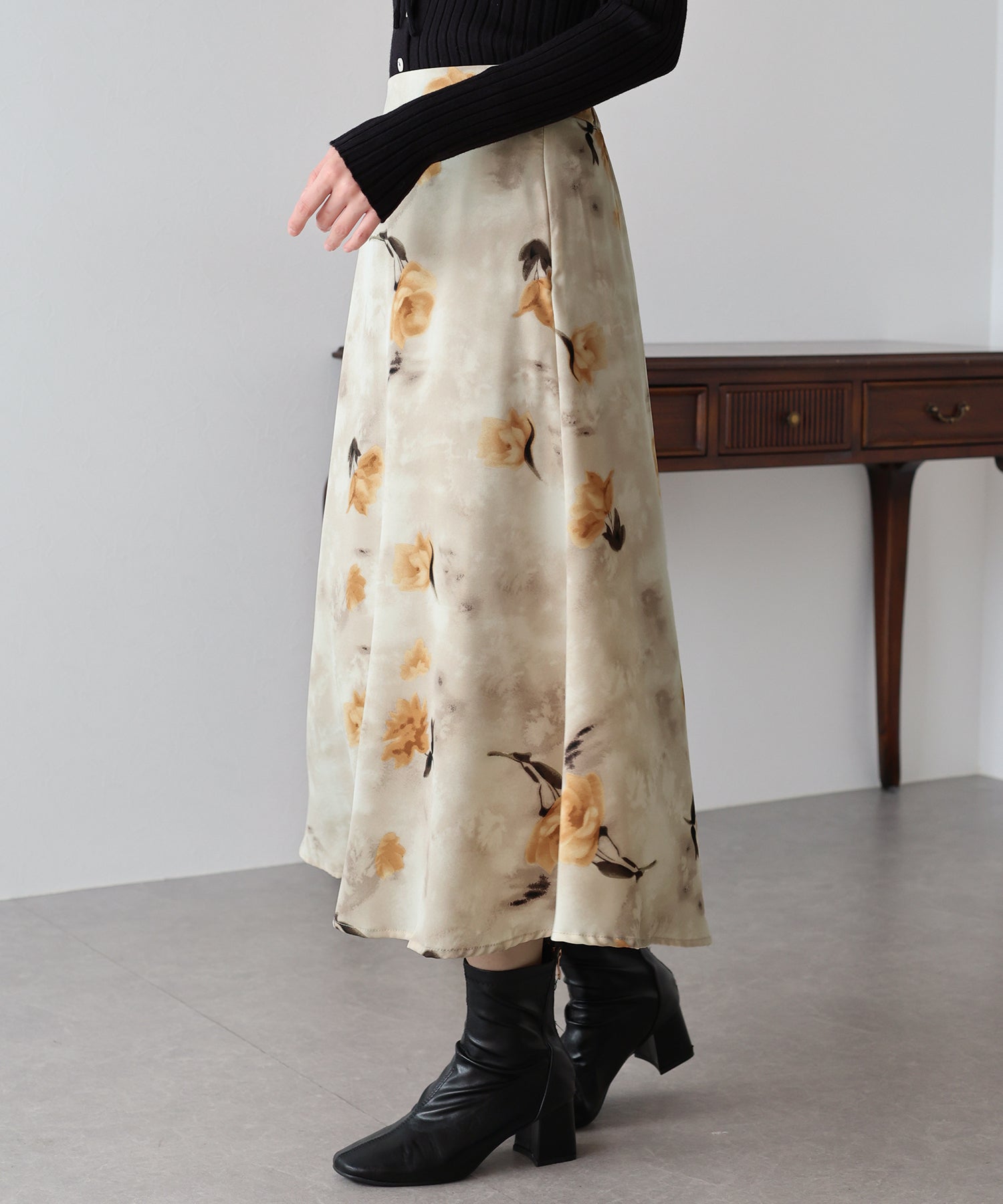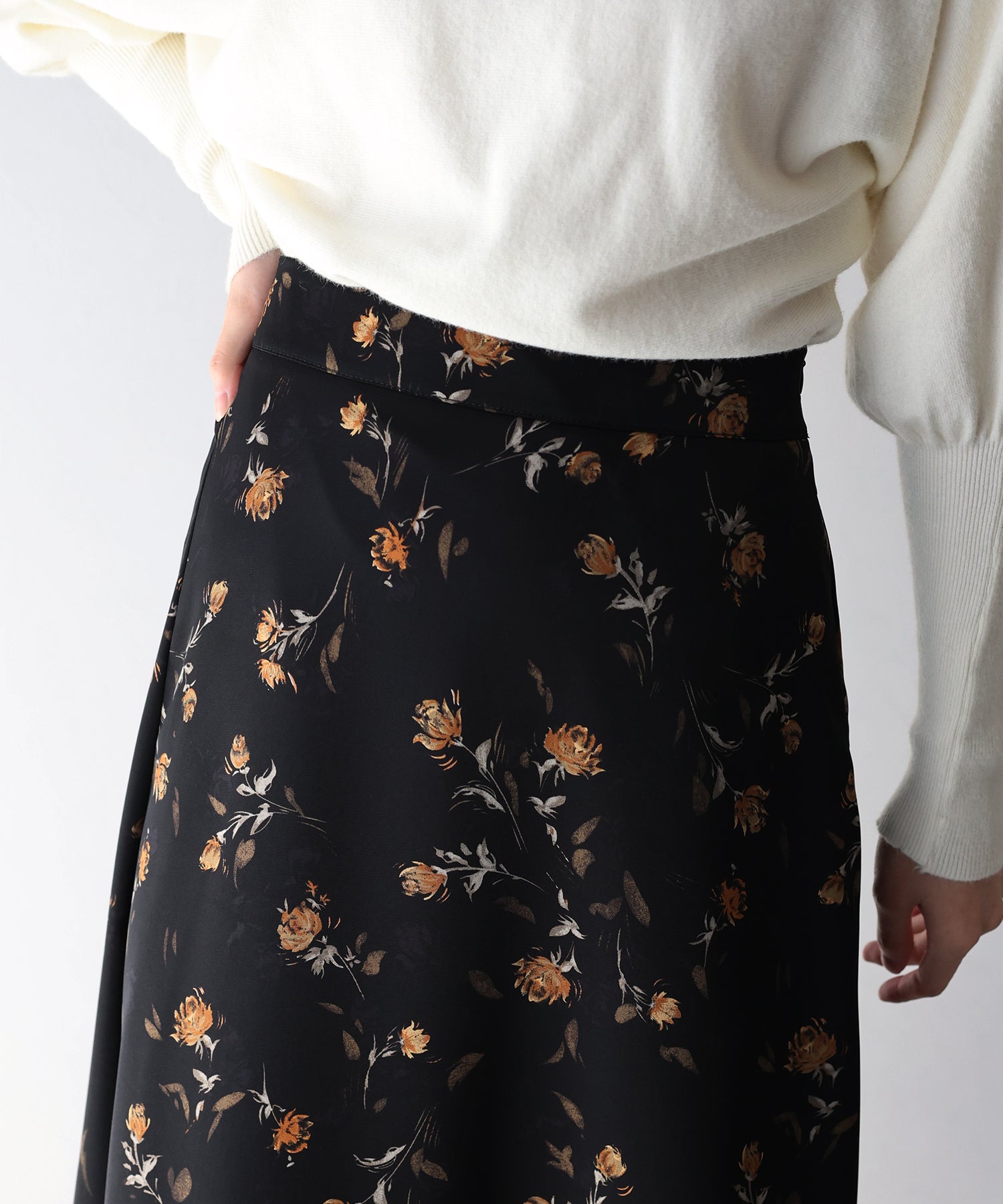 大人っぽいフラワープリントが魅力のサテンロングスカート。