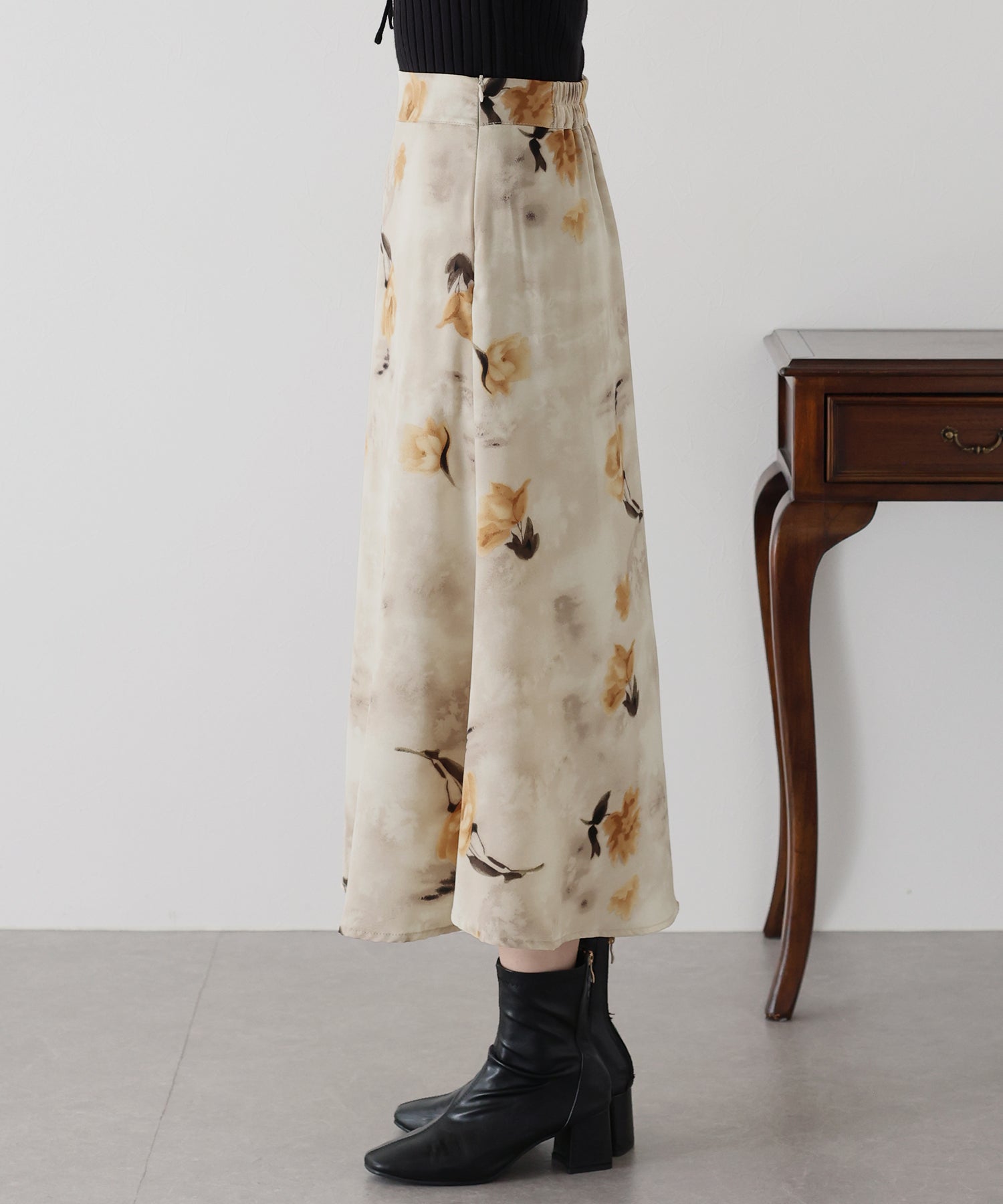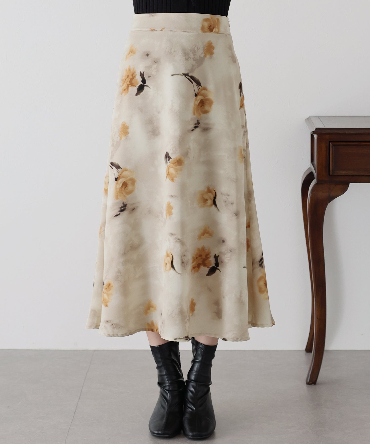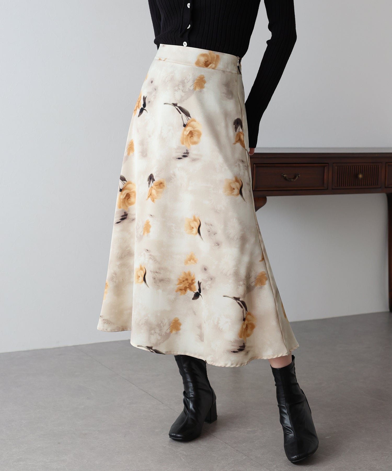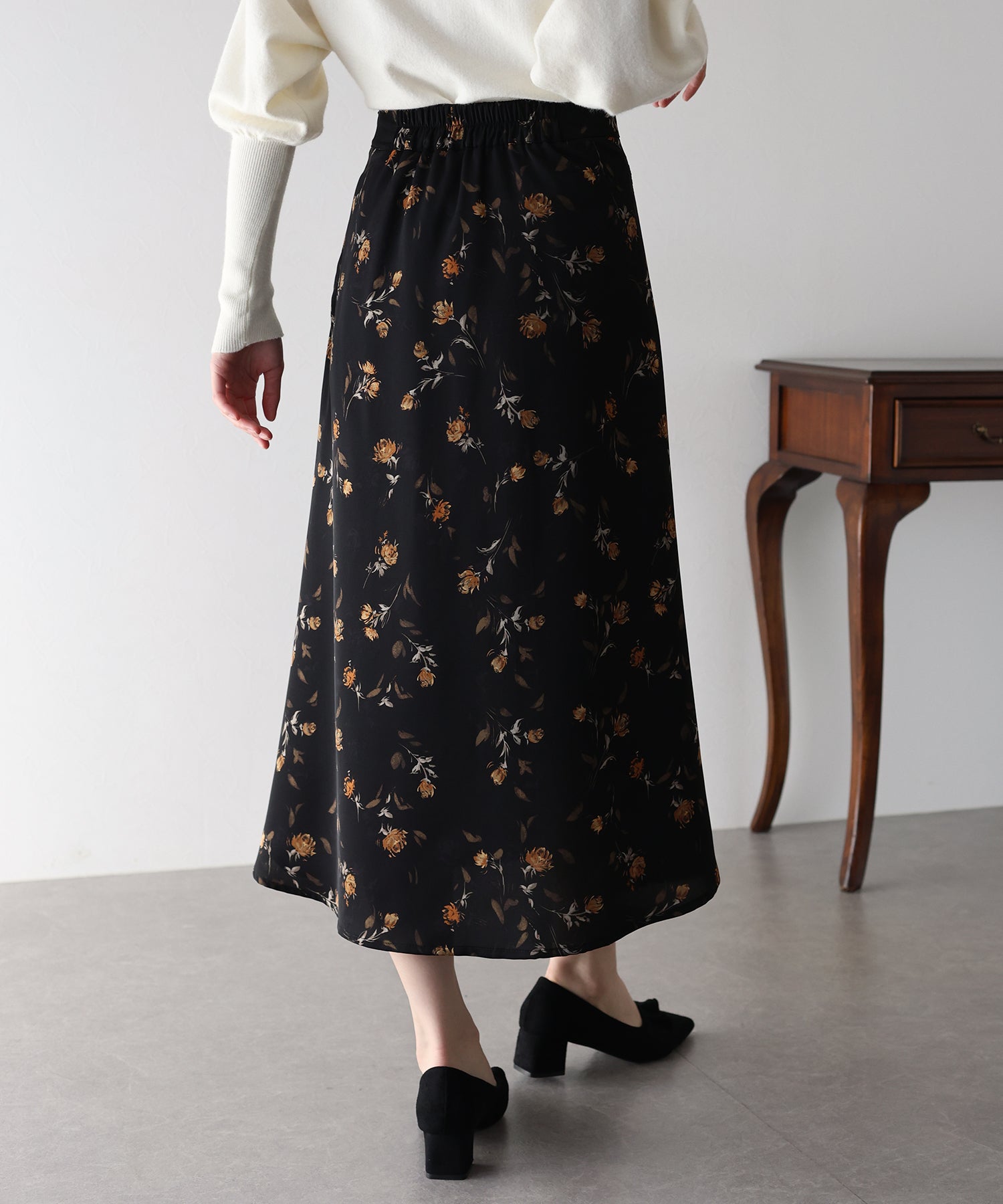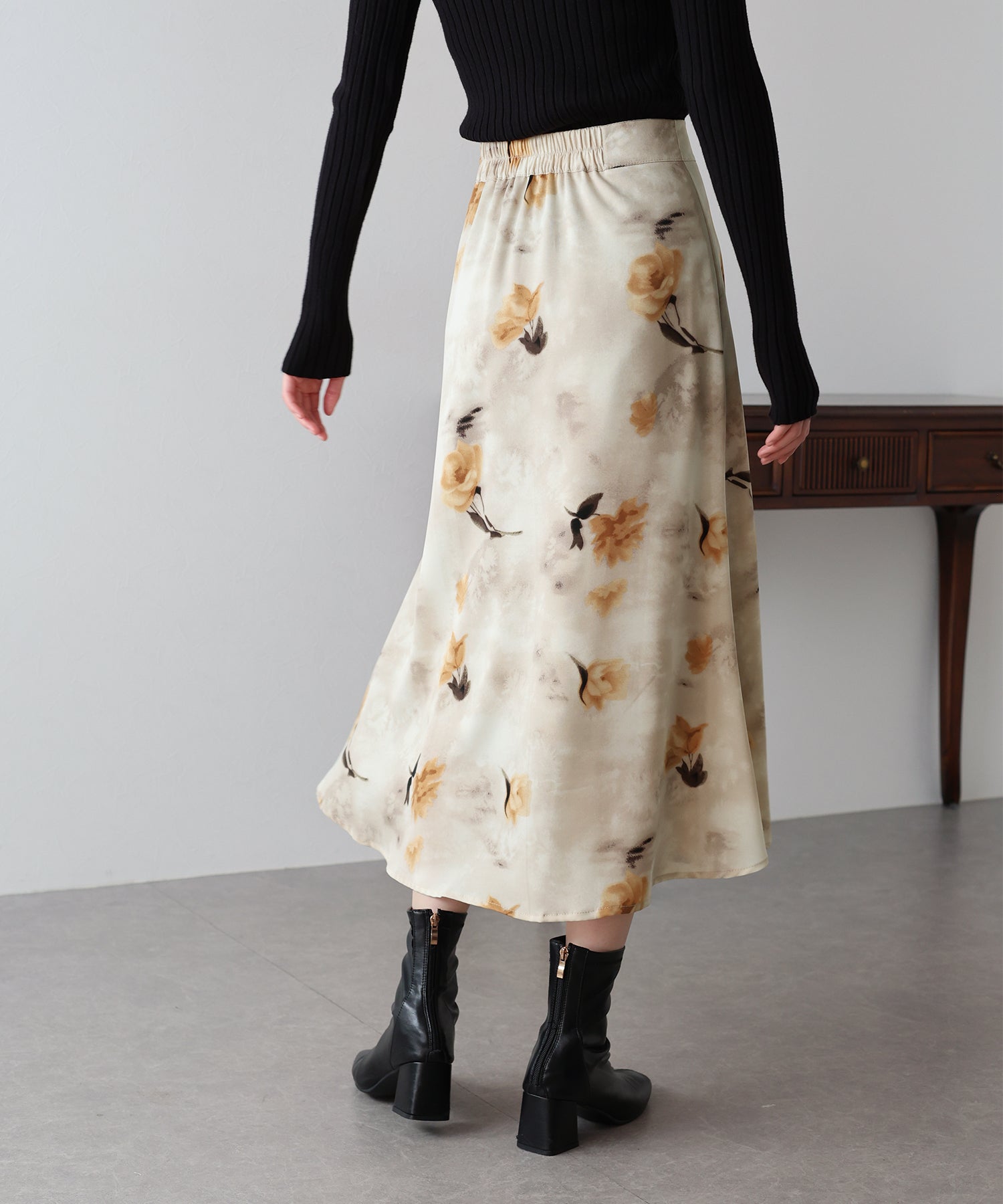 大人っぽいフラワープリントが魅力のサテンロングスカート。