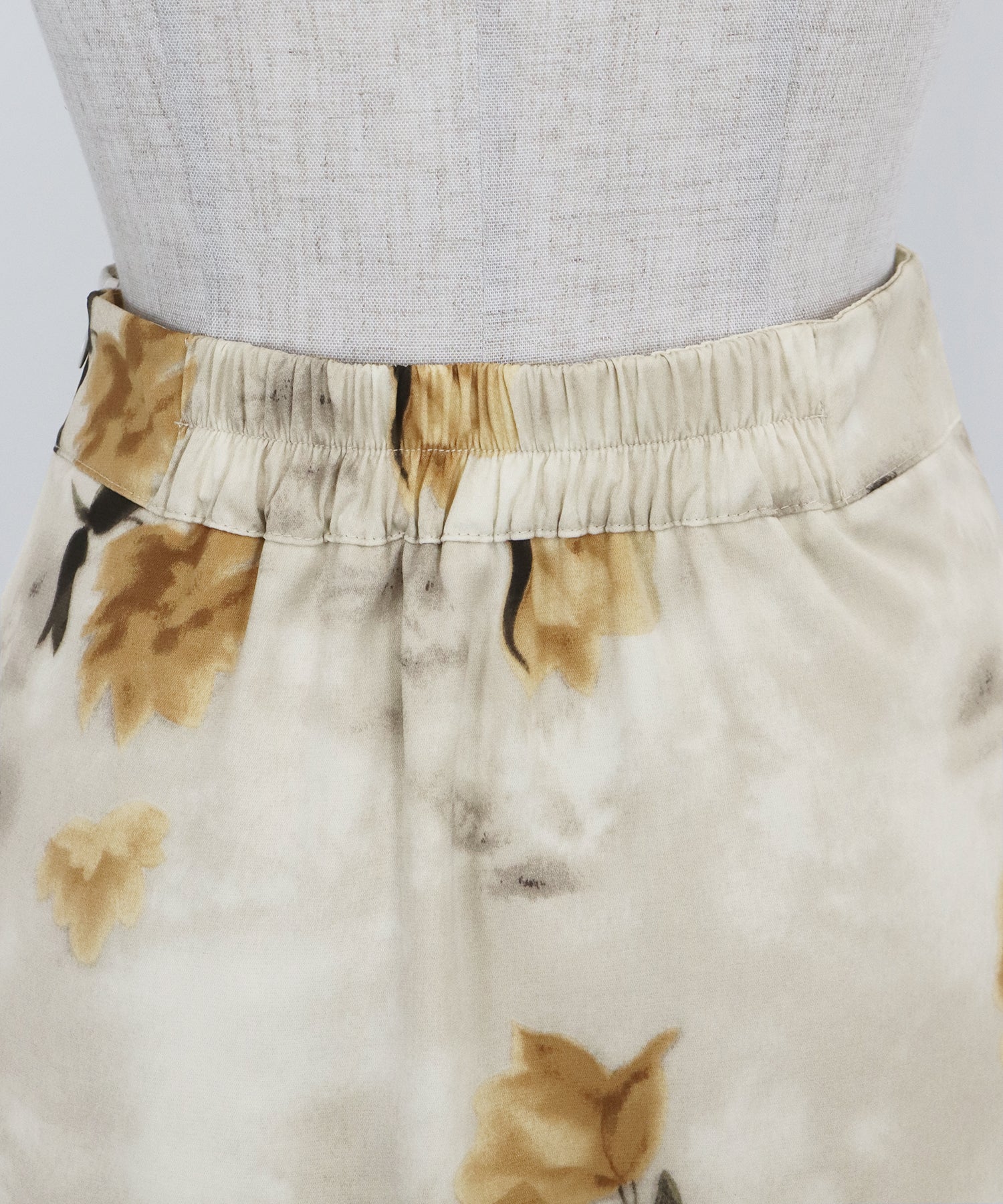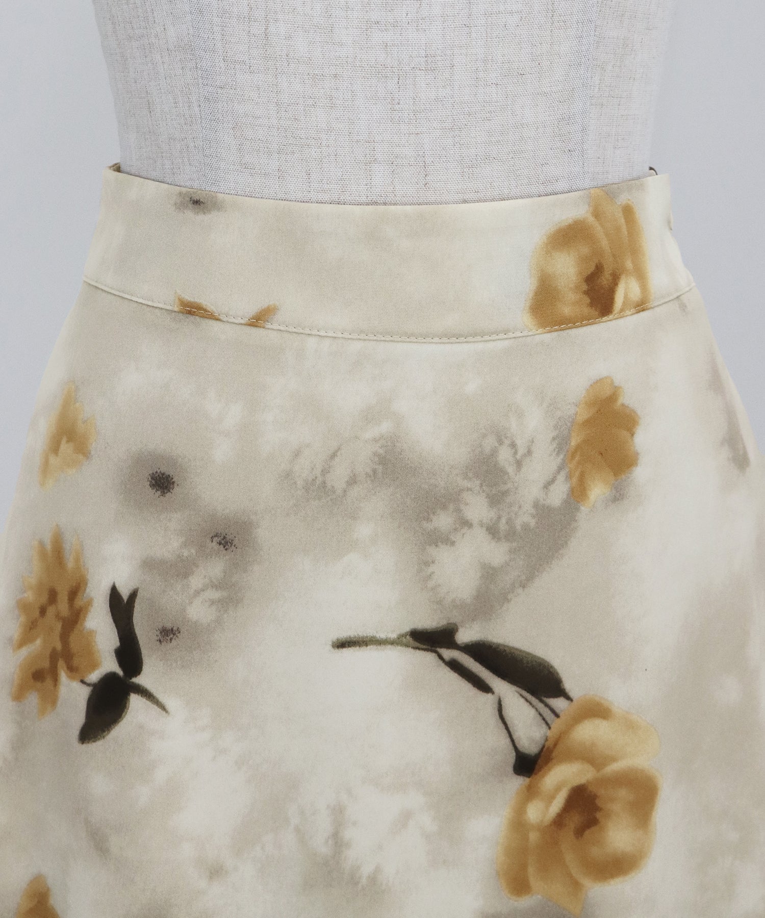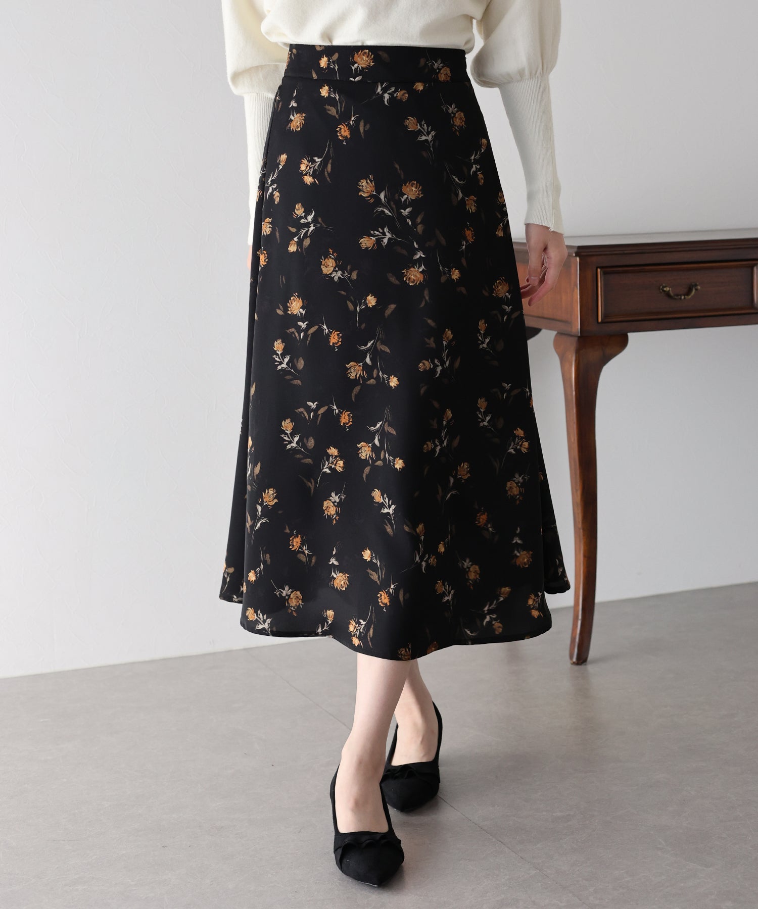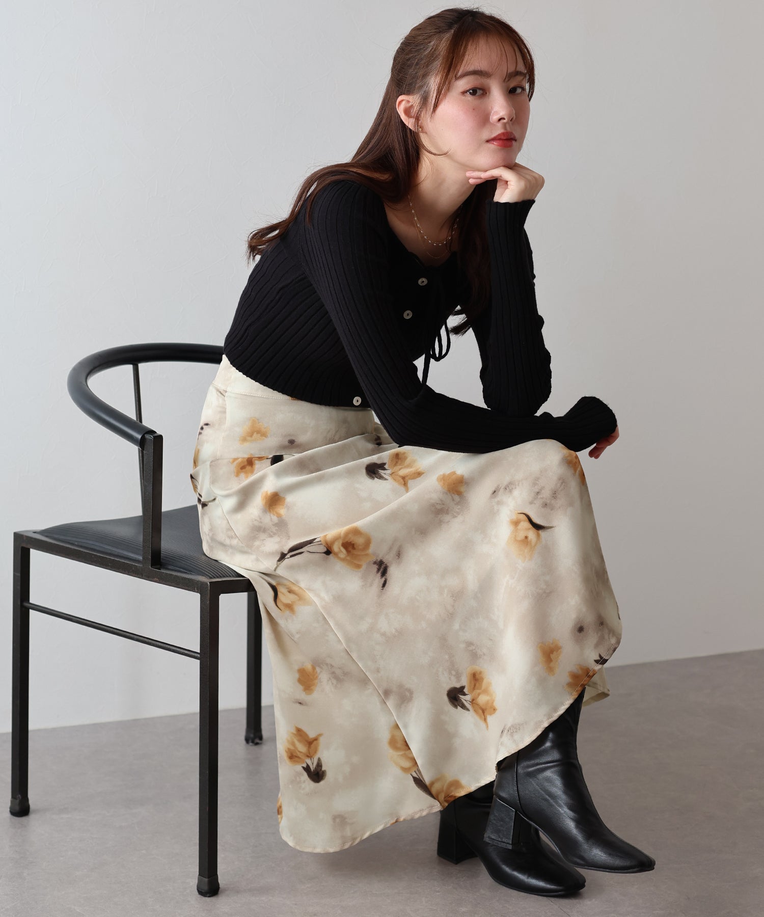 大人っぽいフラワープリントが魅力のサテンロングスカート。